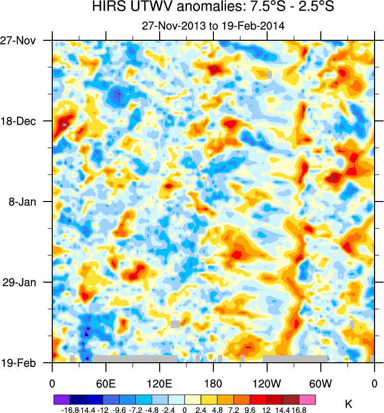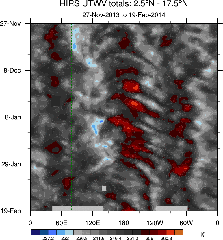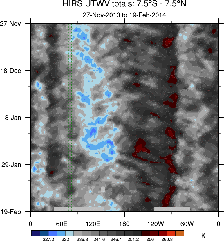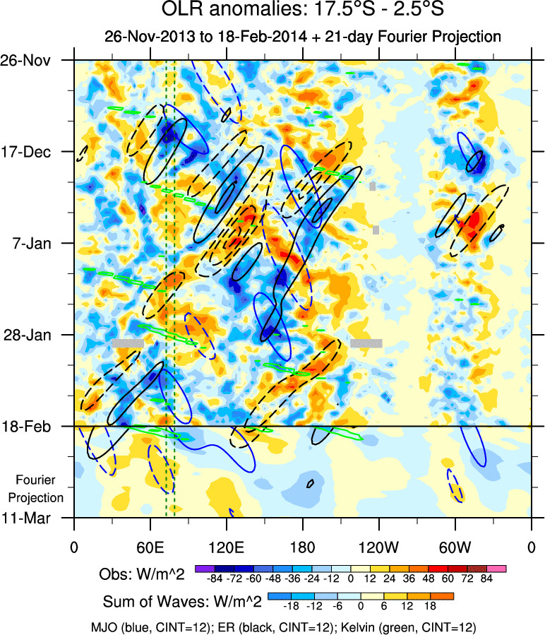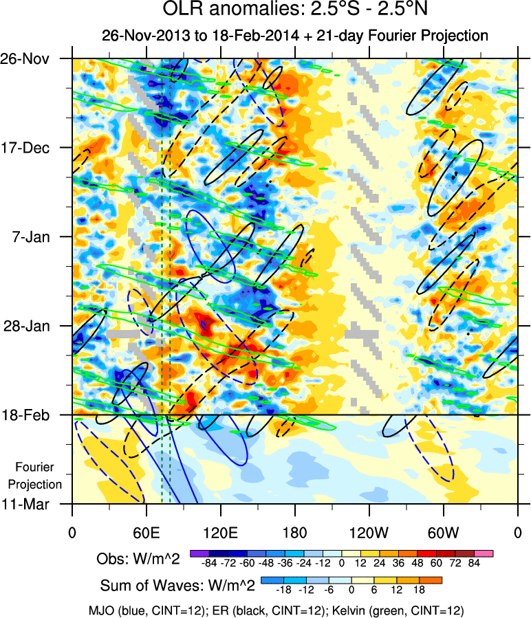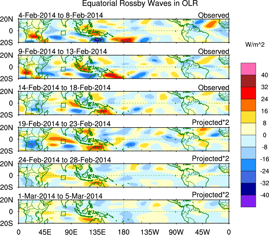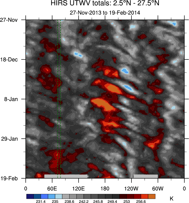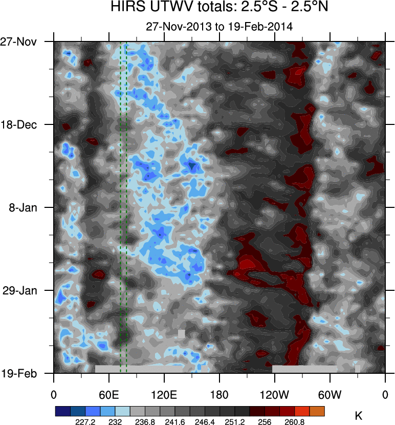 To identify tropical waves in near real-time, the OLR and UTWV data are filtered following Wheeler & Weickmann (2001 MWR). The daily anomalies are calculated using the first 3 harmonics of the seasonal cycle for 1979–2009. Missing values are then filled using linear interpolation in space and time. The most recent 365 days of anomalies are padded with 659 days of zeroes, and the result is filtered for each wave type.