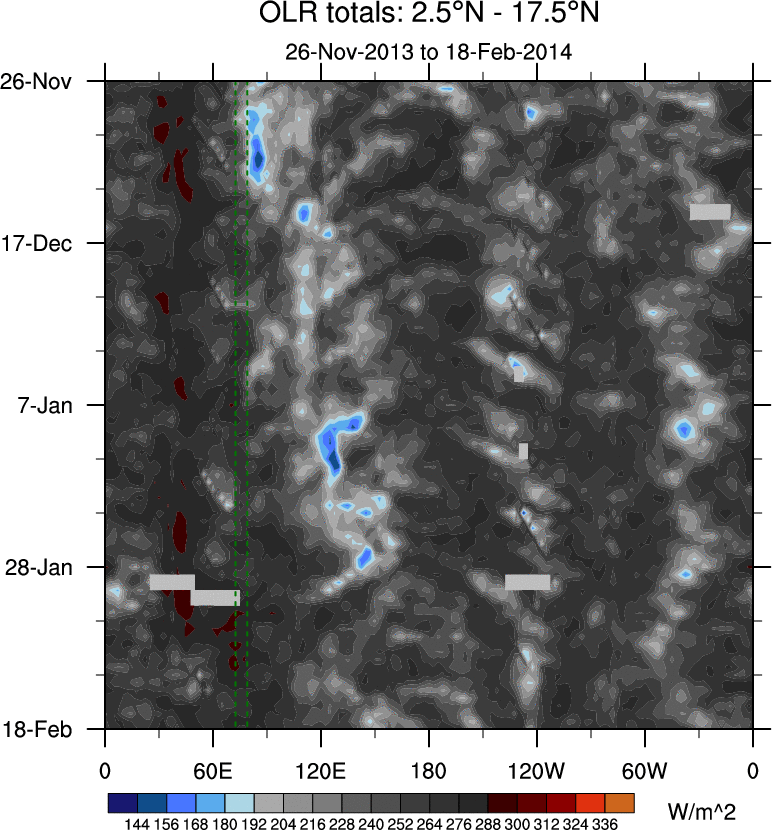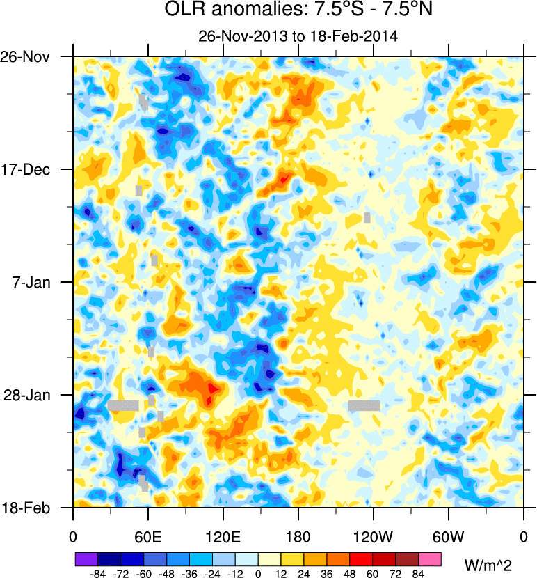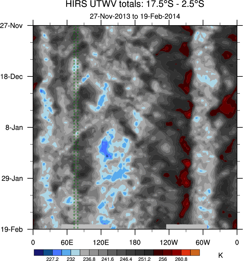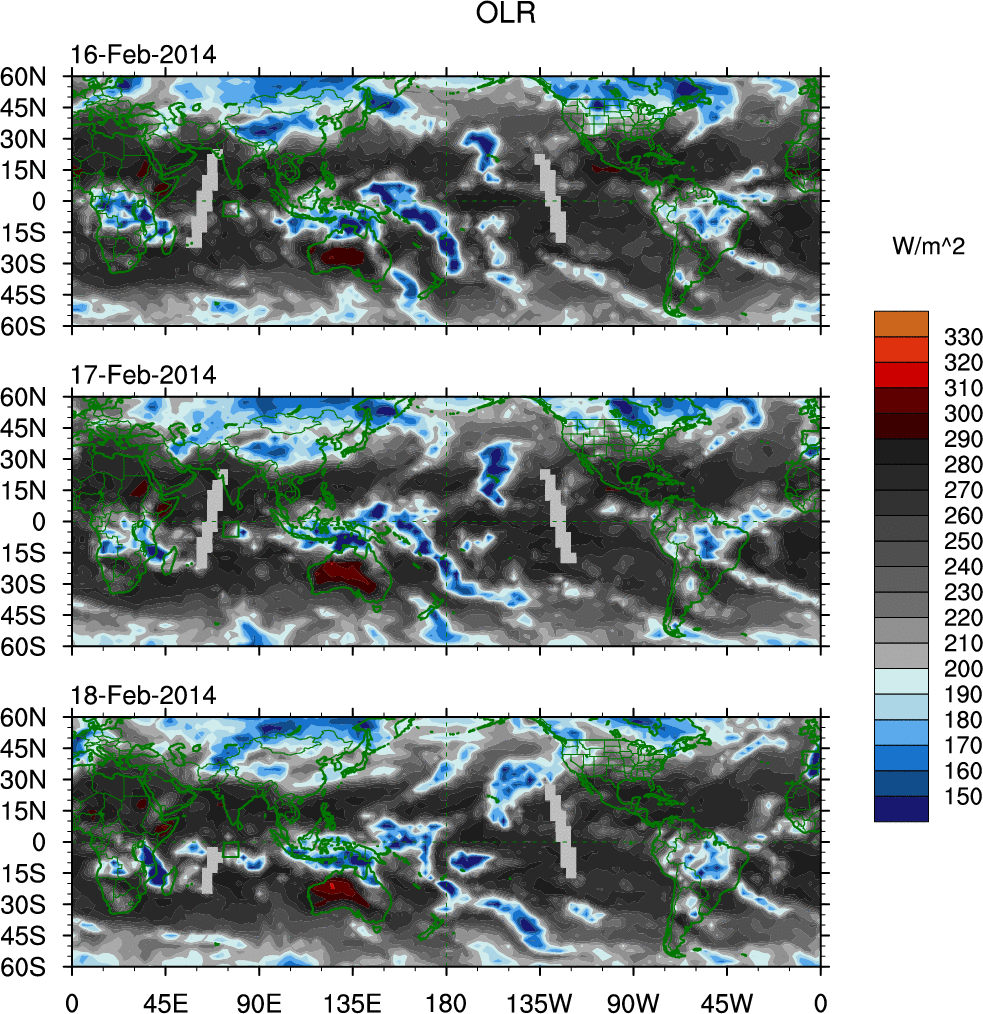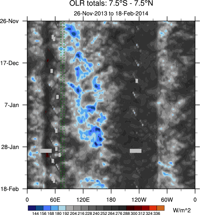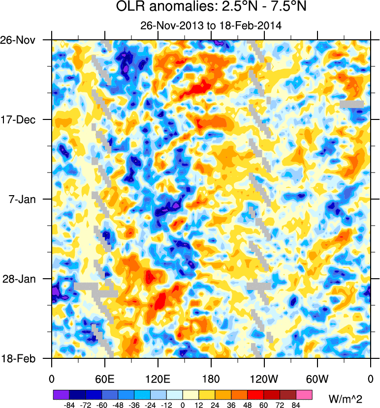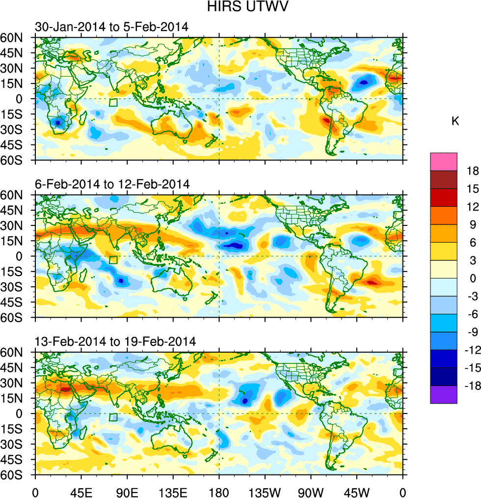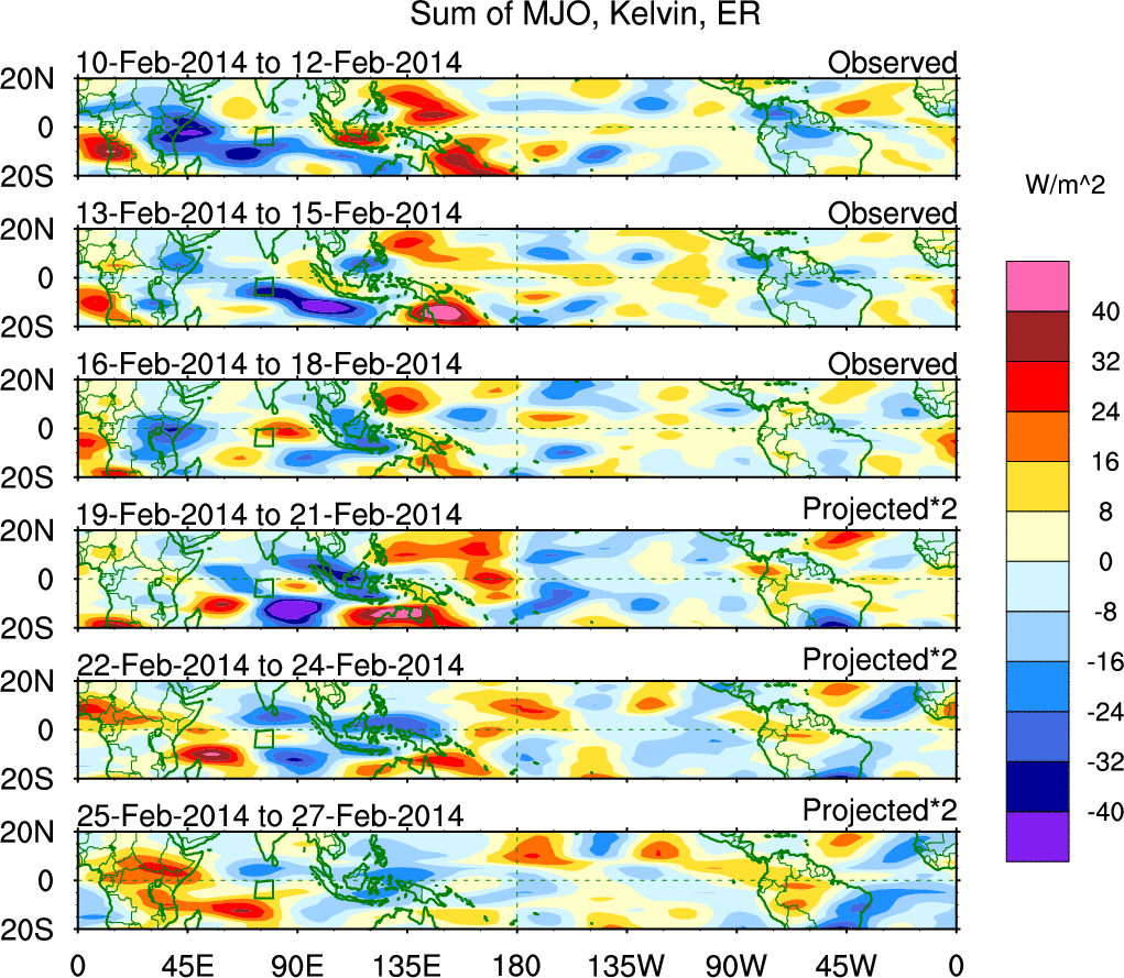 To identify tropical waves in near real-time, the OLR and UTWV data are filtered following Wheeler & Weickmann (2001 MWR). The daily anomalies are calculated using the first 3 harmonics of the seasonal cycle for 1979–2009. Missing values are then filled using linear interpolation in space and time. The most recent 365 days of anomalies are padded with 659 days of zeroes, and the result is filtered for each wave type.