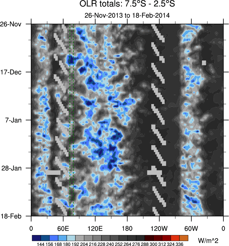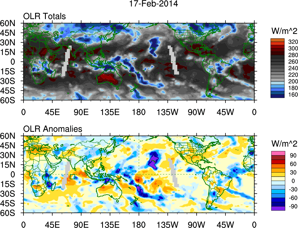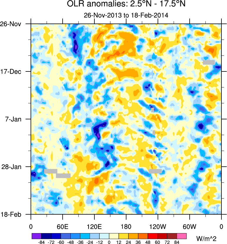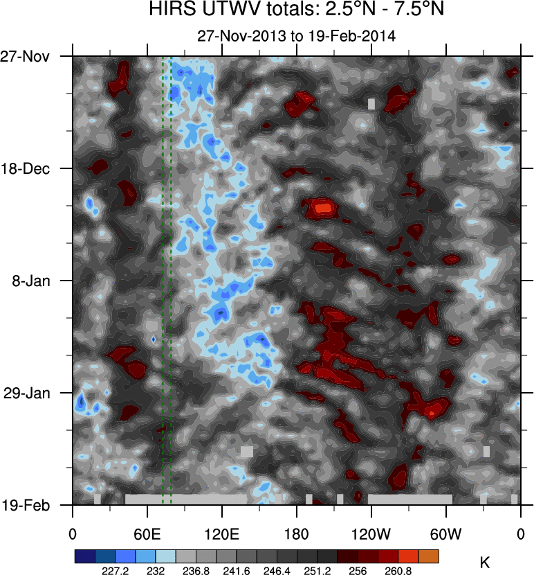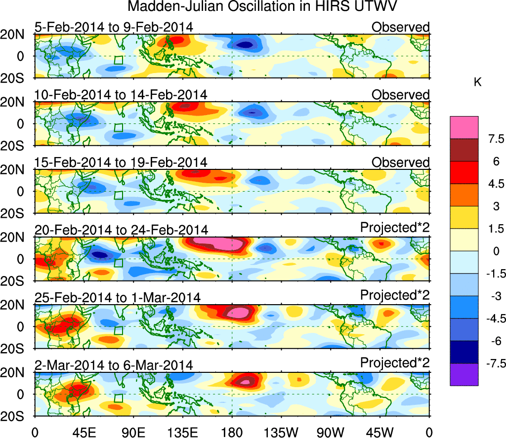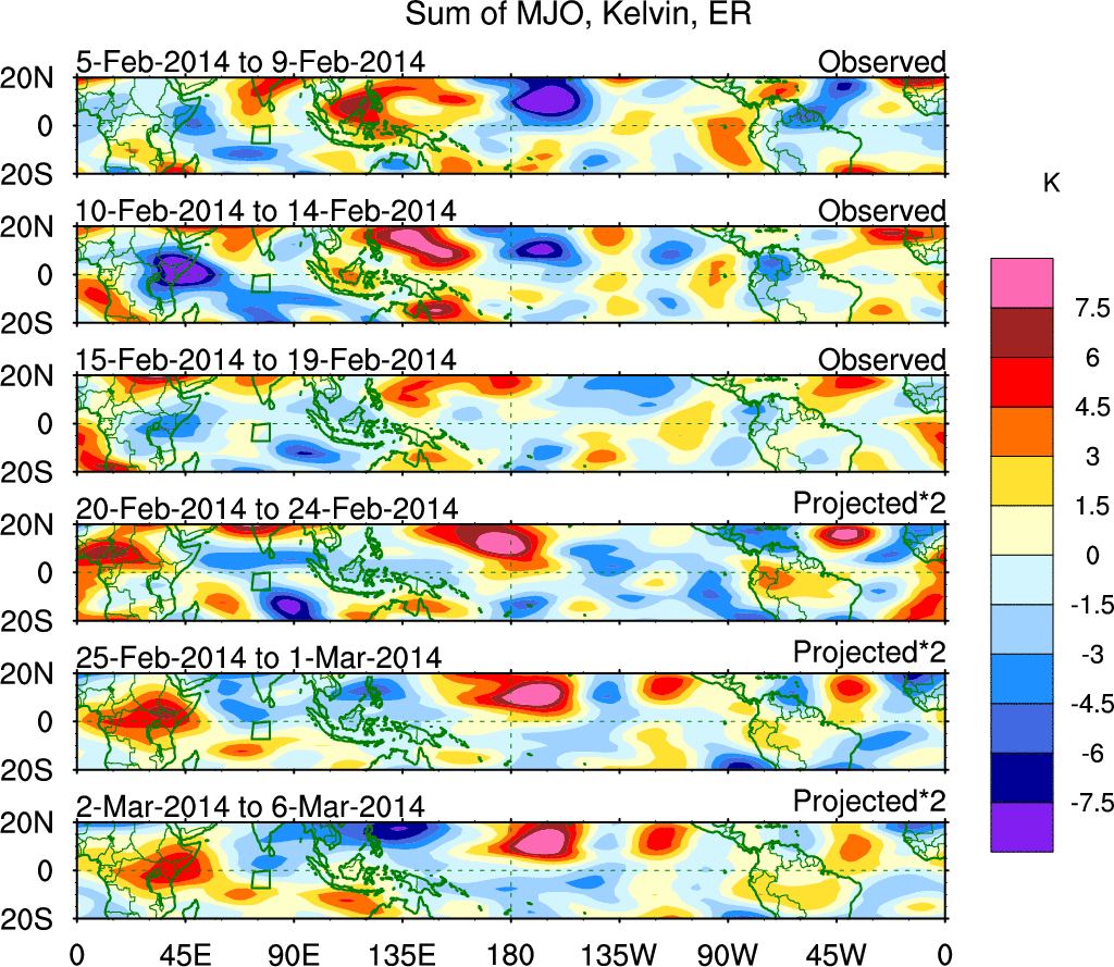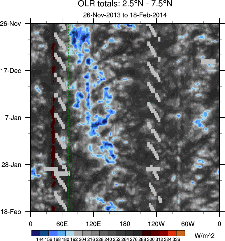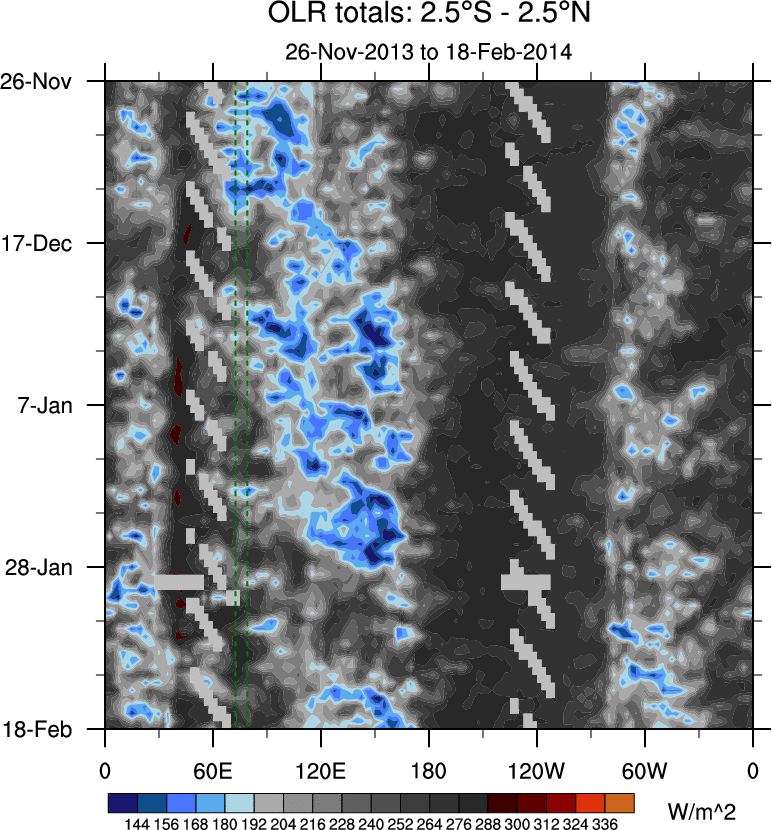 To identify tropical waves in near real-time, the OLR and UTWV data are filtered following Wheeler & Weickmann (2001 MWR). The daily anomalies are calculated using the first 3 harmonics of the seasonal cycle for 1979–2009. Missing values are then filled using linear interpolation in space and time. The most recent 365 days of anomalies are padded with 659 days of zeroes, and the result is filtered for each wave type.