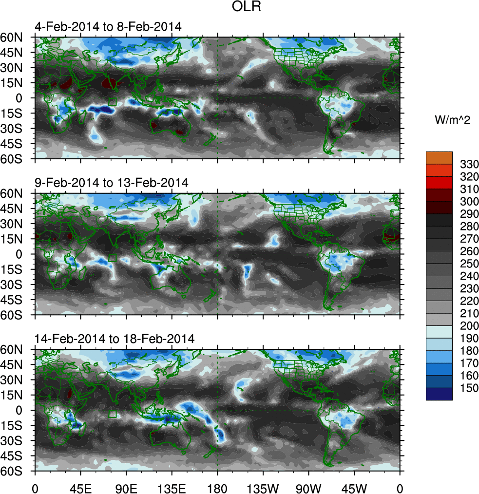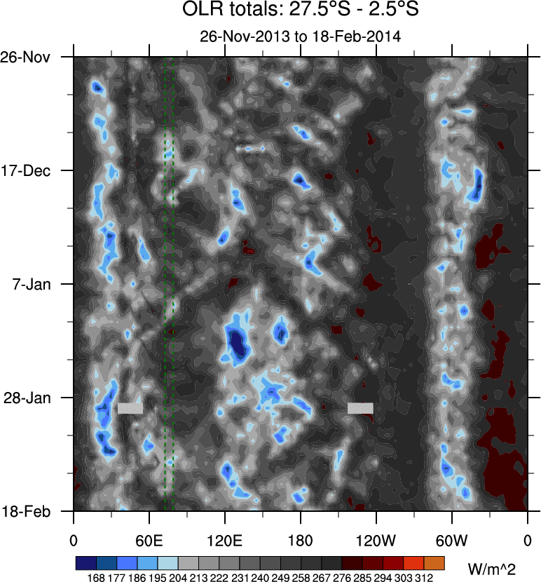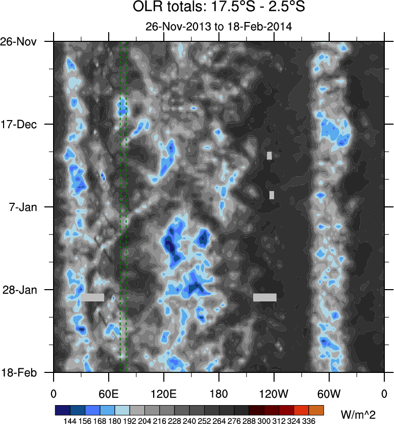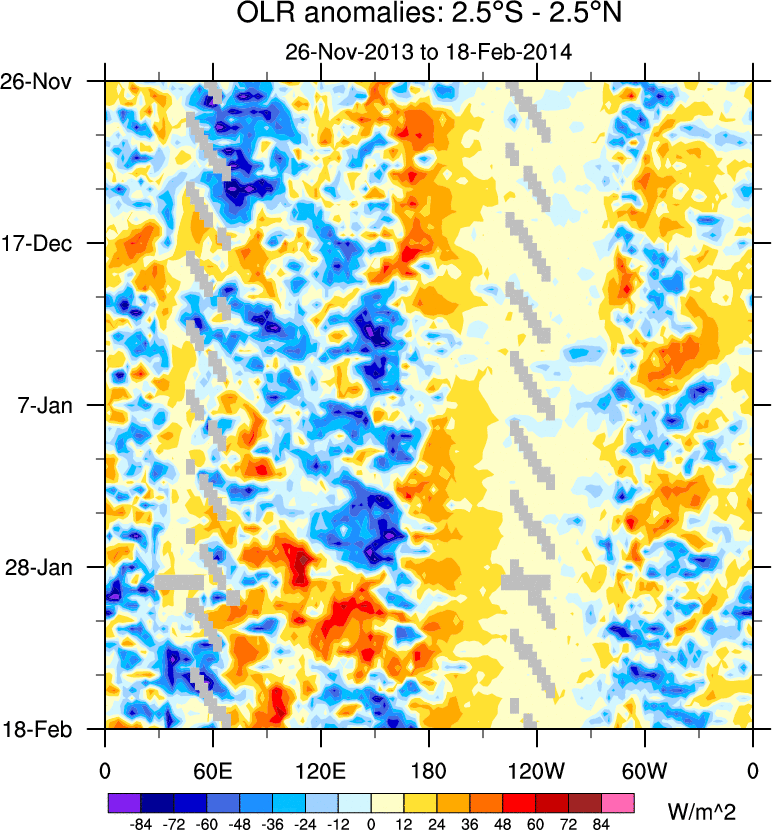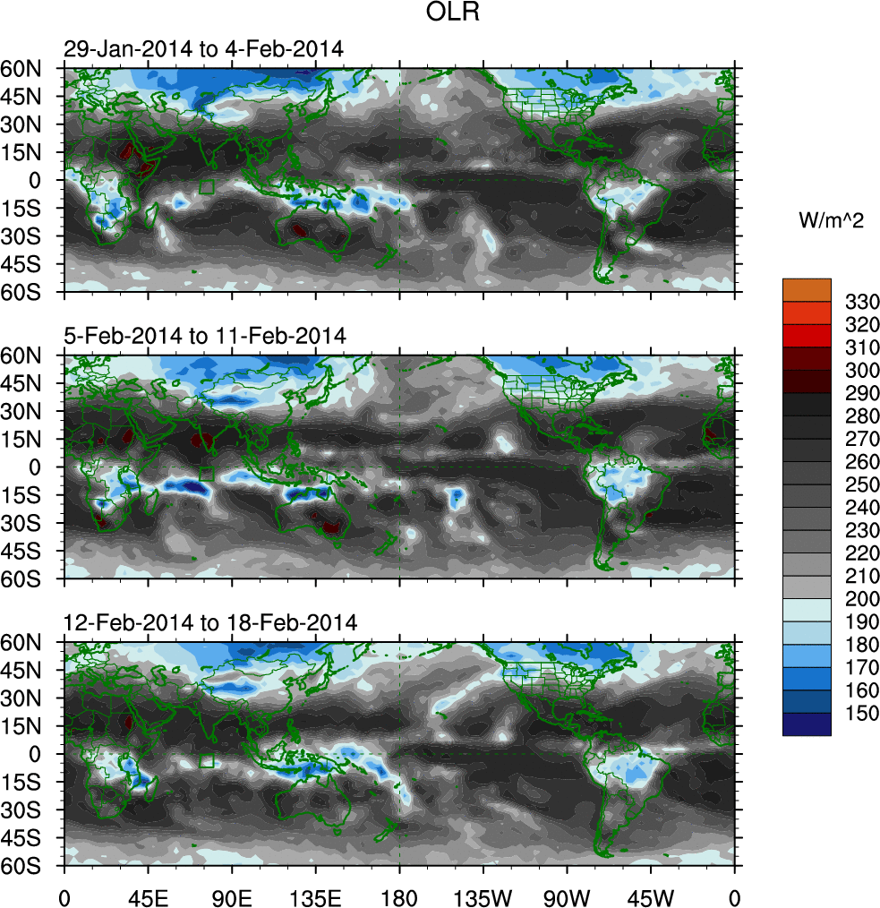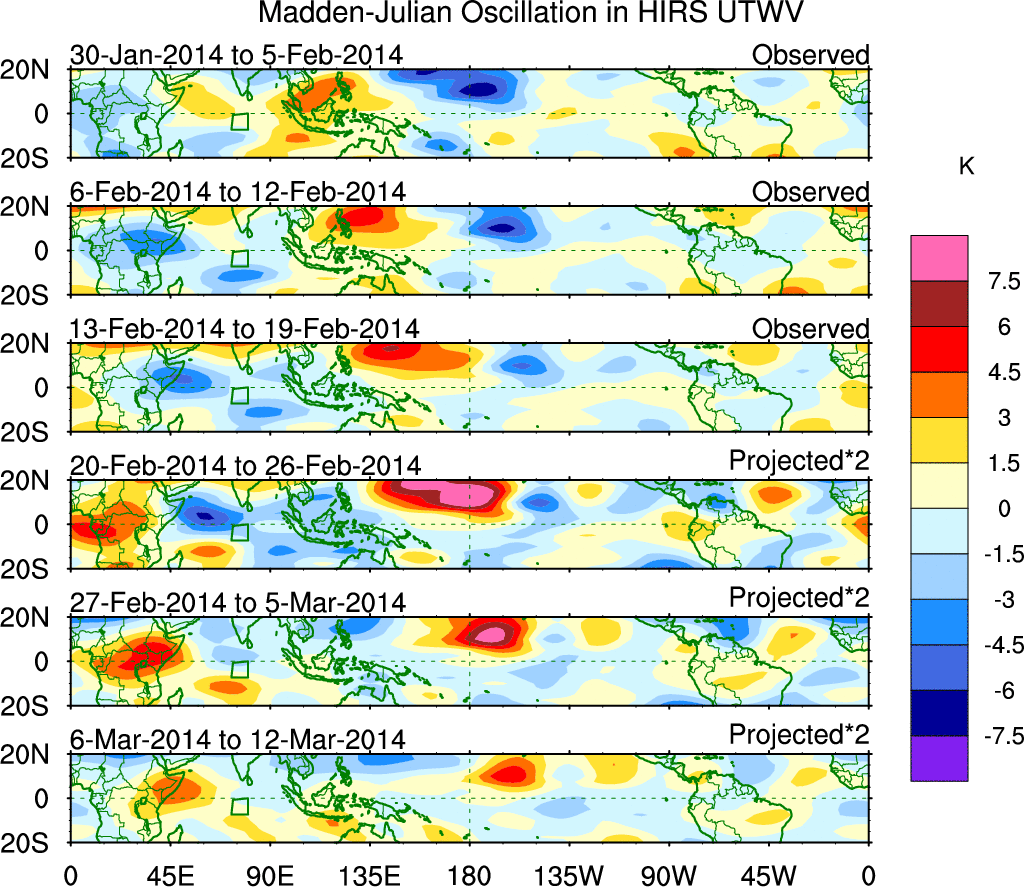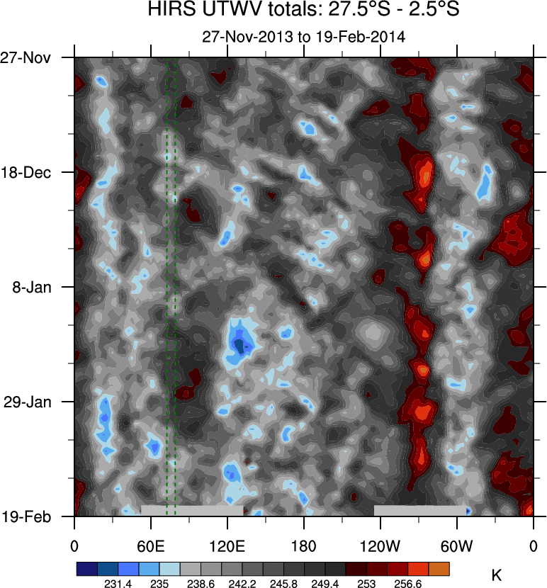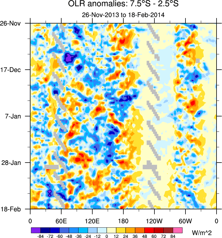 To identify tropical waves in near real-time, the OLR and UTWV data are filtered following Wheeler & Weickmann (2001 MWR). The daily anomalies are calculated using the first 3 harmonics of the seasonal cycle for 1979–2009. Missing values are then filled using linear interpolation in space and time. The most recent 365 days of anomalies are padded with 659 days of zeroes, and the result is filtered for each wave type.
