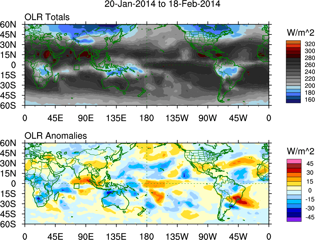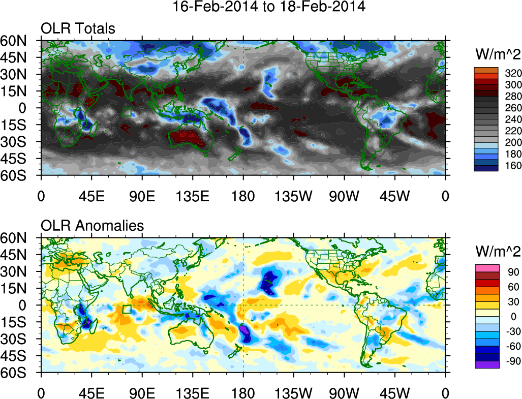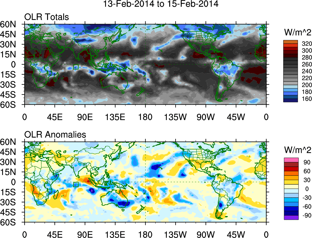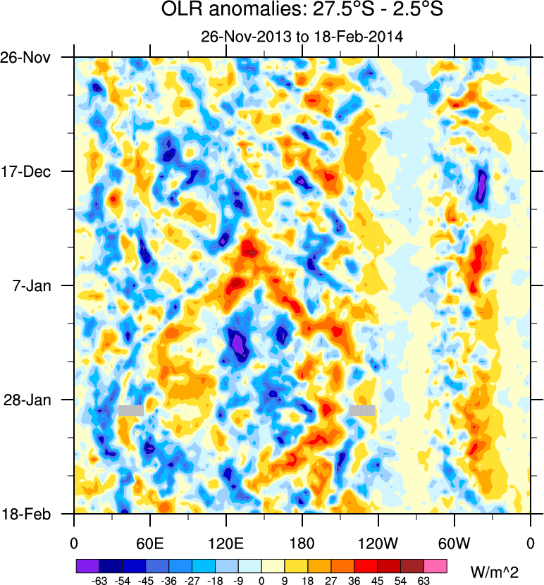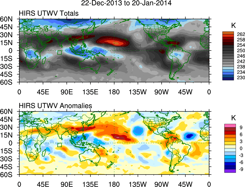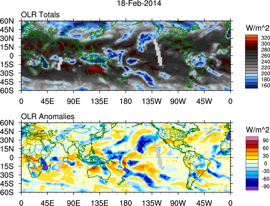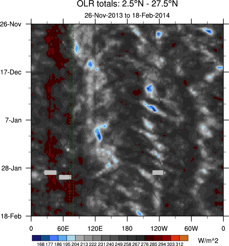 To identify tropical waves in near real-time, the OLR and UTWV data are filtered following Wheeler & Weickmann (2001 MWR). The daily anomalies are calculated using the first 3 harmonics of the seasonal cycle for 1979–2009. Missing values are then filled using linear interpolation in space and time. The most recent 365 days of anomalies are padded with 659 days of zeroes, and the result is filtered for each wave type.