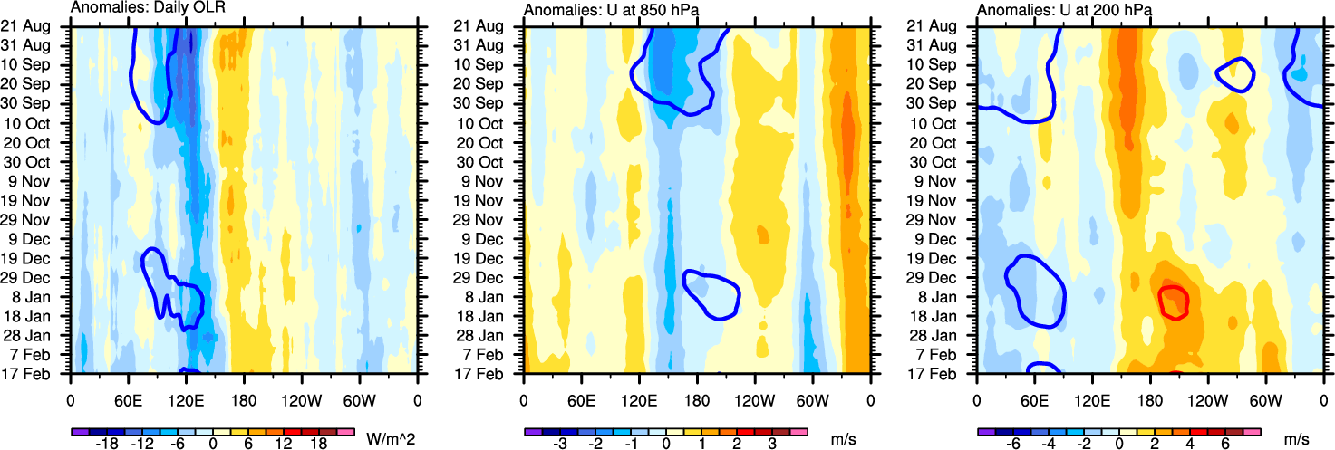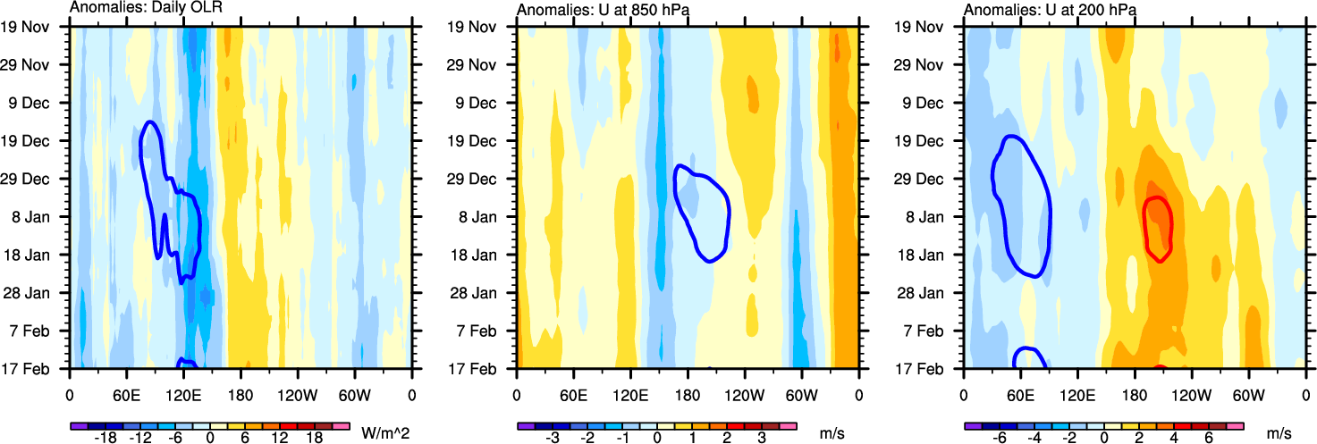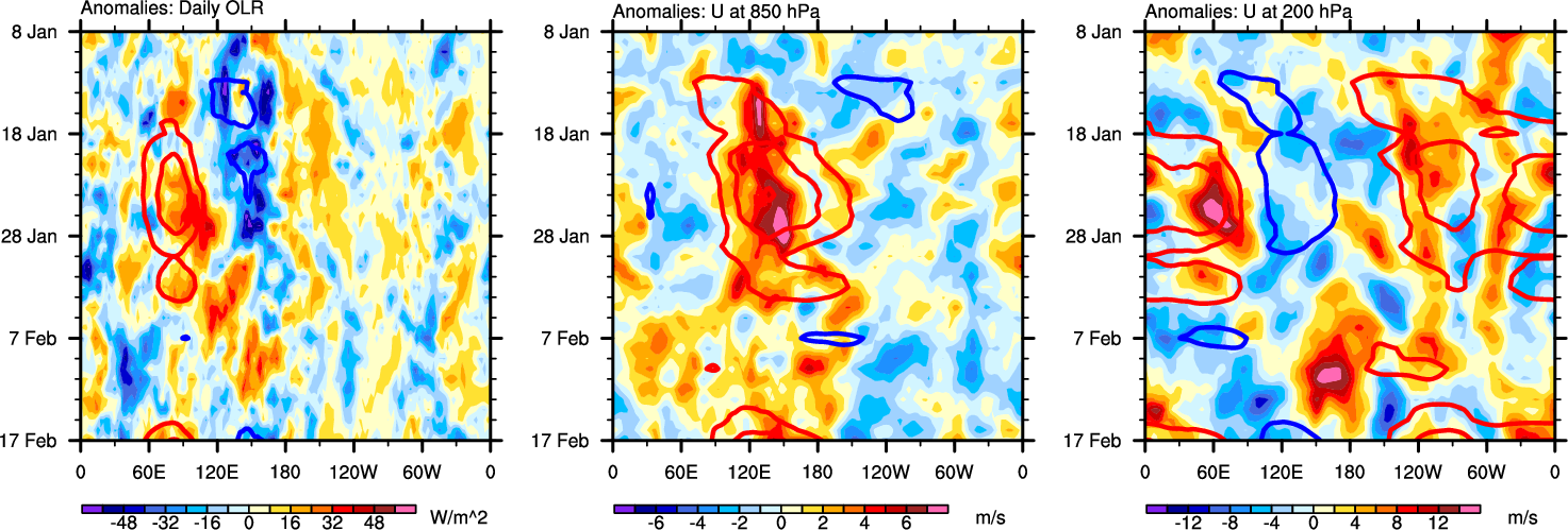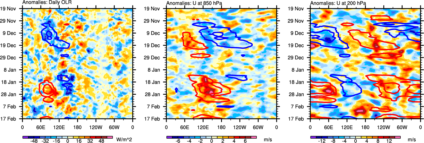 The Hovmollers show longitude-time plots for OLR, U-850, and U-200. The shading indicates the observed anomalies, while the contours are the projection of those anomalies onto the RMM EOFs.