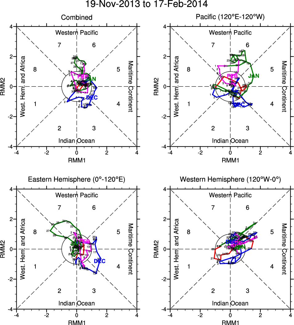 Wheeler and Hendon (2004) constructed the RMM index for monitoring the MJO. This index consists of the first two principal components (PCs) of OLR, 850-hPa zonal wind, and 200-hPa zonal wind averaged 15S-15N.