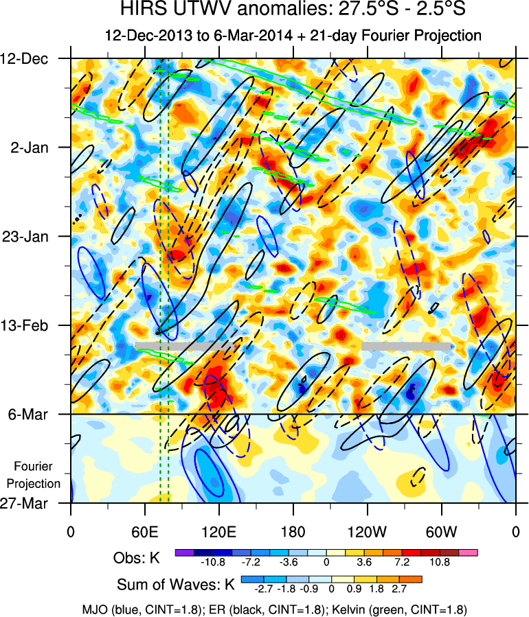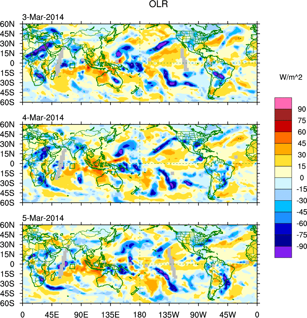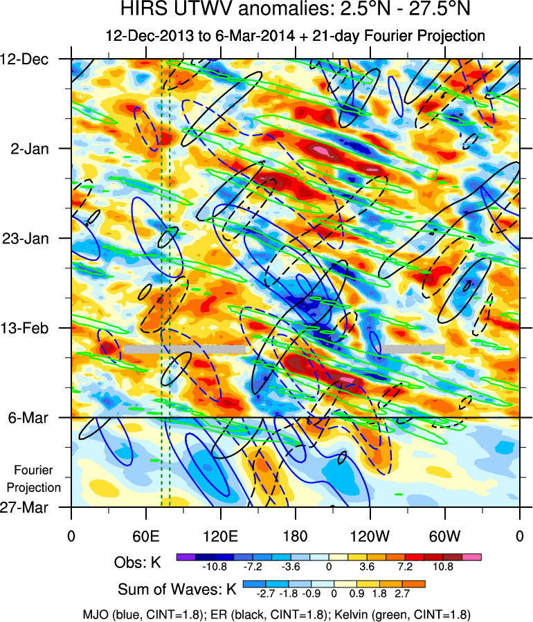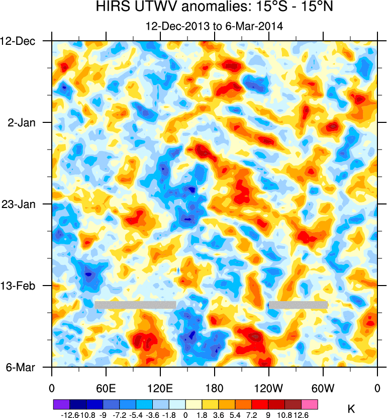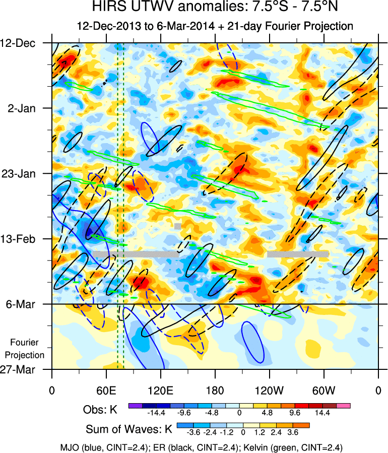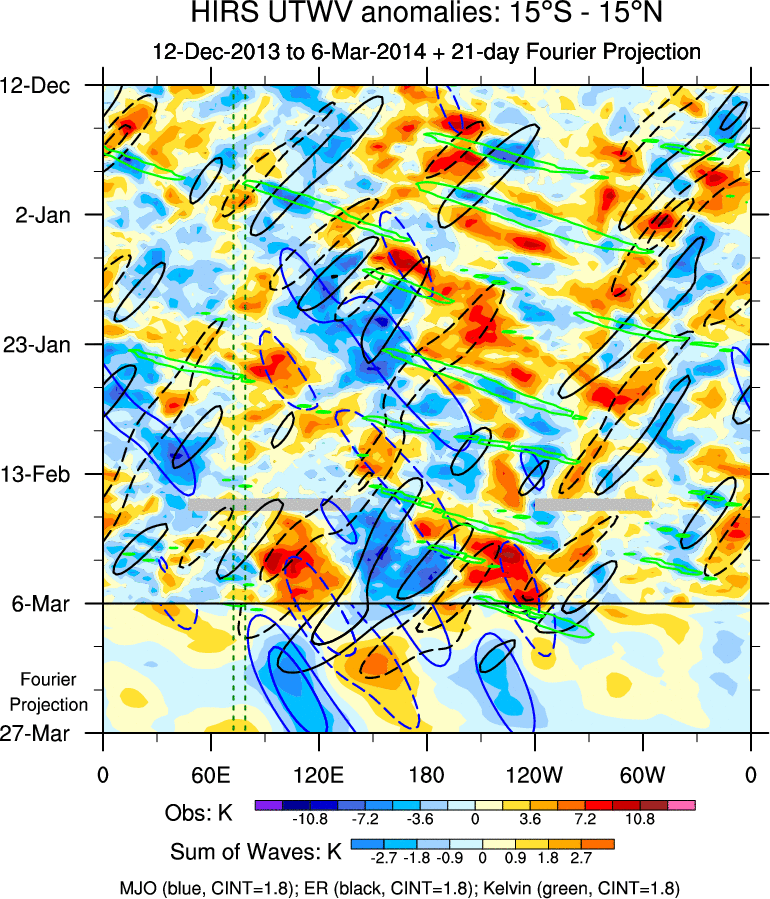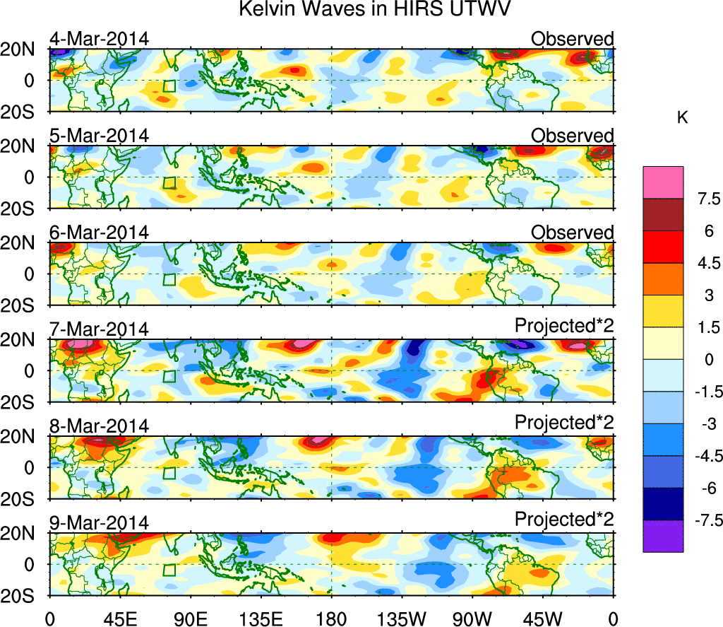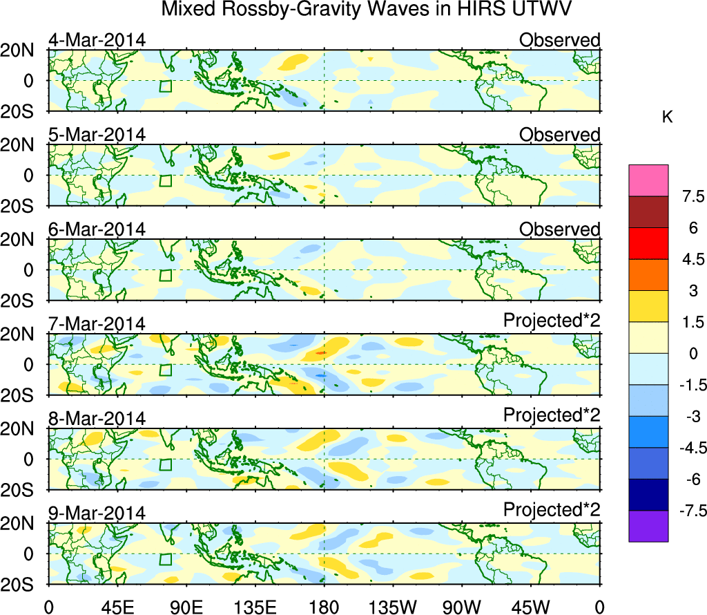 To identify tropical waves in near real-time, the OLR and UTWV data are filtered following Wheeler & Weickmann (2001 MWR). The daily anomalies are calculated using the first 3 harmonics of the seasonal cycle for 1979–2009. Missing values are then filled using linear interpolation in space and time. The most recent 365 days of anomalies are padded with 659 days of zeroes, and the result is filtered for each wave type.