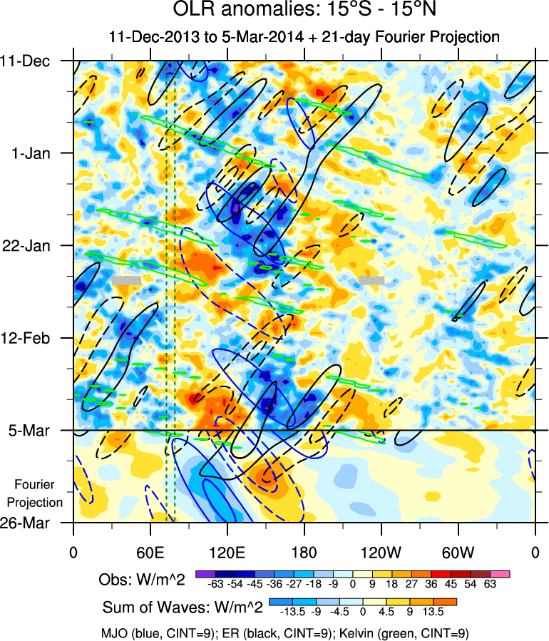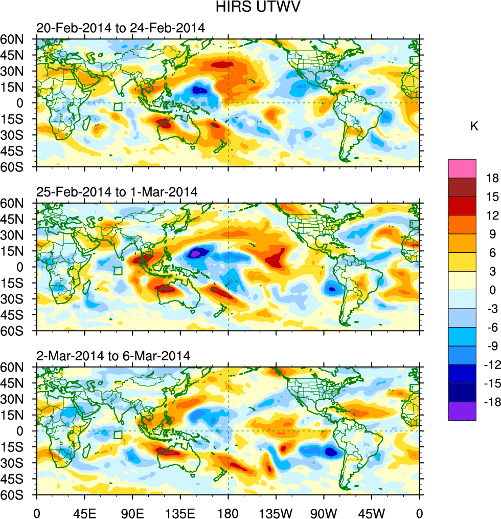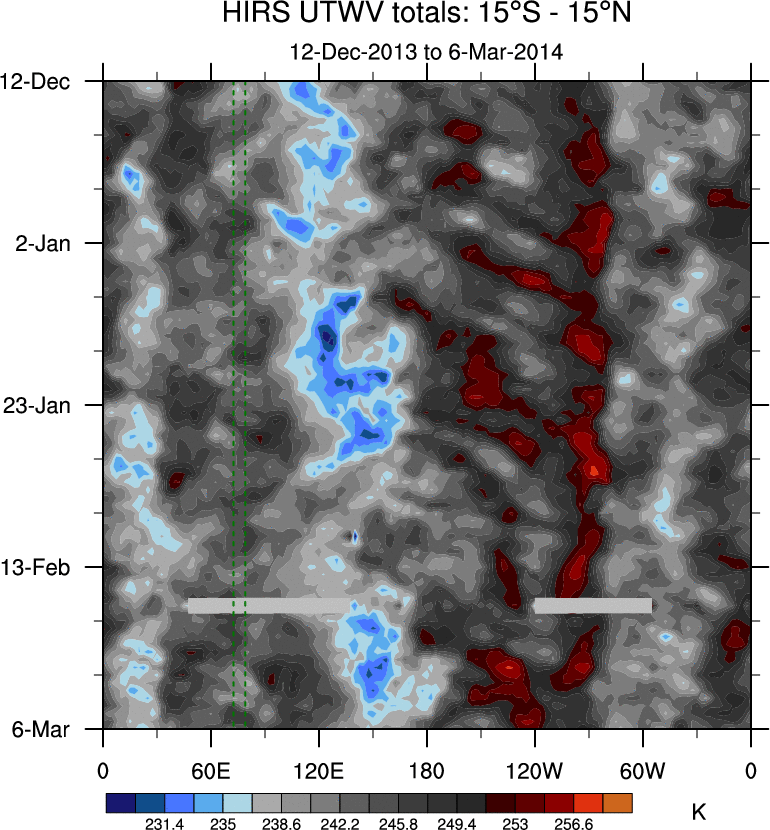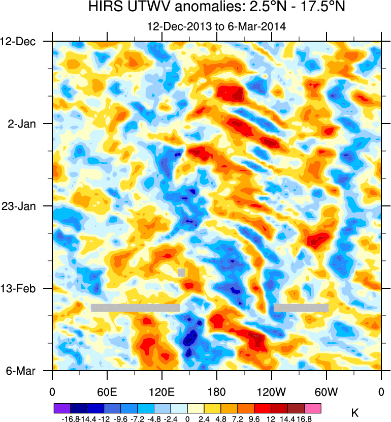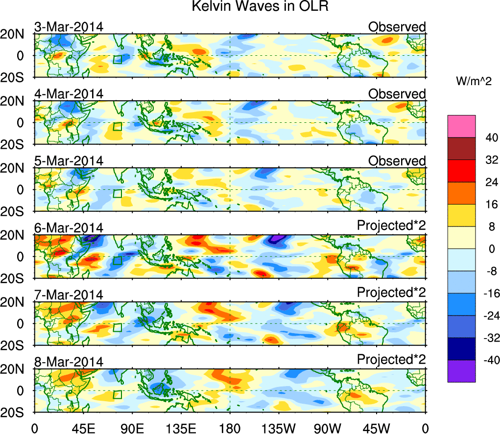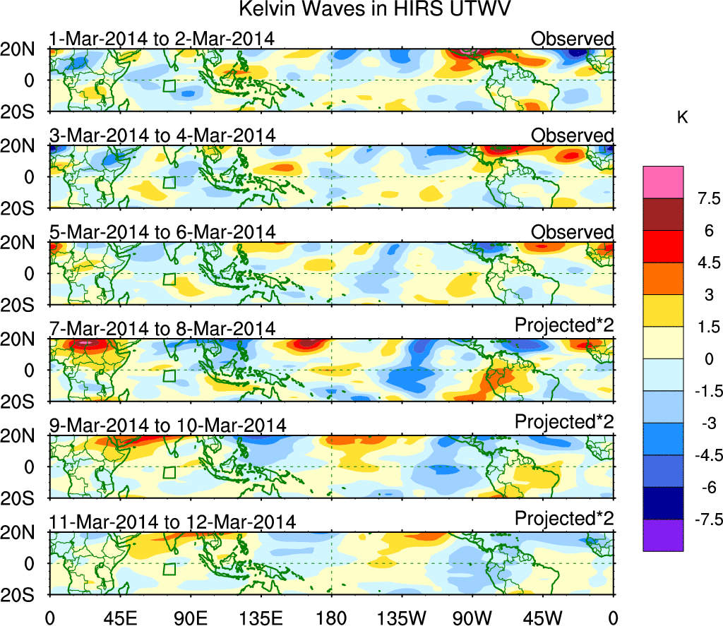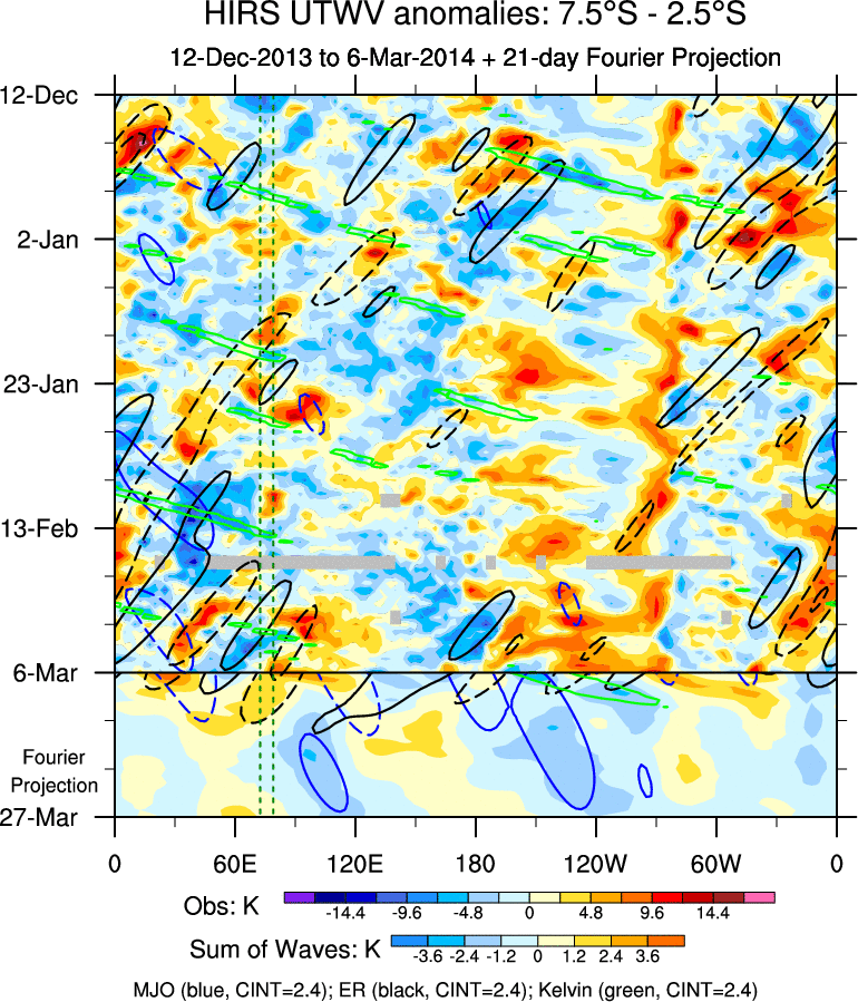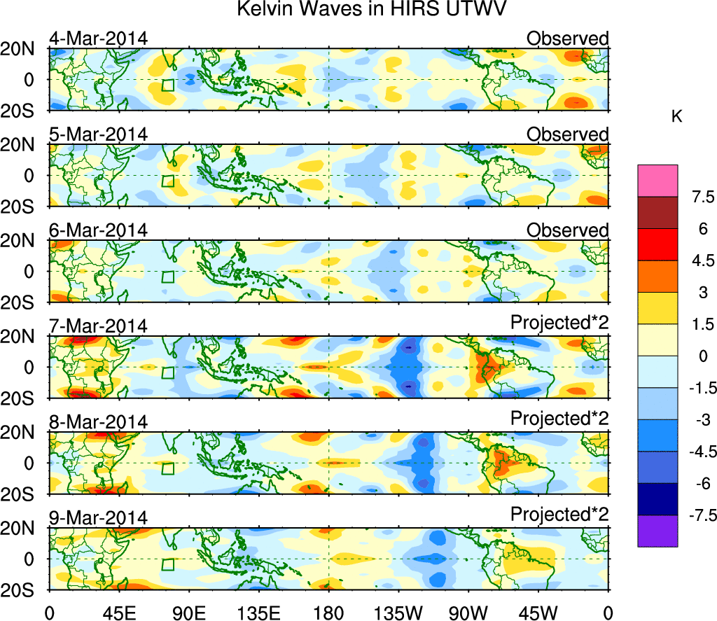 To identify tropical waves in near real-time, the OLR and UTWV data are filtered following Wheeler & Weickmann (2001 MWR). The daily anomalies are calculated using the first 3 harmonics of the seasonal cycle for 1979–2009. Missing values are then filled using linear interpolation in space and time. The most recent 365 days of anomalies are padded with 659 days of zeroes, and the result is filtered for each wave type.