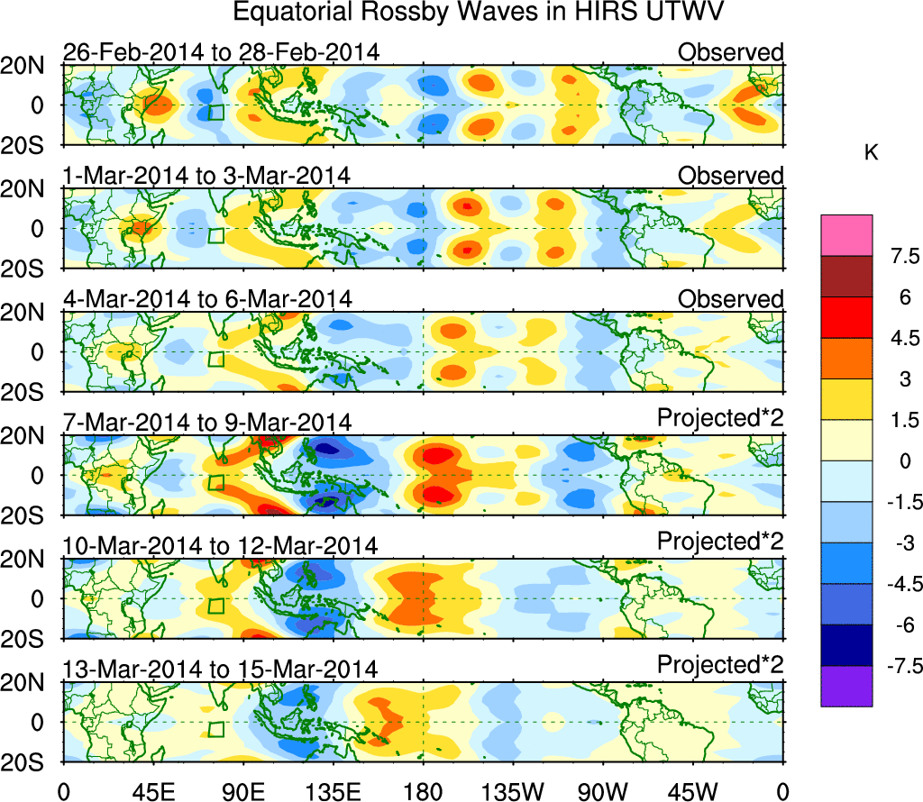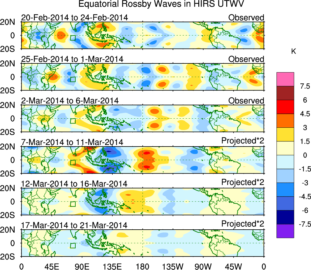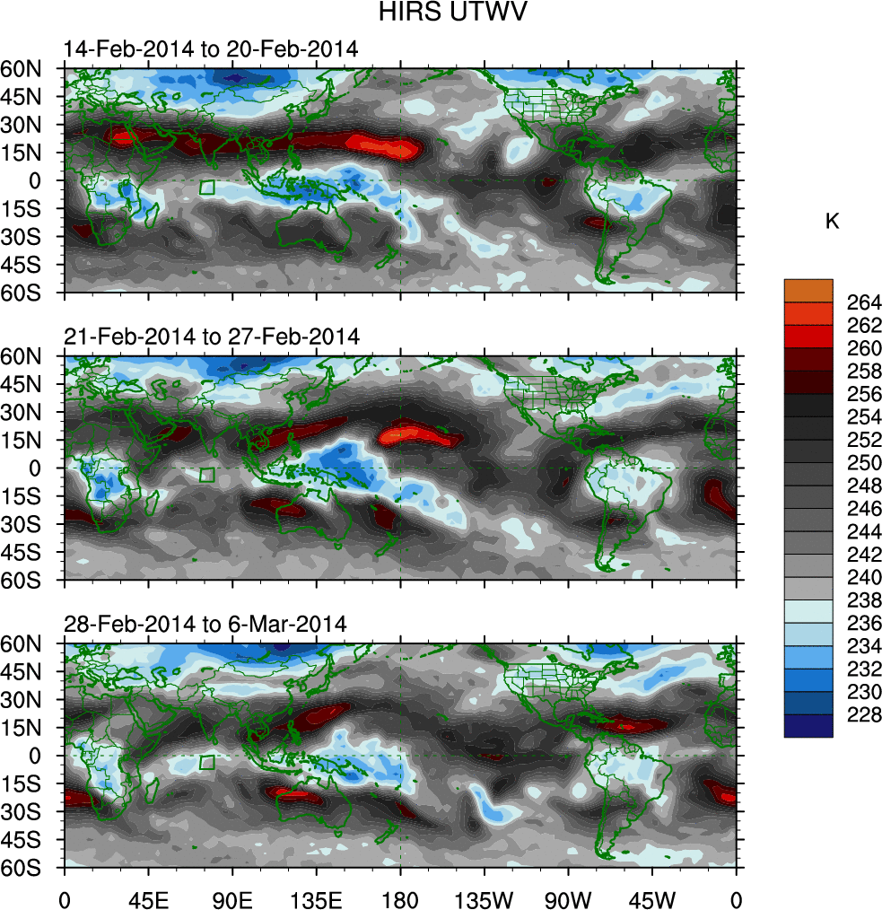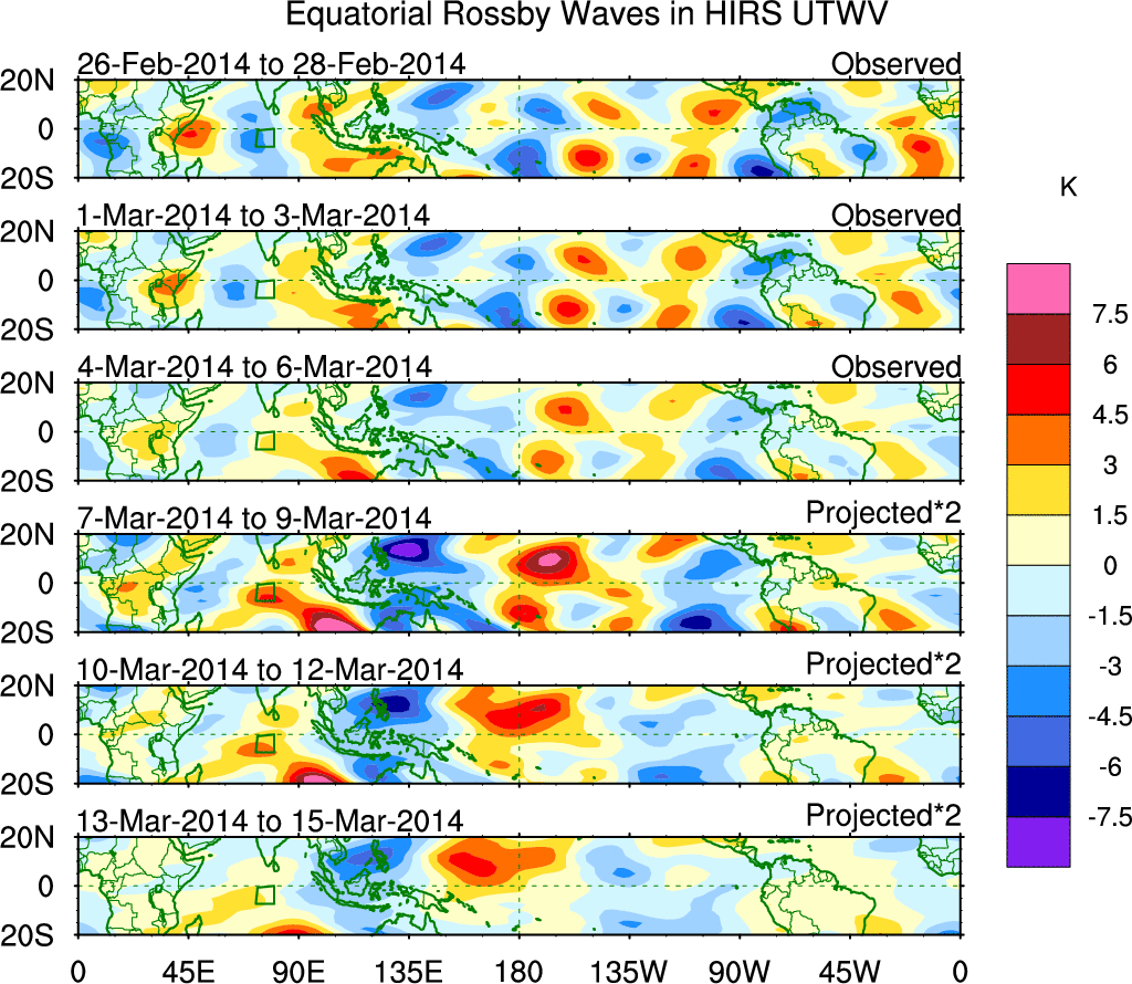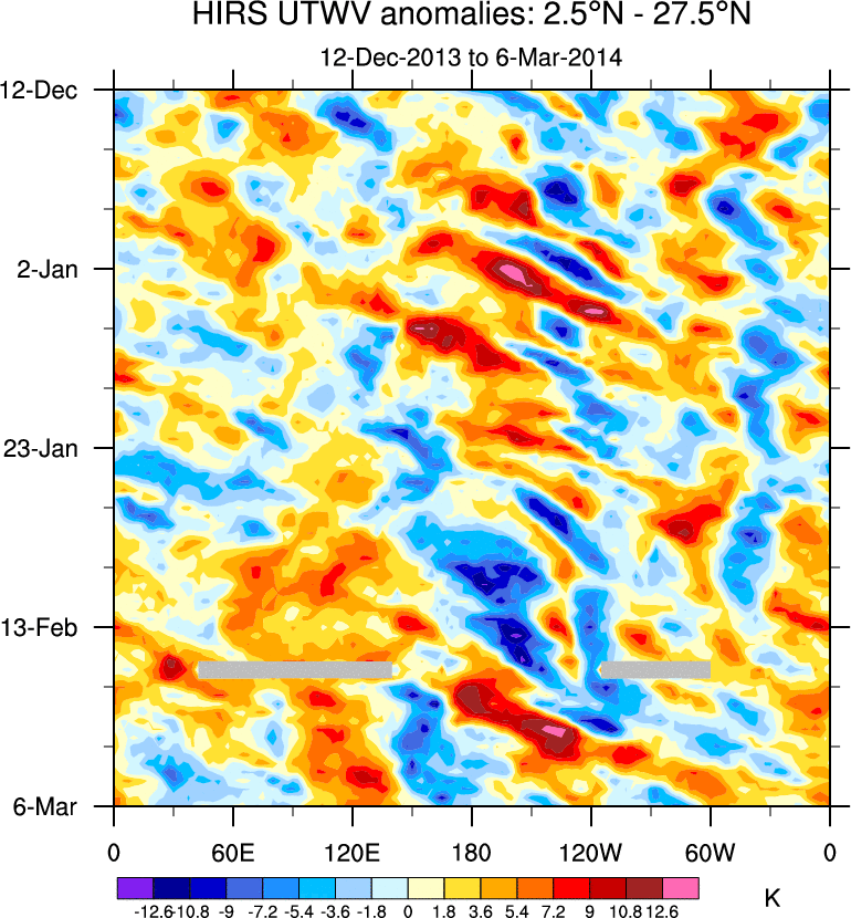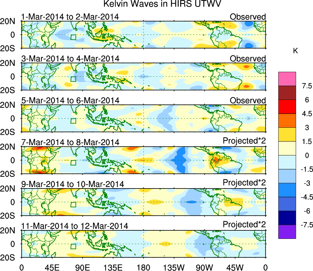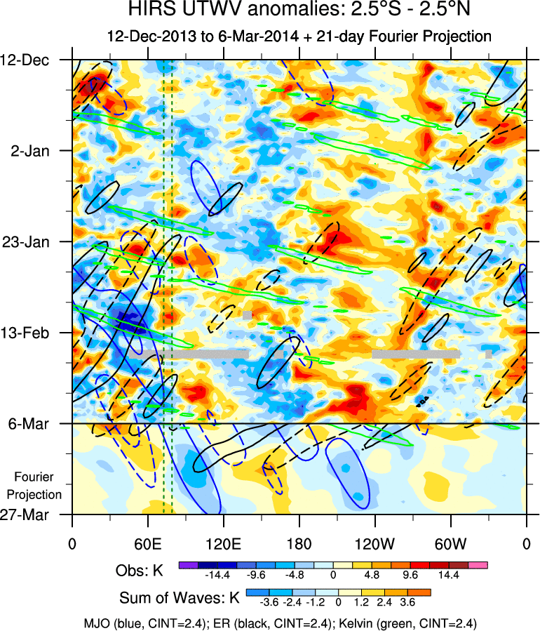 To identify tropical waves in near real-time, the OLR and UTWV data are filtered following Wheeler & Weickmann (2001 MWR). The daily anomalies are calculated using the first 3 harmonics of the seasonal cycle for 1979–2009. Missing values are then filled using linear interpolation in space and time. The most recent 365 days of anomalies are padded with 659 days of zeroes, and the result is filtered for each wave type.