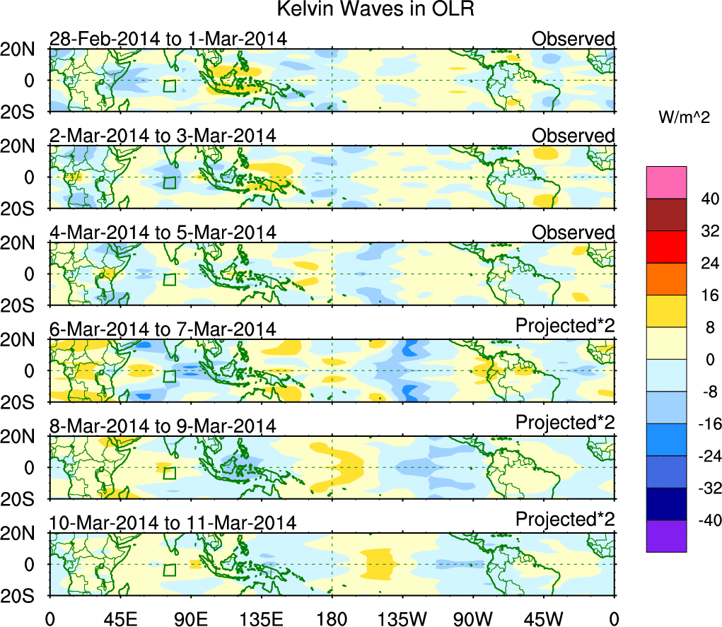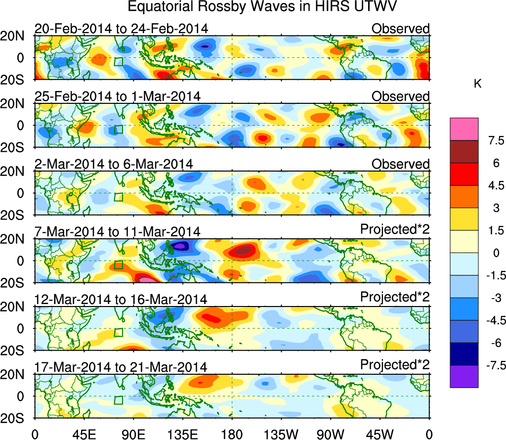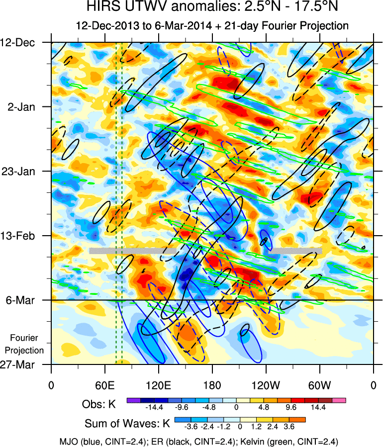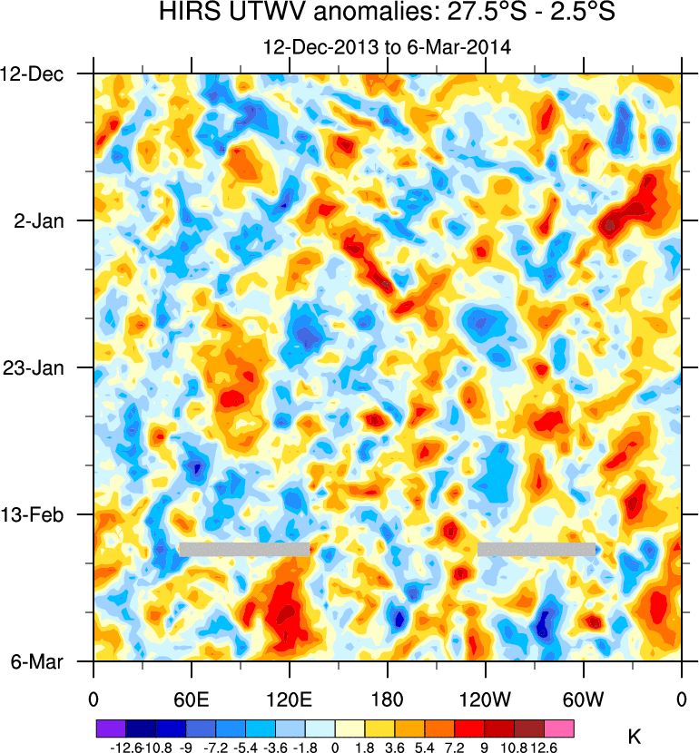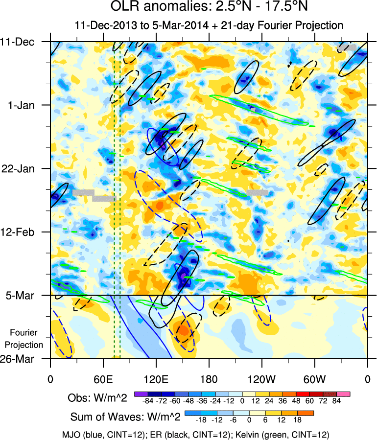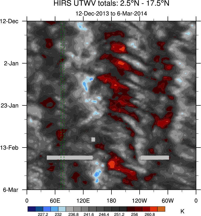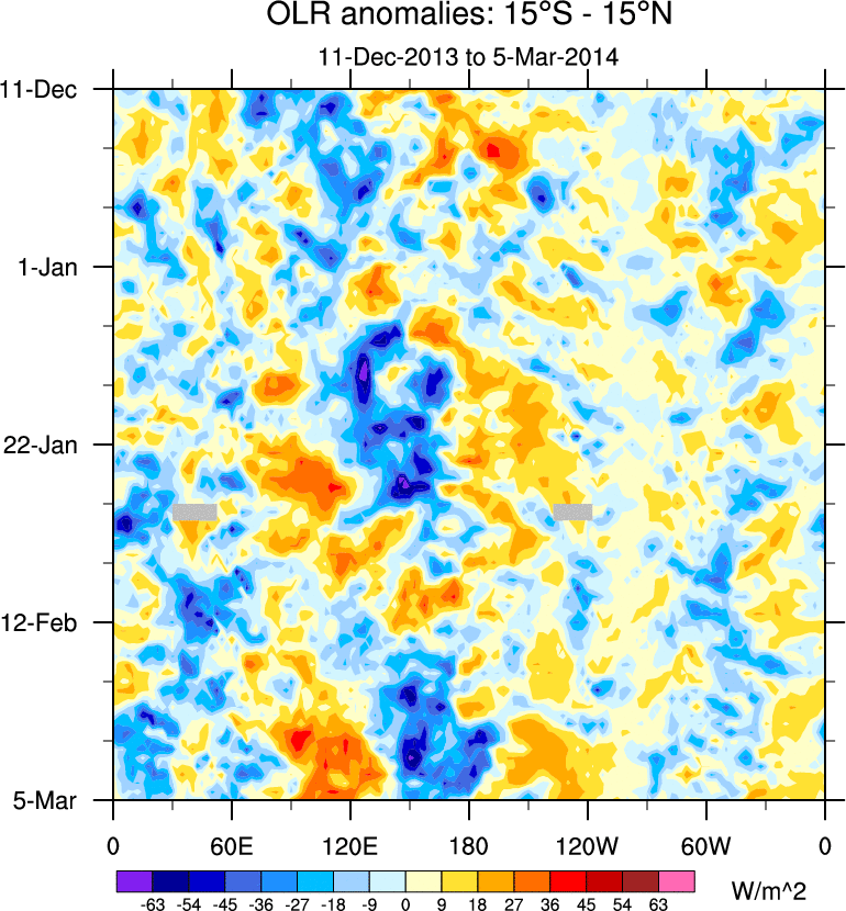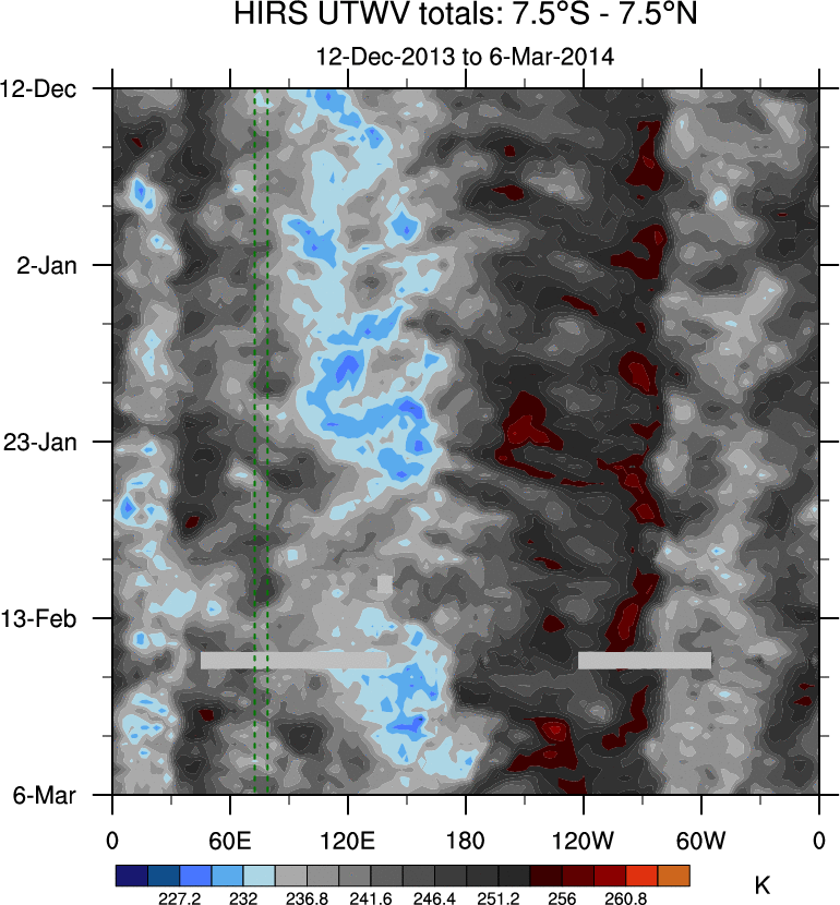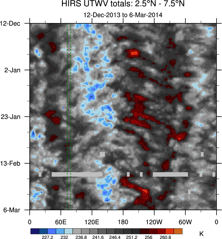 To identify tropical waves in near real-time, the OLR and UTWV data are filtered following Wheeler & Weickmann (2001 MWR). The daily anomalies are calculated using the first 3 harmonics of the seasonal cycle for 1979–2009. Missing values are then filled using linear interpolation in space and time. The most recent 365 days of anomalies are padded with 659 days of zeroes, and the result is filtered for each wave type.