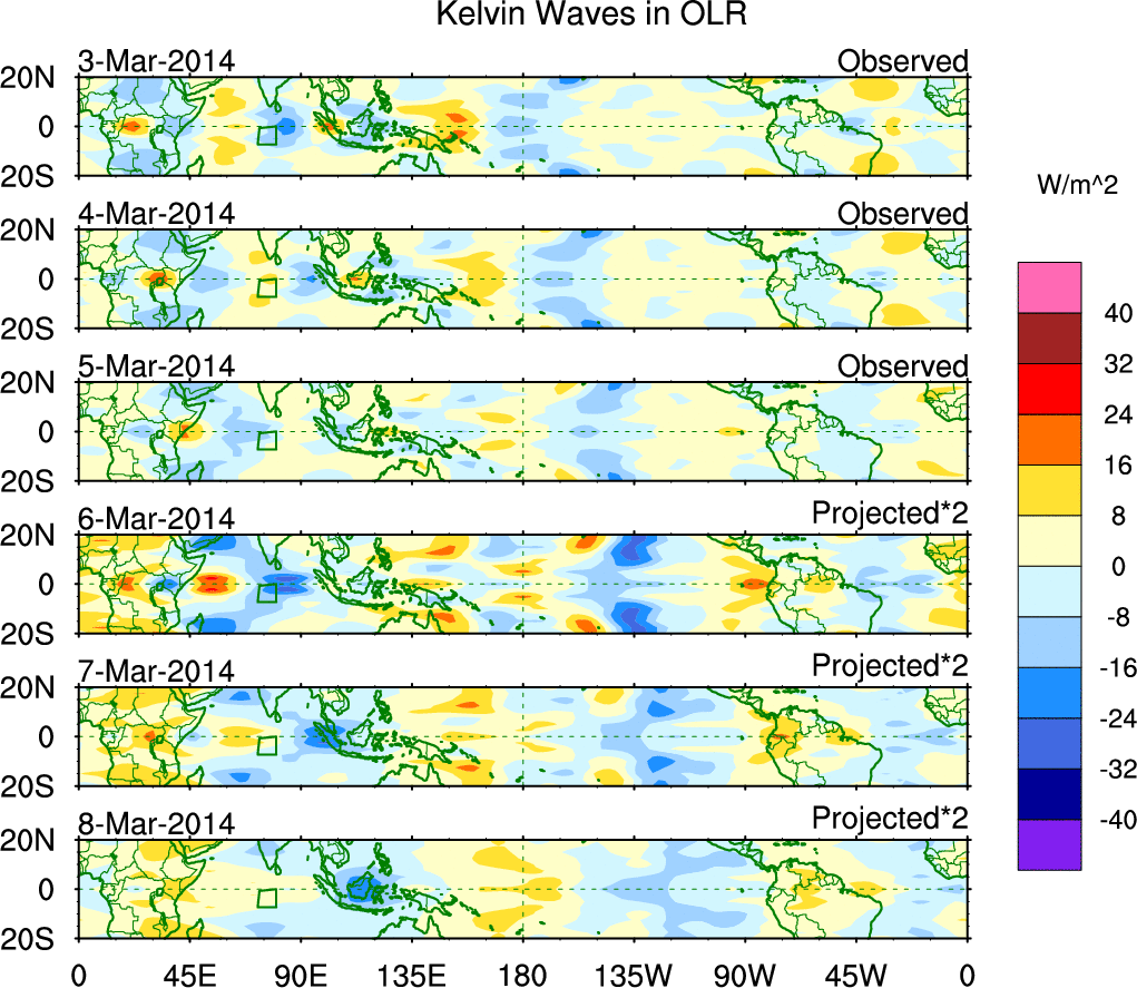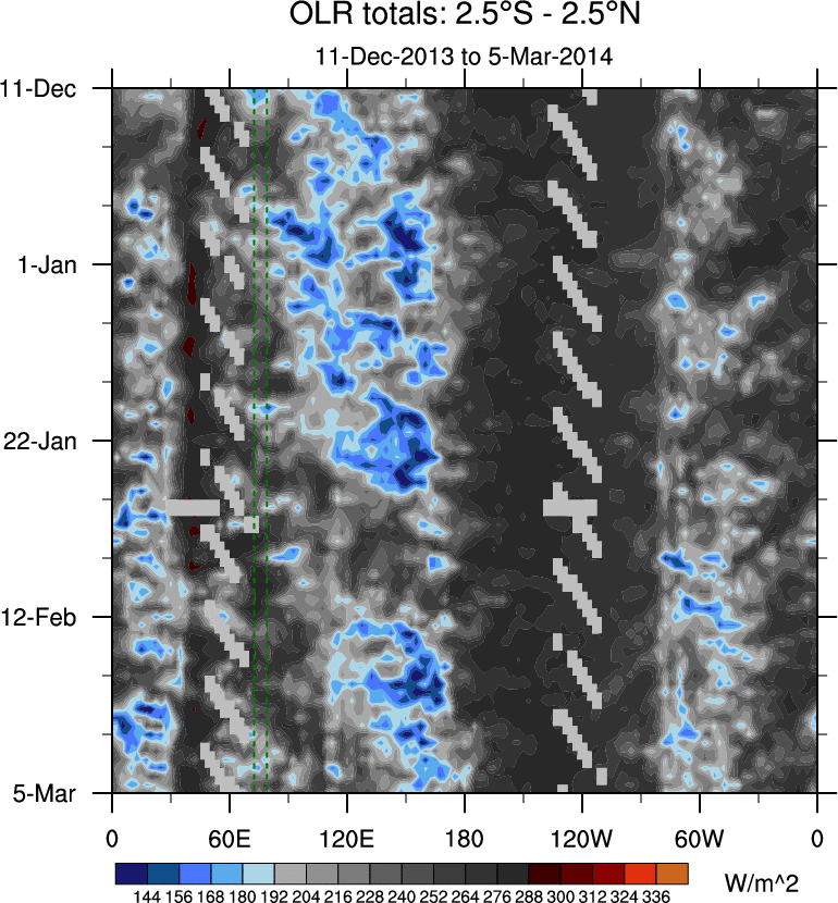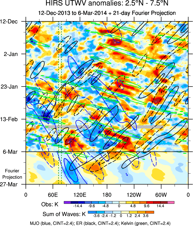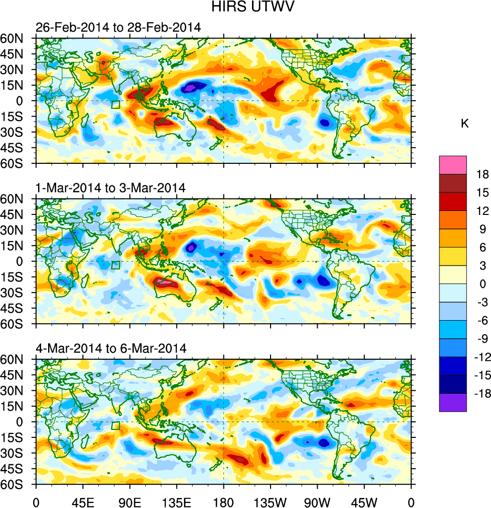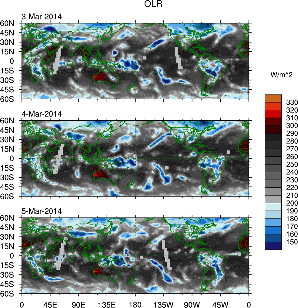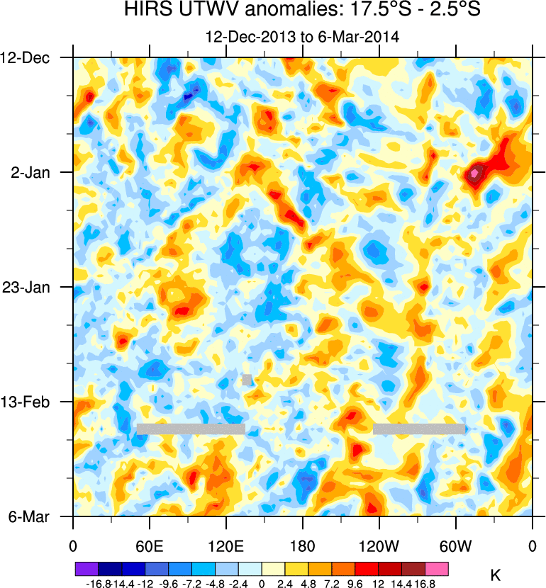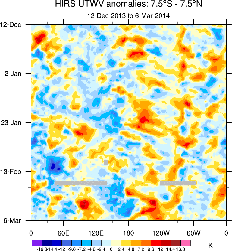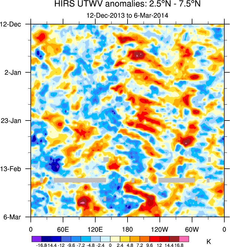 To identify tropical waves in near real-time, the OLR and UTWV data are filtered following Wheeler & Weickmann (2001 MWR). The daily anomalies are calculated using the first 3 harmonics of the seasonal cycle for 1979–2009. Missing values are then filled using linear interpolation in space and time. The most recent 365 days of anomalies are padded with 659 days of zeroes, and the result is filtered for each wave type.