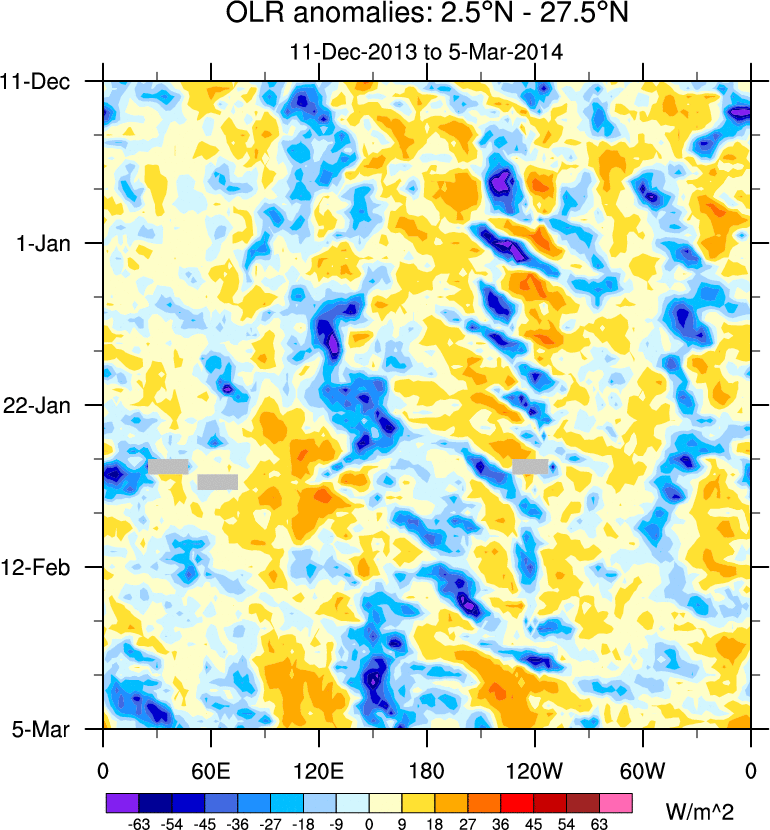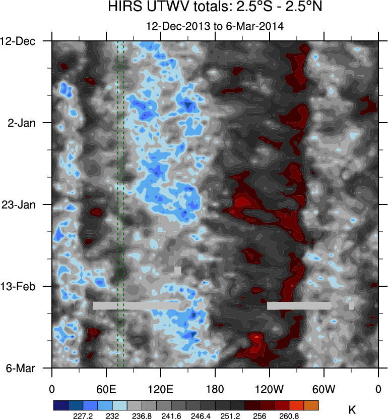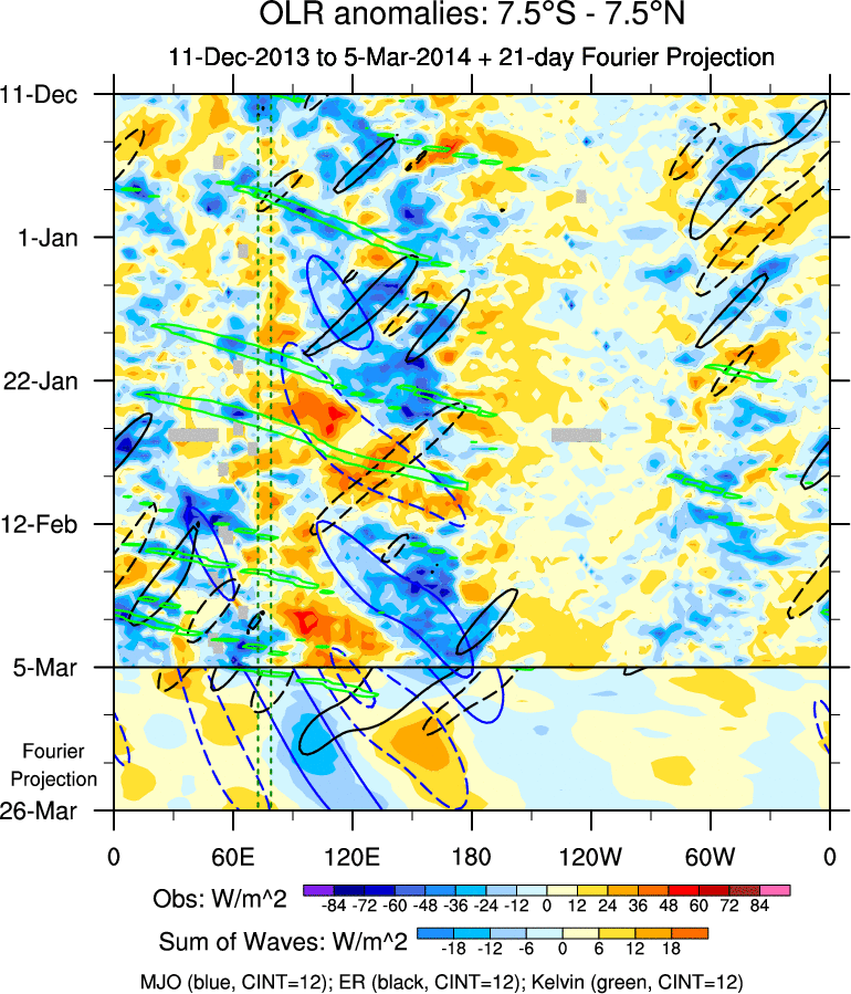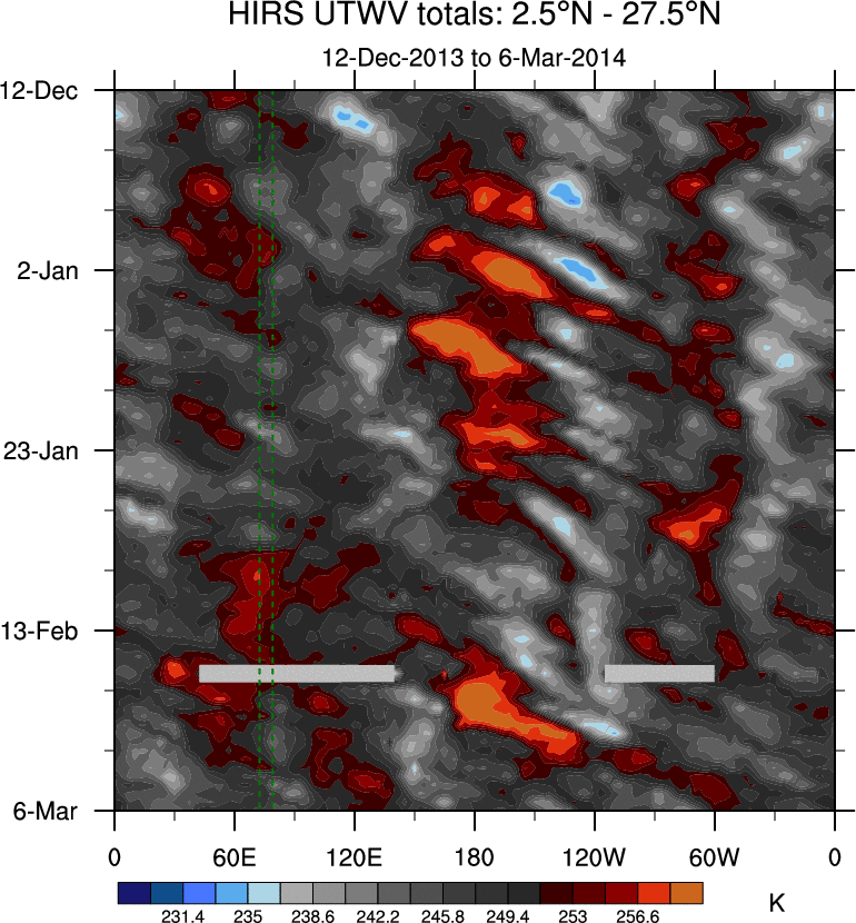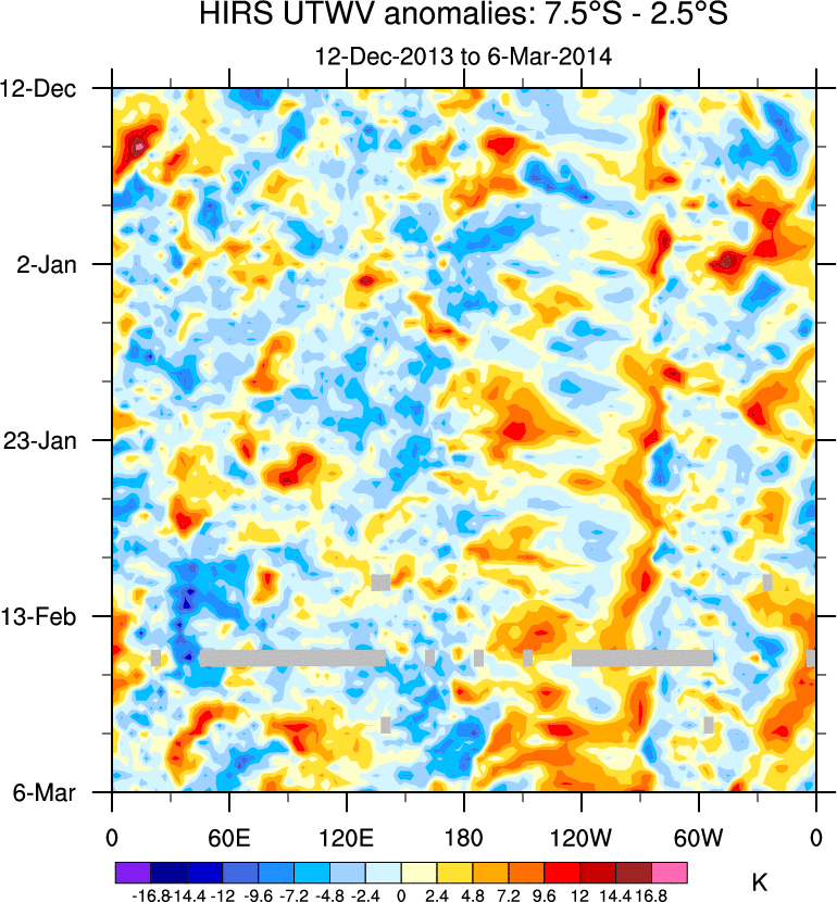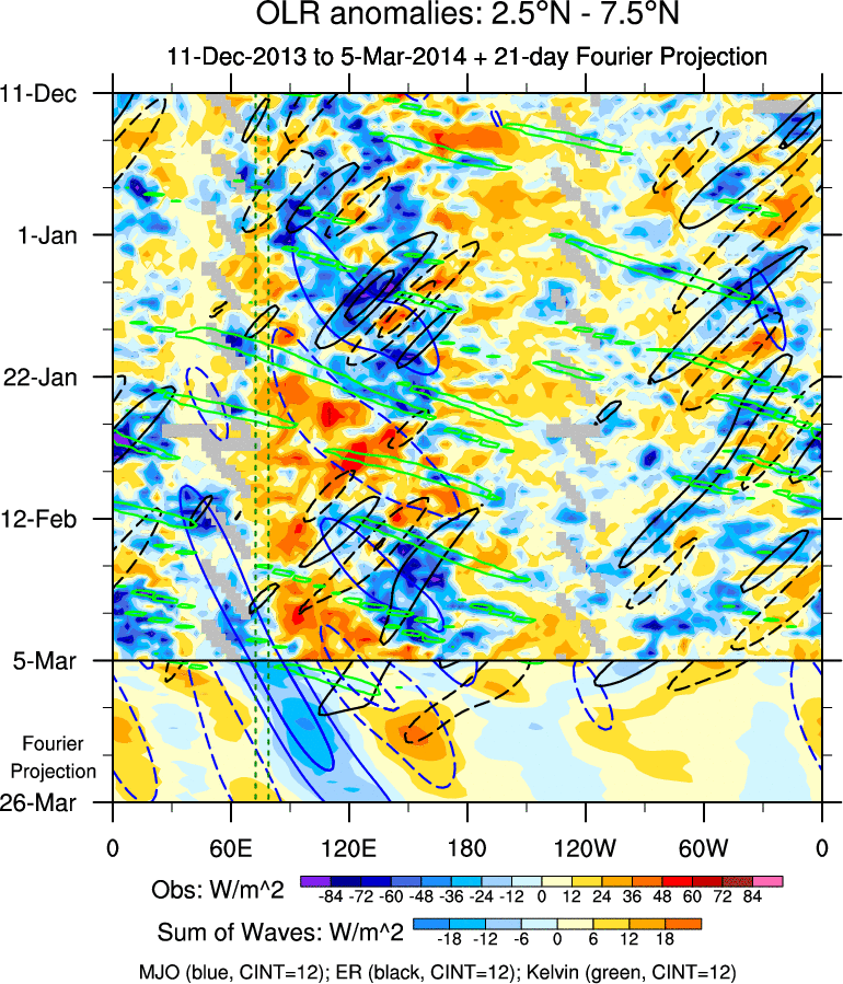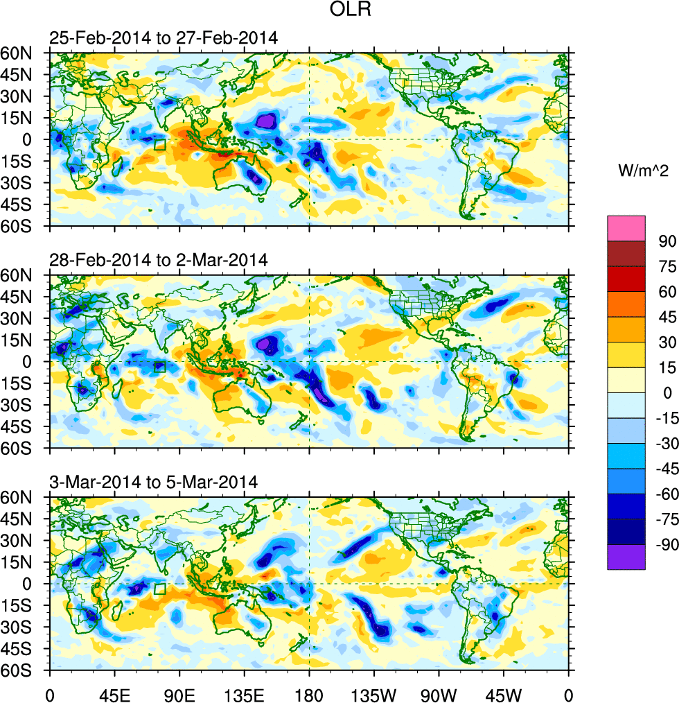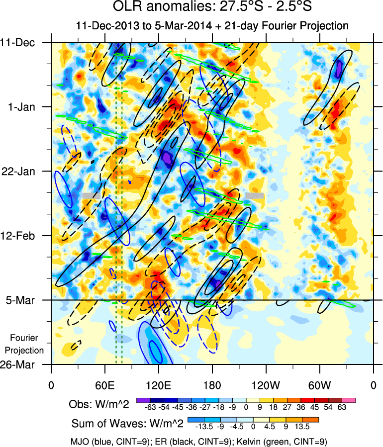 To identify tropical waves in near real-time, the OLR and UTWV data are filtered following Wheeler & Weickmann (2001 MWR). The daily anomalies are calculated using the first 3 harmonics of the seasonal cycle for 1979–2009. Missing values are then filled using linear interpolation in space and time. The most recent 365 days of anomalies are padded with 659 days of zeroes, and the result is filtered for each wave type.
