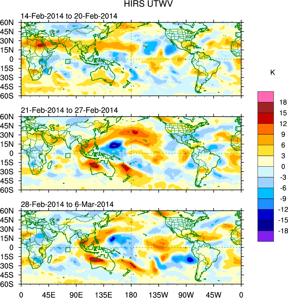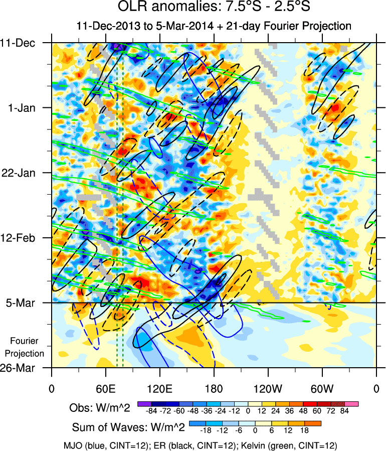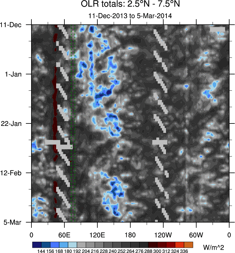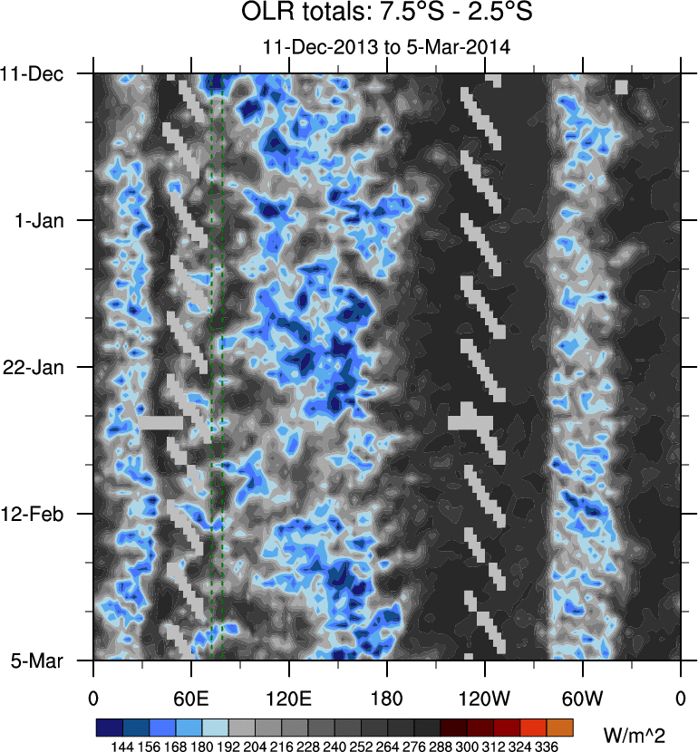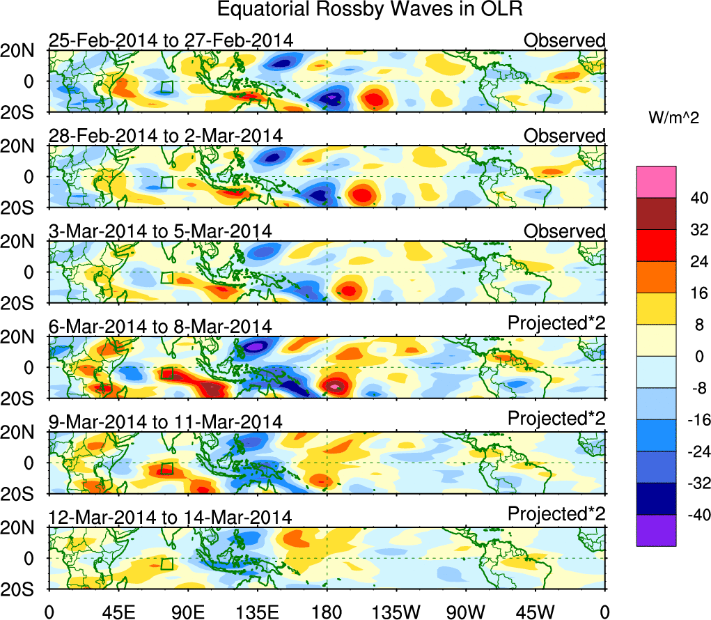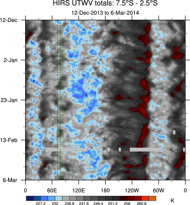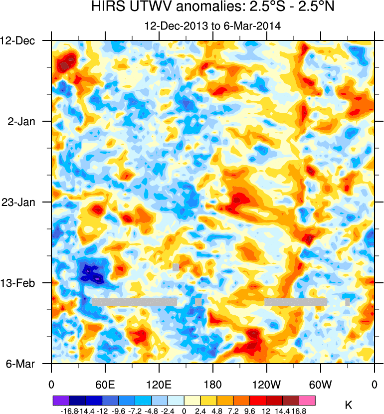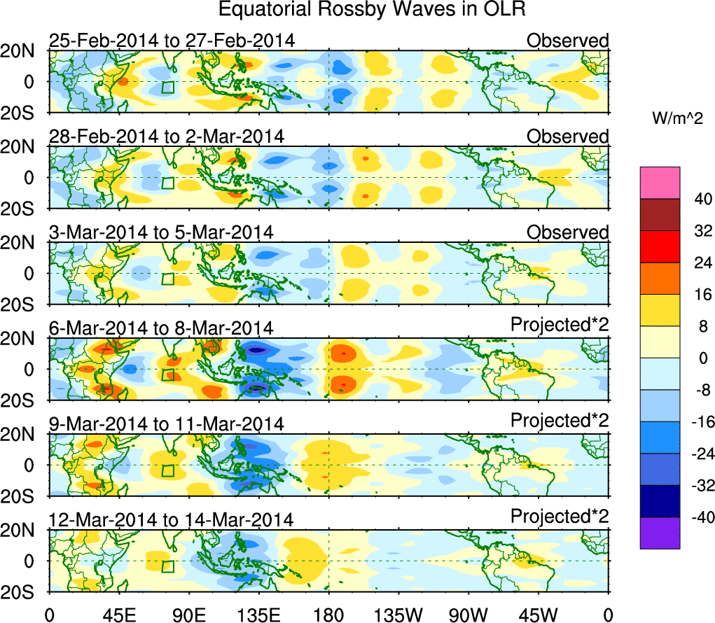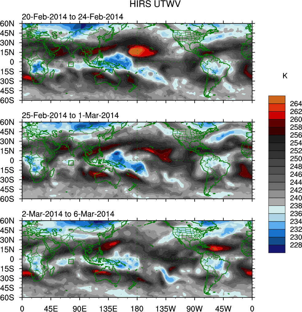 To identify tropical waves in near real-time, the OLR and UTWV data are filtered following Wheeler & Weickmann (2001 MWR). The daily anomalies are calculated using the first 3 harmonics of the seasonal cycle for 1979–2009. Missing values are then filled using linear interpolation in space and time. The most recent 365 days of anomalies are padded with 659 days of zeroes, and the result is filtered for each wave type.