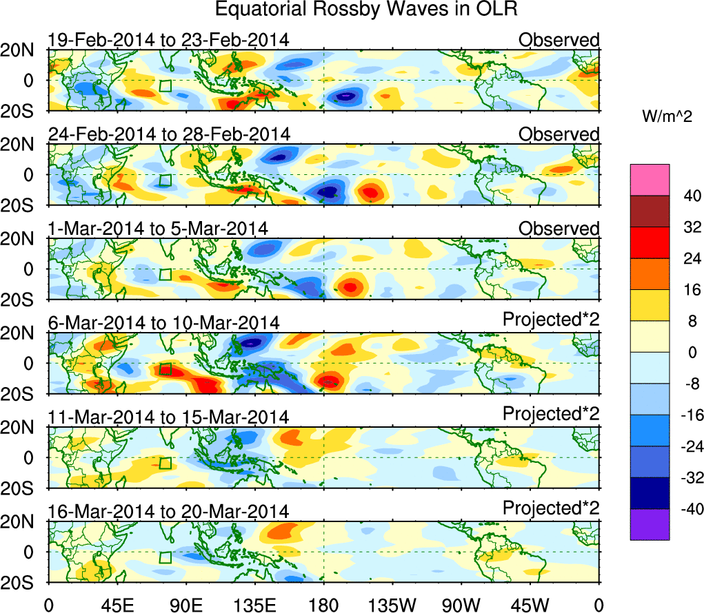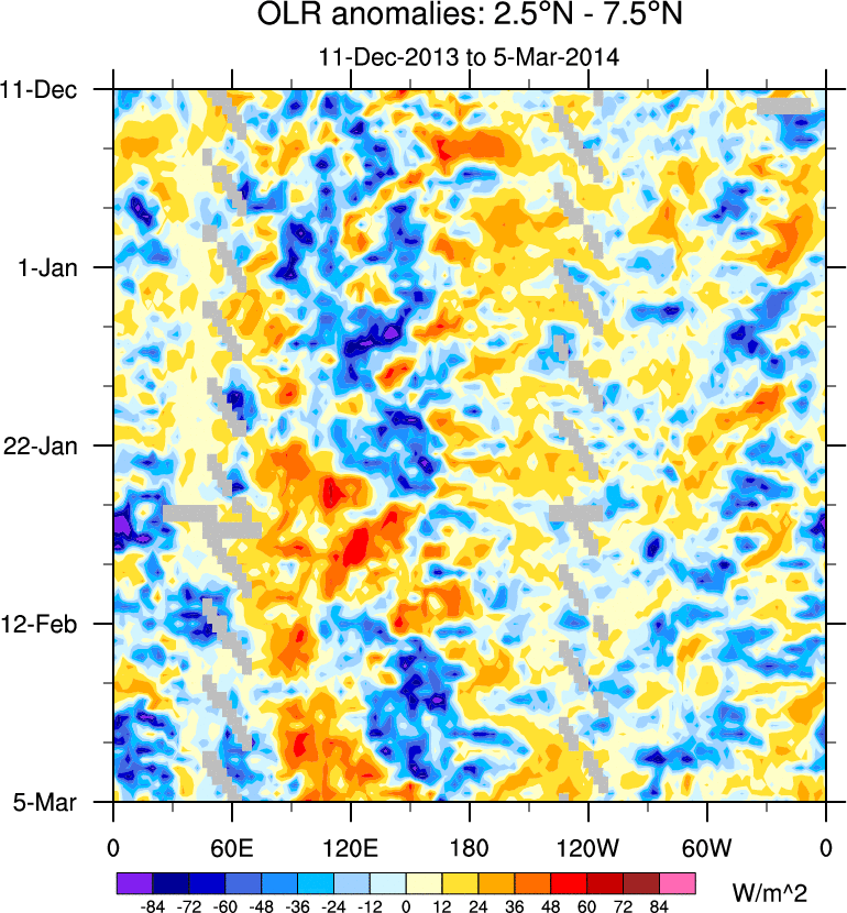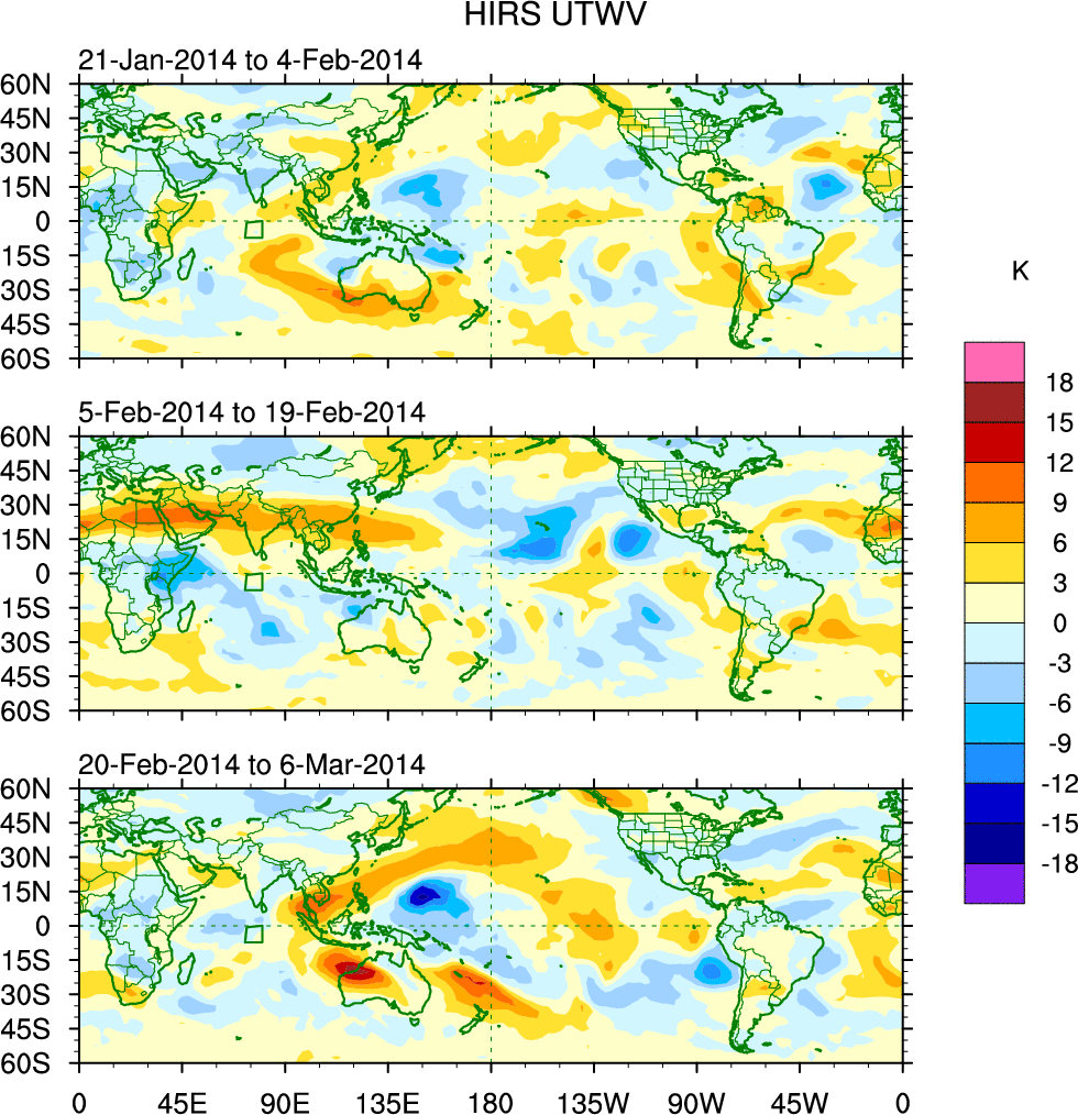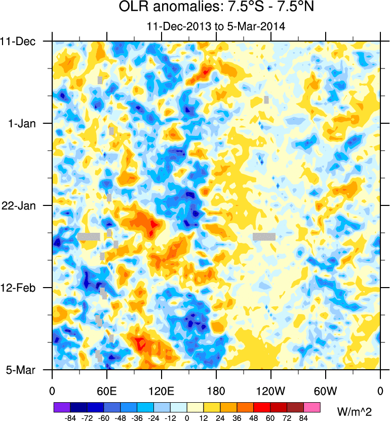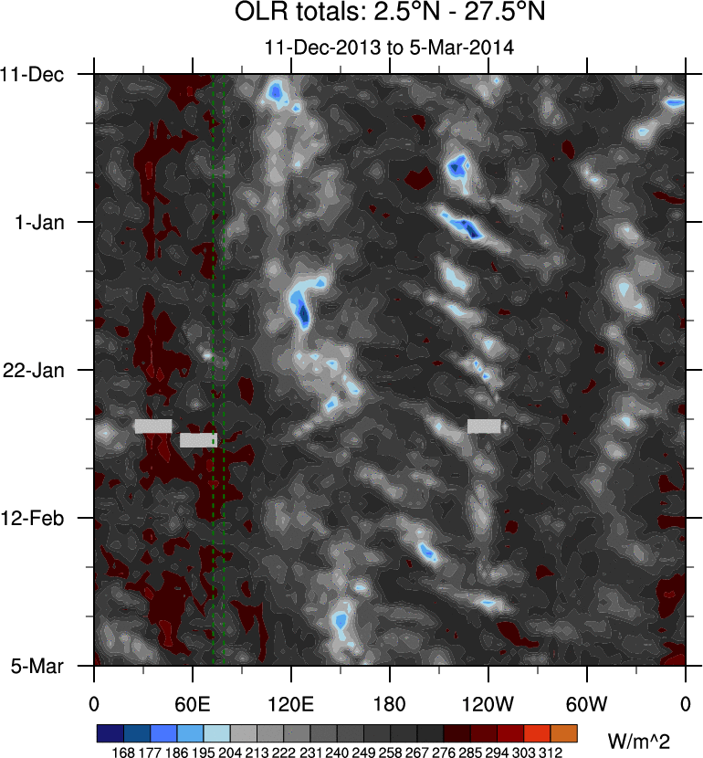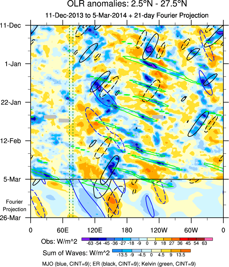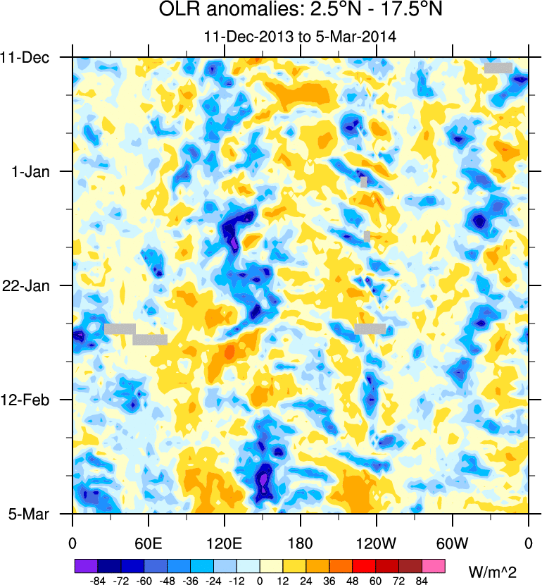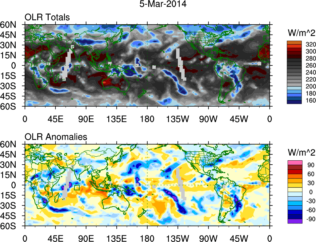 To identify tropical waves in near real-time, the OLR and UTWV data are filtered following Wheeler & Weickmann (2001 MWR). The daily anomalies are calculated using the first 3 harmonics of the seasonal cycle for 1979–2009. Missing values are then filled using linear interpolation in space and time. The most recent 365 days of anomalies are padded with 659 days of zeroes, and the result is filtered for each wave type.