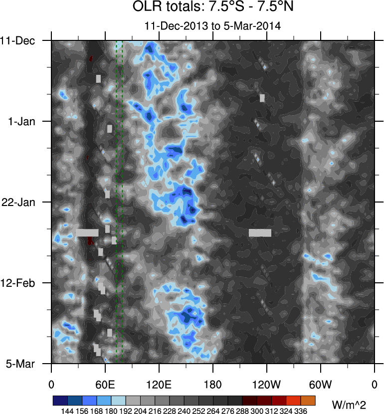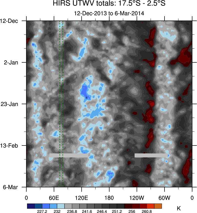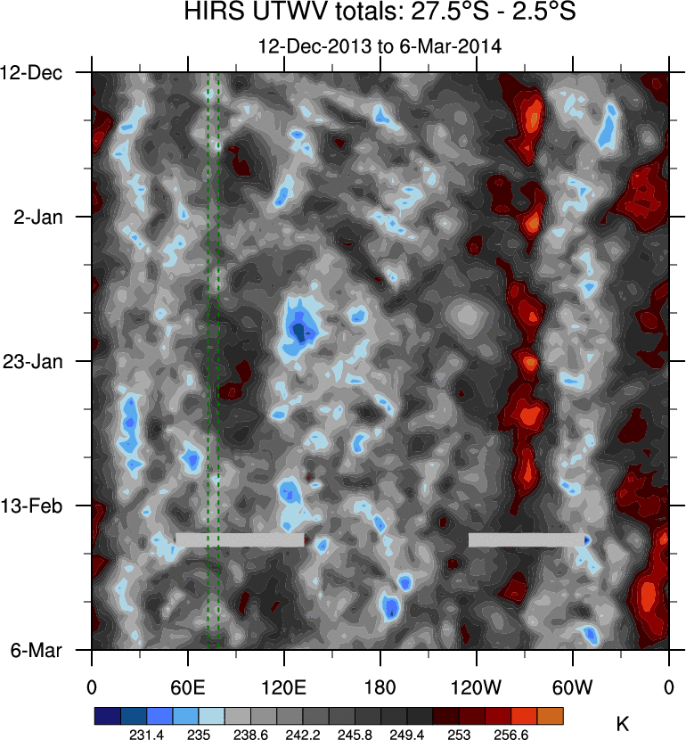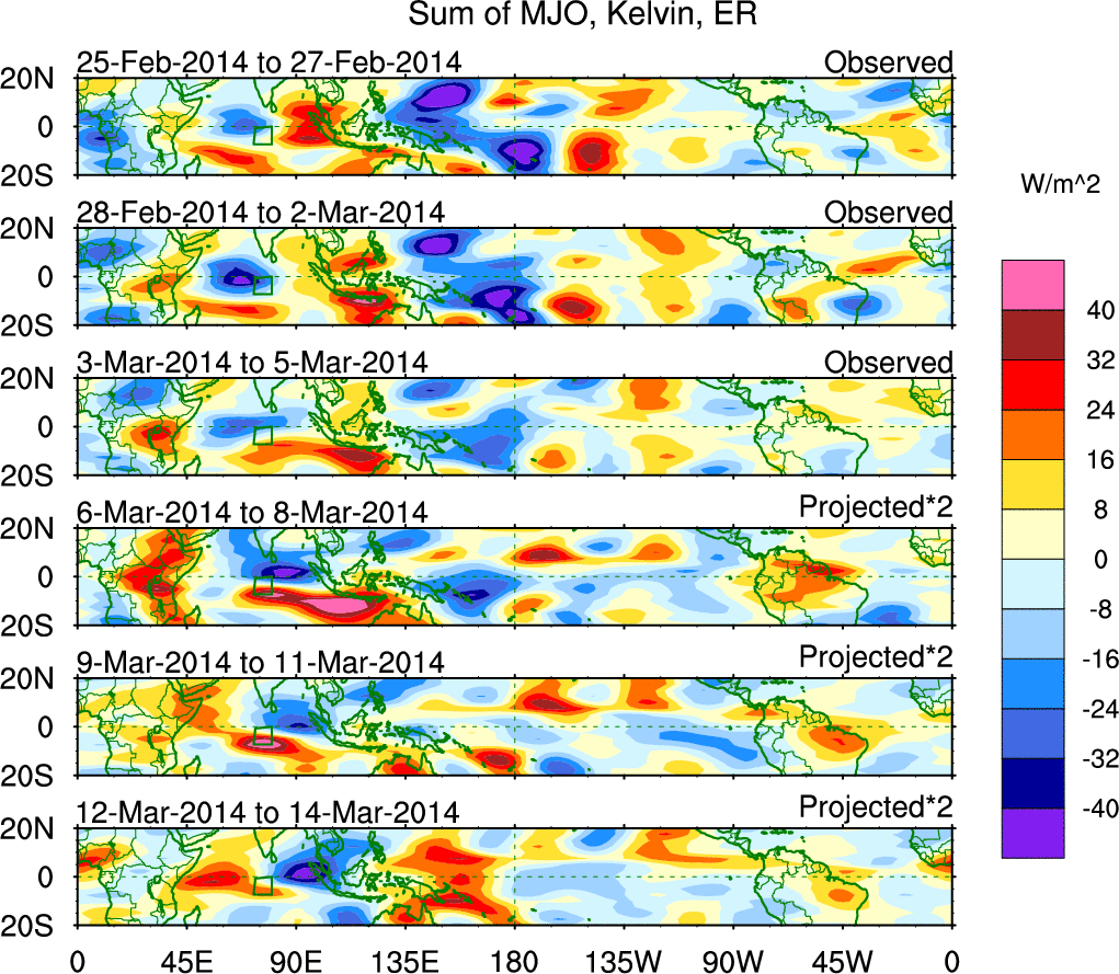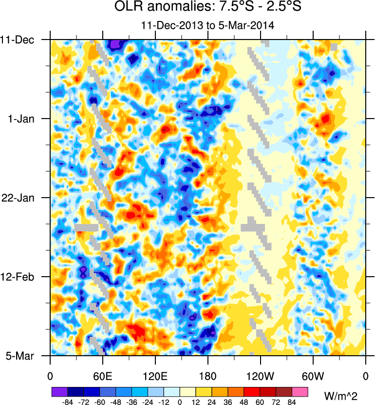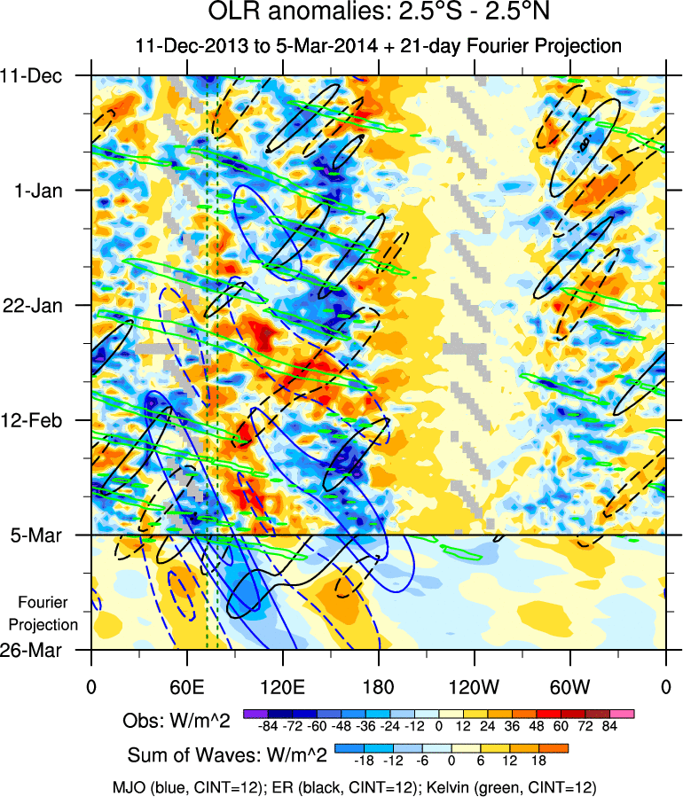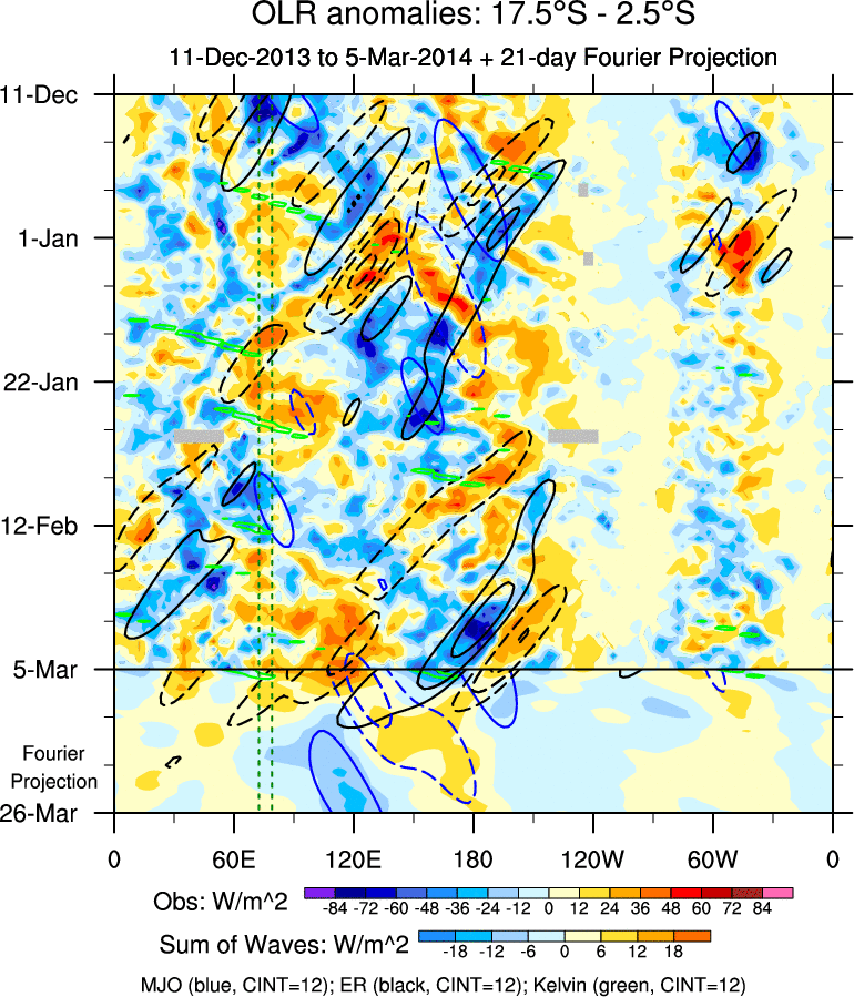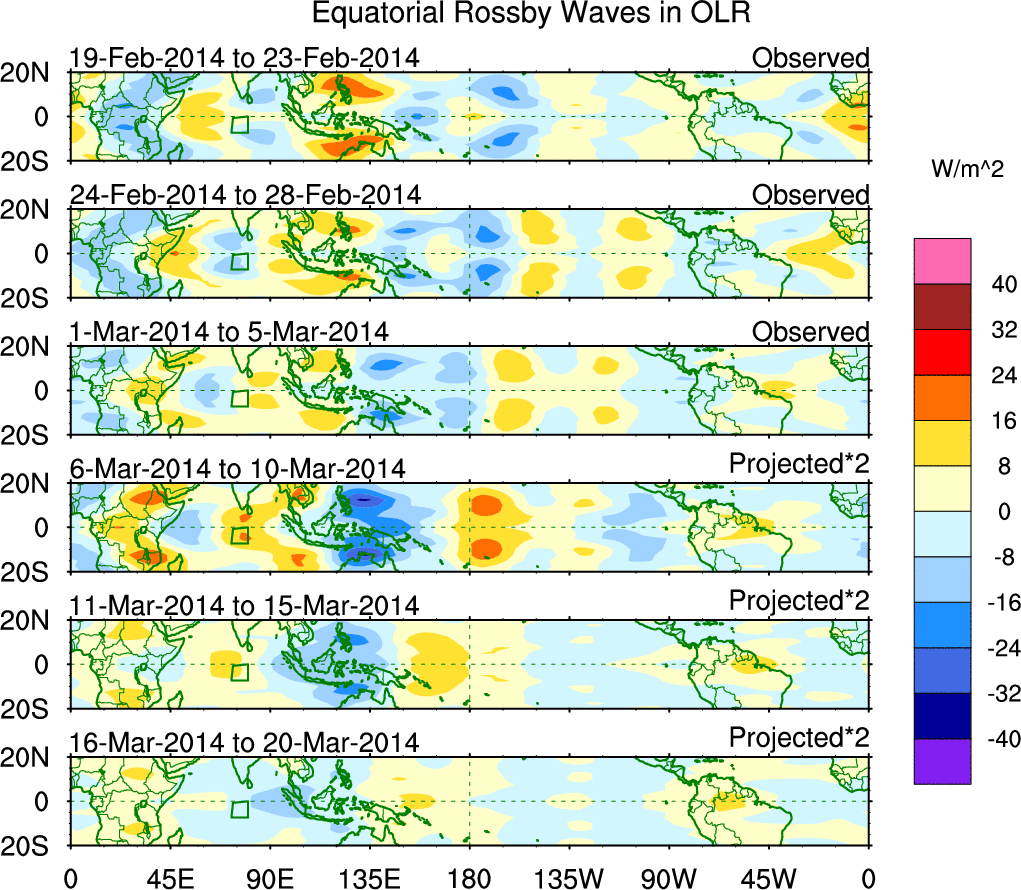 To identify tropical waves in near real-time, the OLR and UTWV data are filtered following Wheeler & Weickmann (2001 MWR). The daily anomalies are calculated using the first 3 harmonics of the seasonal cycle for 1979–2009. Missing values are then filled using linear interpolation in space and time. The most recent 365 days of anomalies are padded with 659 days of zeroes, and the result is filtered for each wave type.