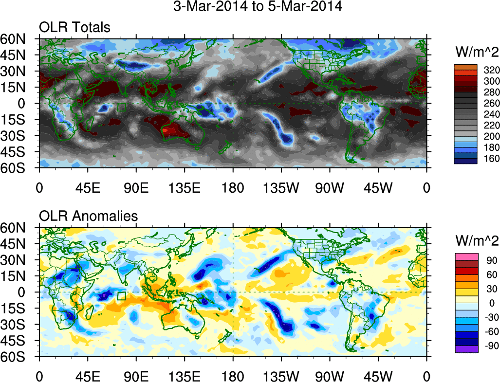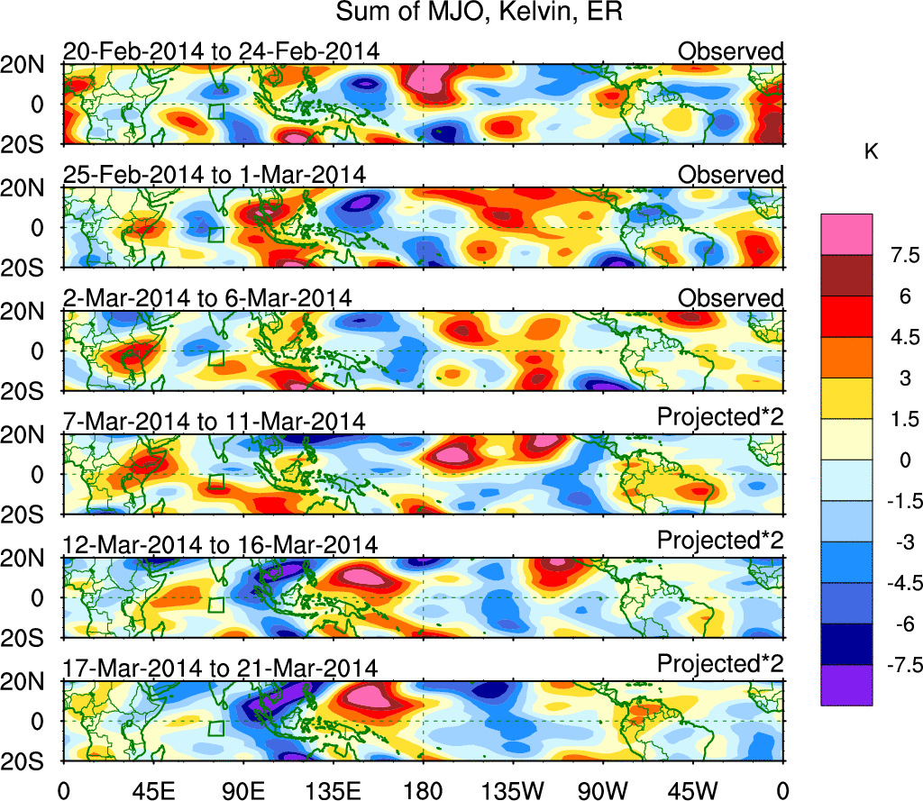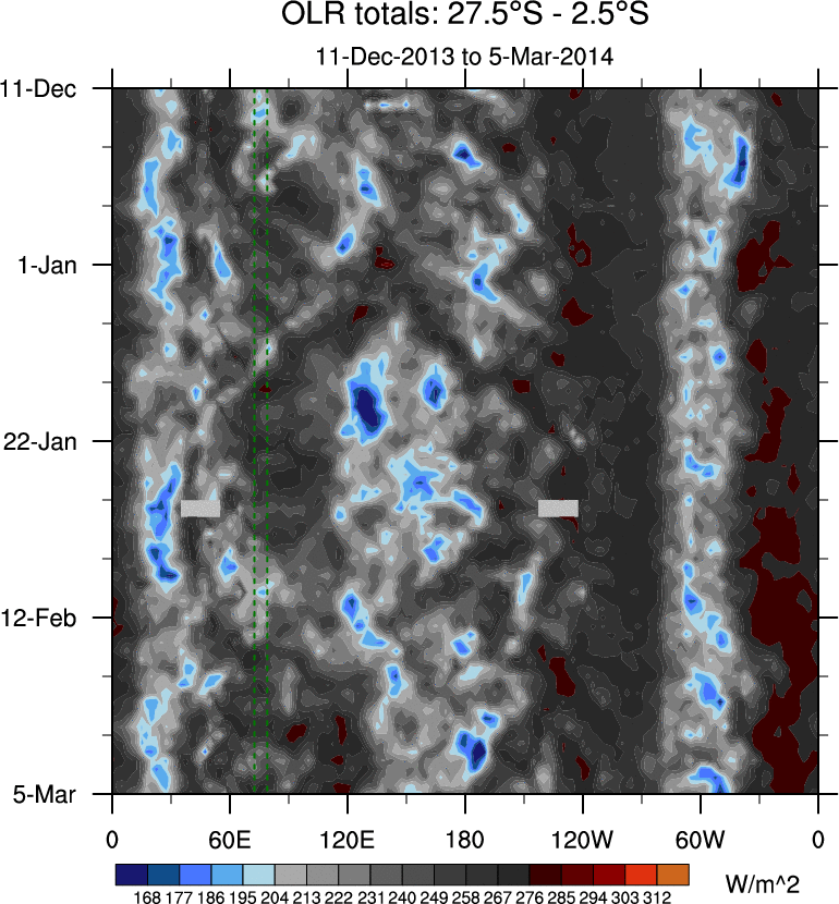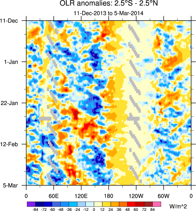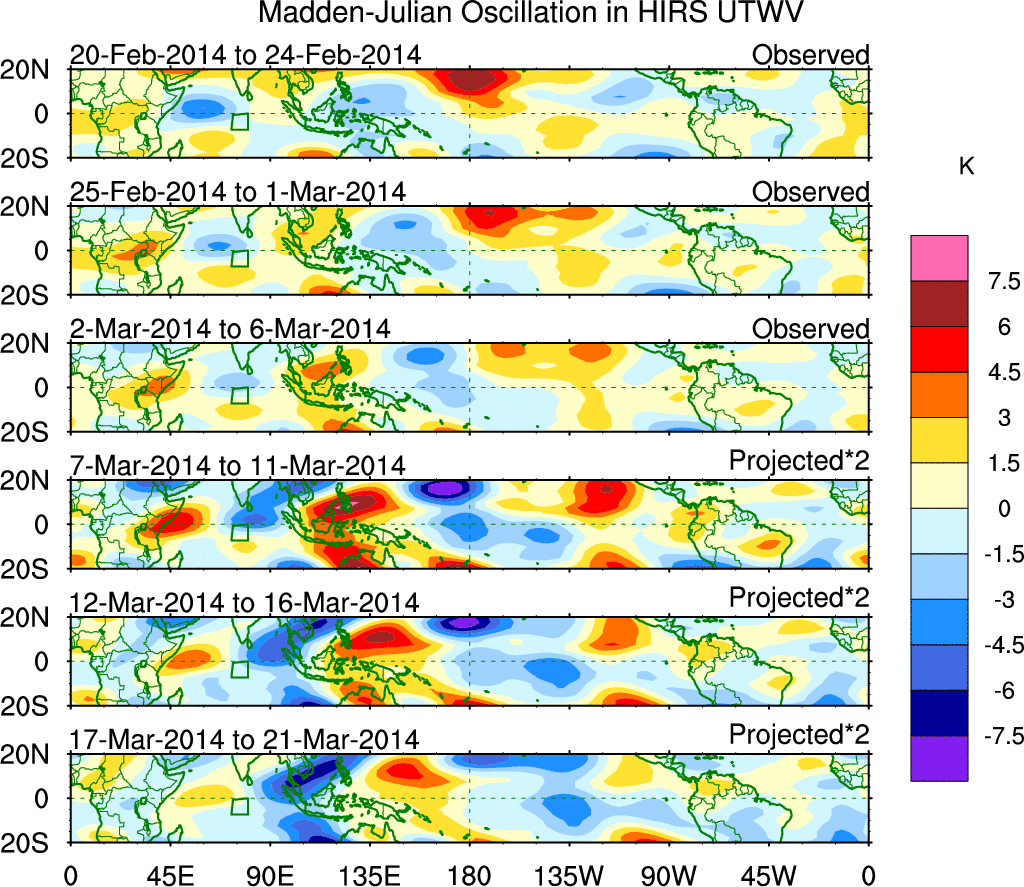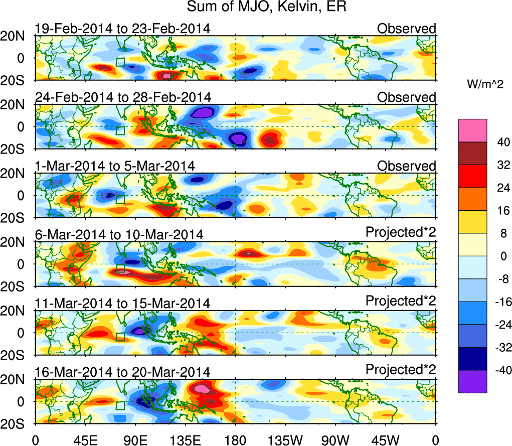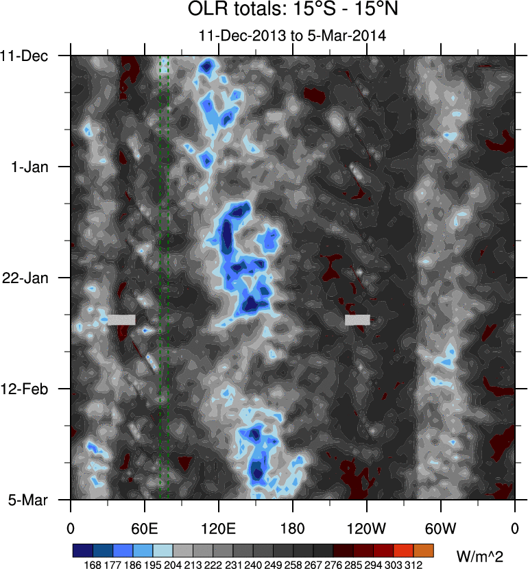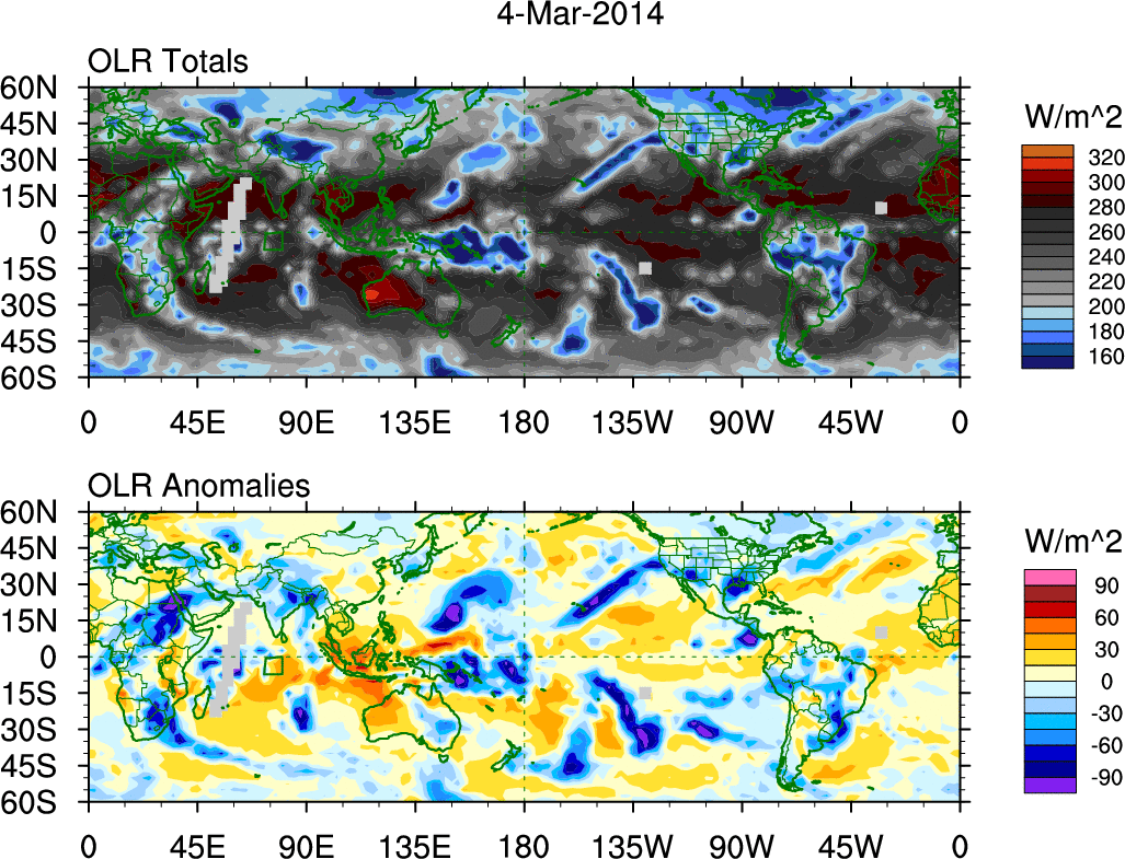 To identify tropical waves in near real-time, the OLR and UTWV data are filtered following Wheeler & Weickmann (2001 MWR). The daily anomalies are calculated using the first 3 harmonics of the seasonal cycle for 1979–2009. Missing values are then filled using linear interpolation in space and time. The most recent 365 days of anomalies are padded with 659 days of zeroes, and the result is filtered for each wave type.