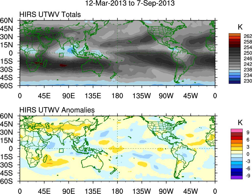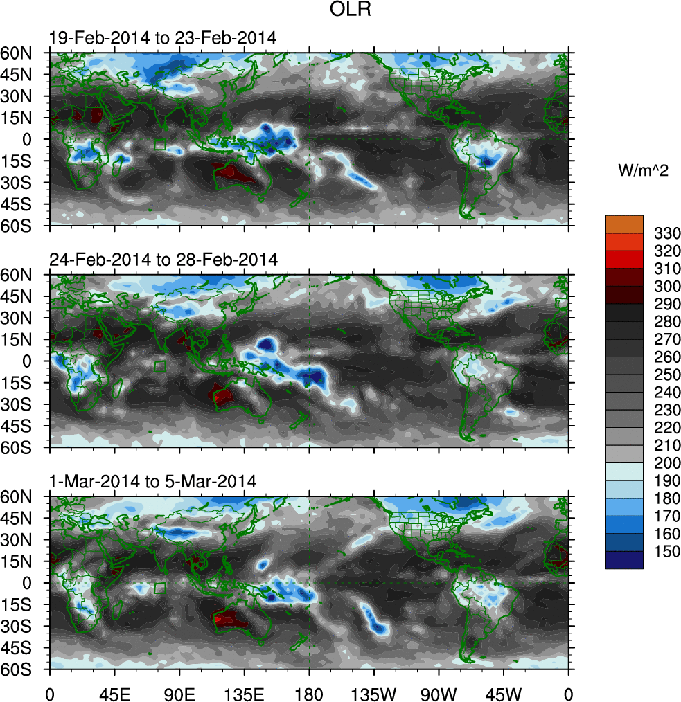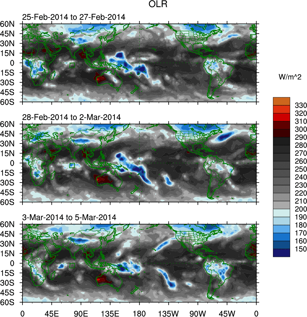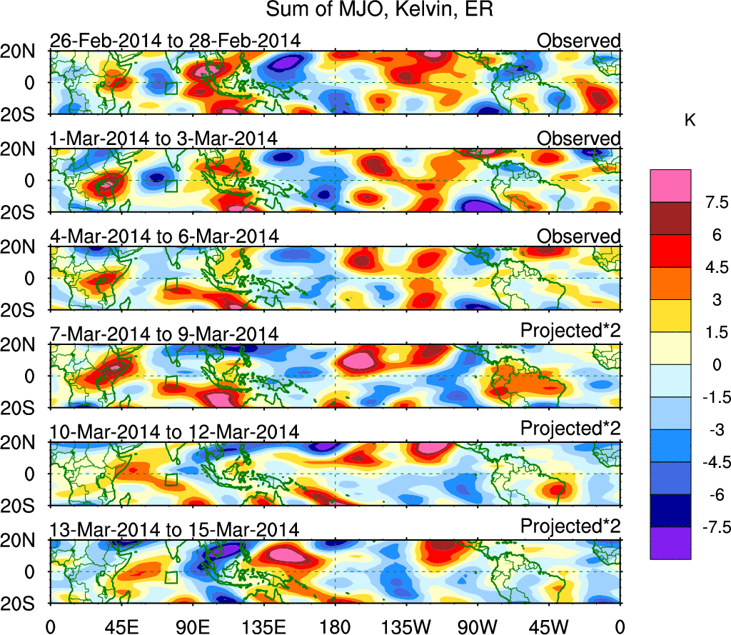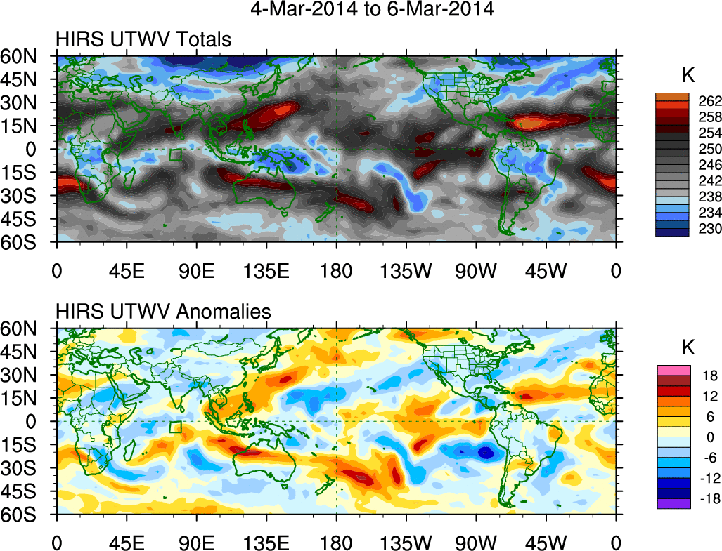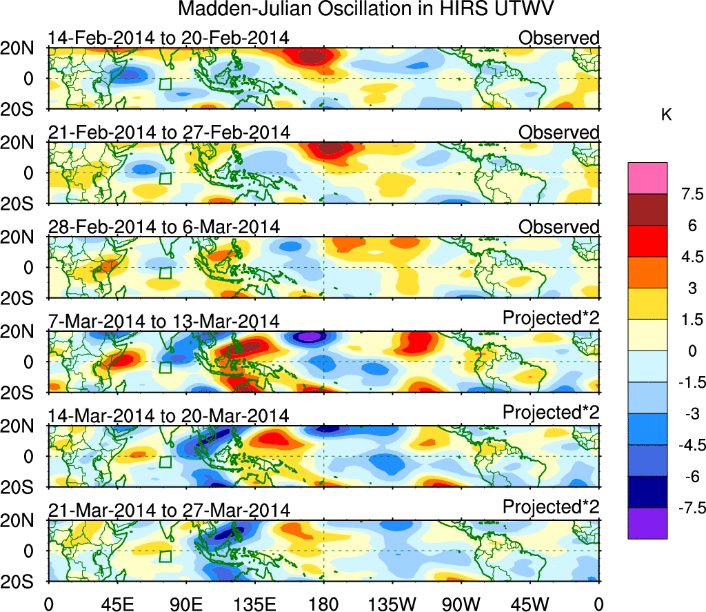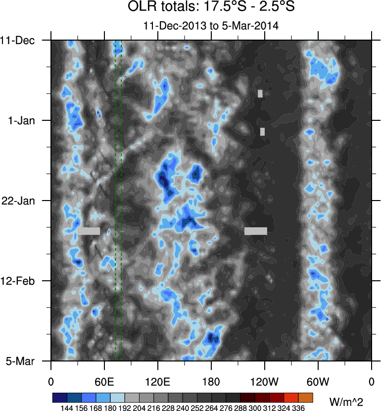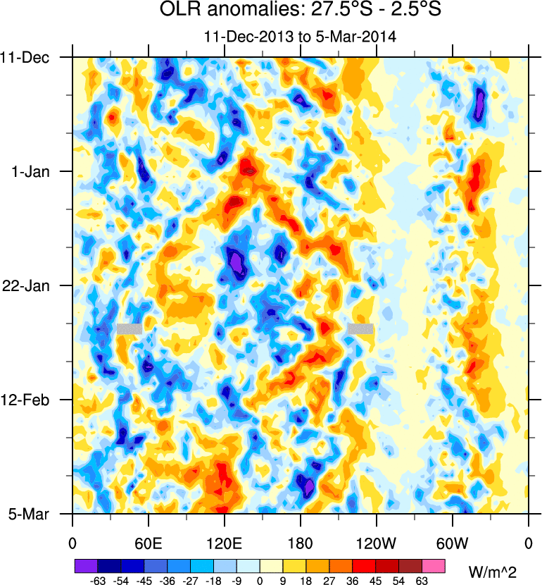 To identify tropical waves in near real-time, the OLR and UTWV data are filtered following Wheeler & Weickmann (2001 MWR). The daily anomalies are calculated using the first 3 harmonics of the seasonal cycle for 1979–2009. Missing values are then filled using linear interpolation in space and time. The most recent 365 days of anomalies are padded with 659 days of zeroes, and the result is filtered for each wave type.