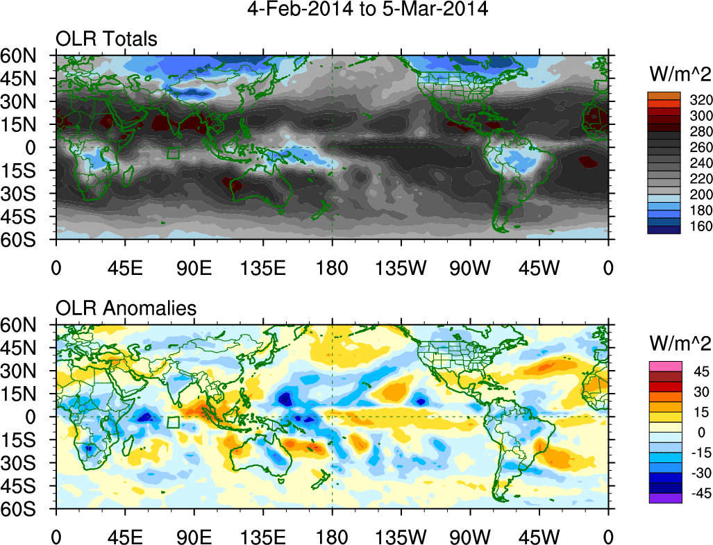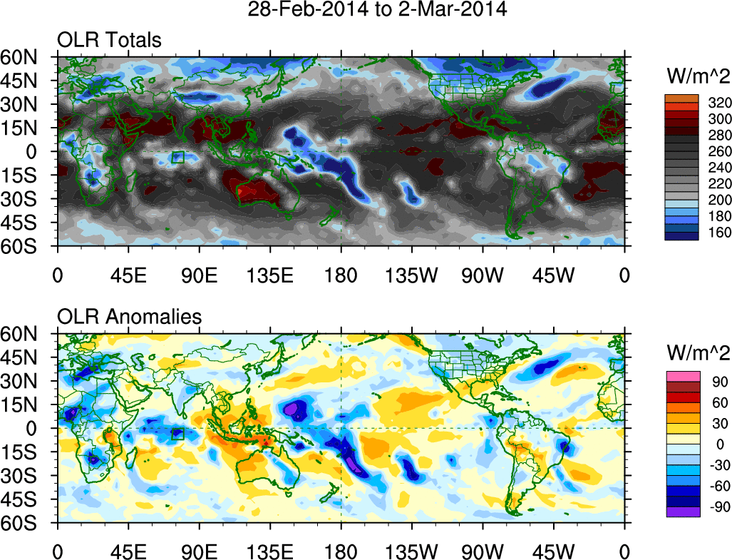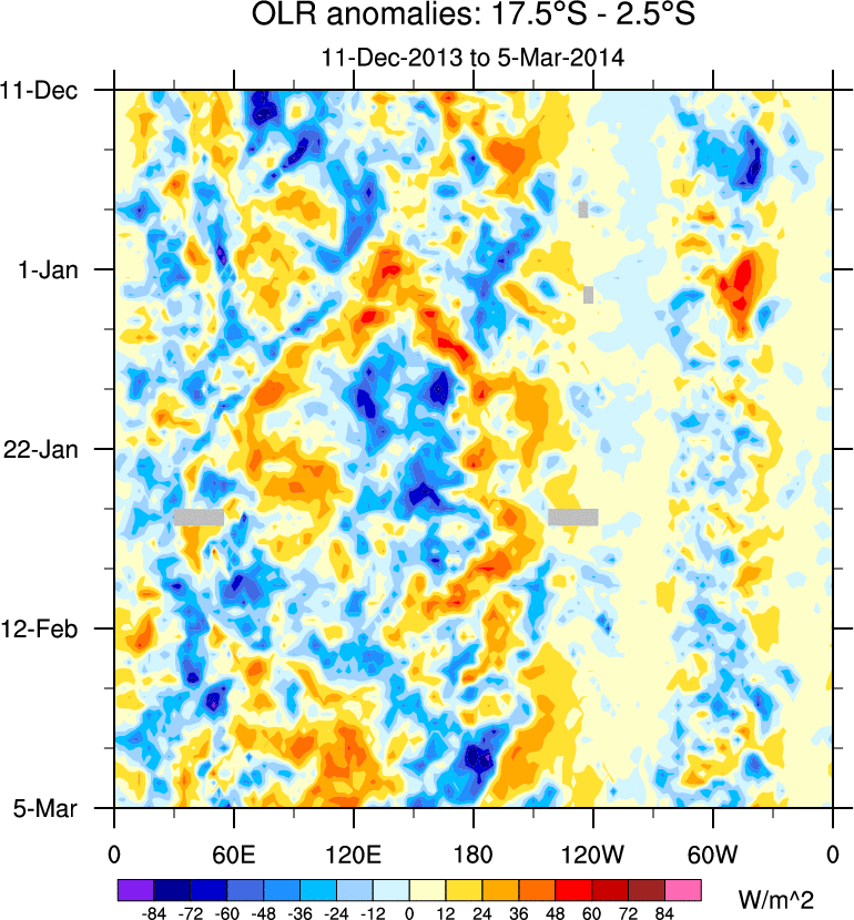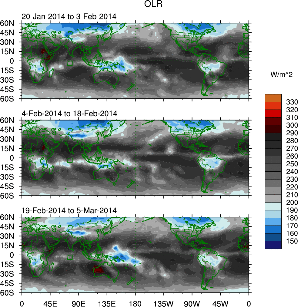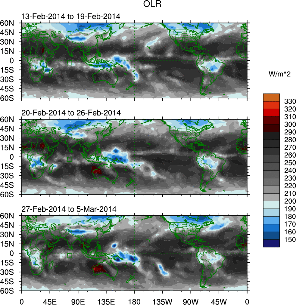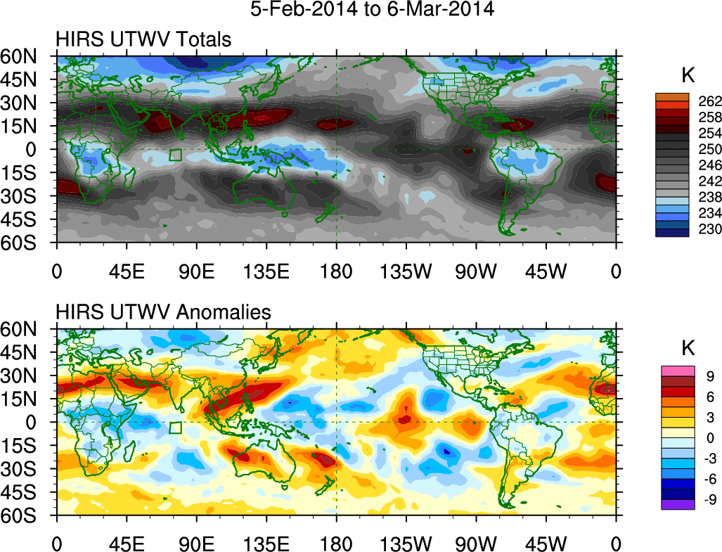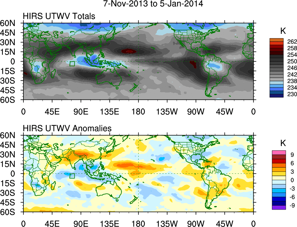 To identify tropical waves in near real-time, the OLR and UTWV data are filtered following Wheeler & Weickmann (2001 MWR). The daily anomalies are calculated using the first 3 harmonics of the seasonal cycle for 1979–2009. Missing values are then filled using linear interpolation in space and time. The most recent 365 days of anomalies are padded with 659 days of zeroes, and the result is filtered for each wave type.