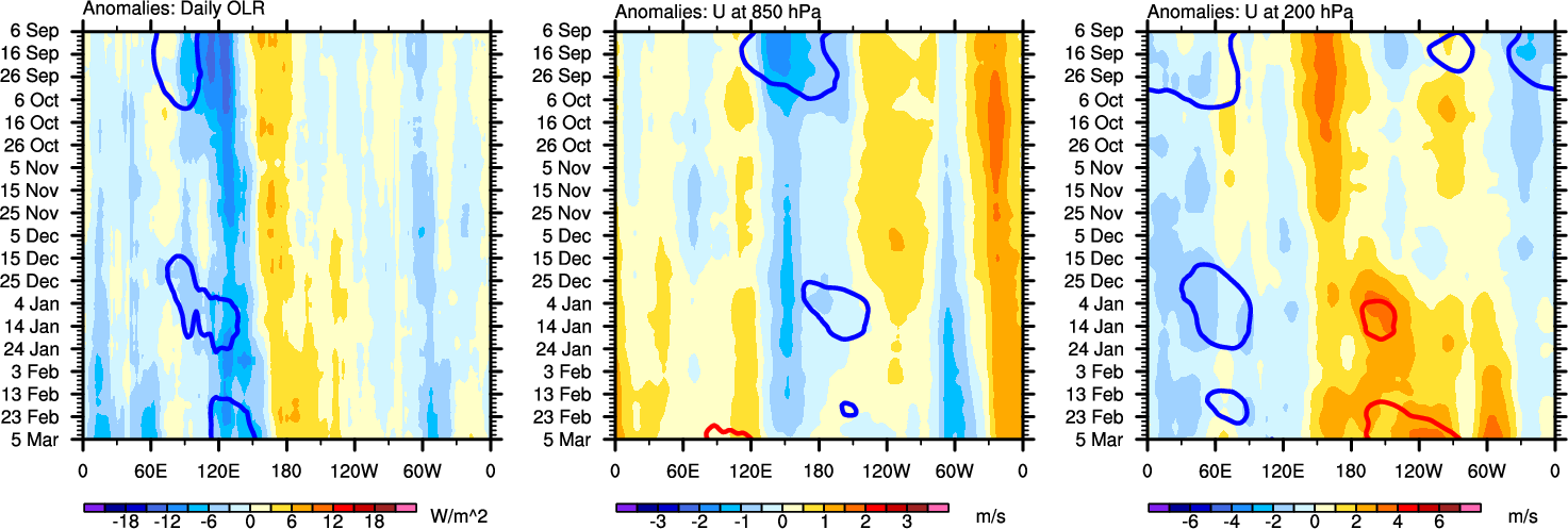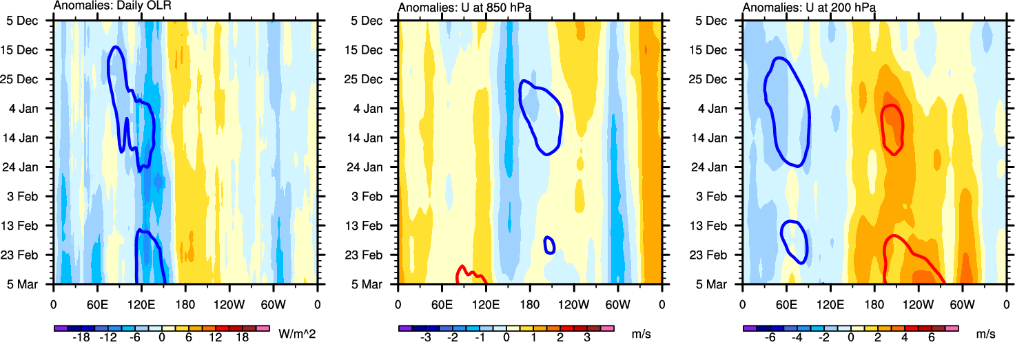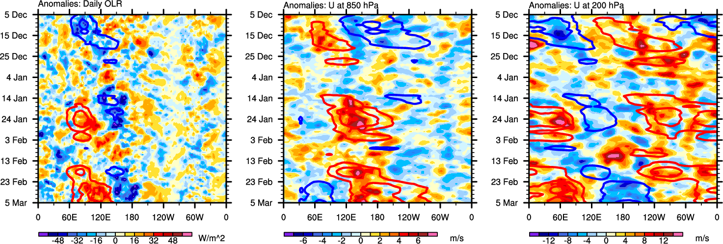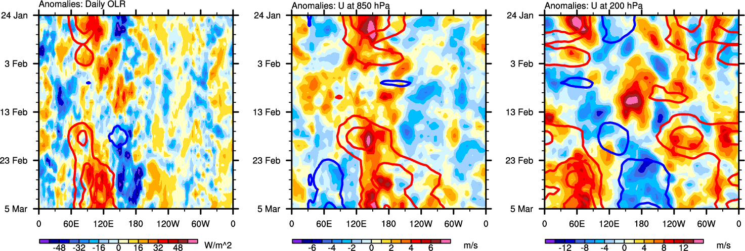 The Hovmollers show longitude-time plots for OLR, U-850, and U-200. The shading indicates the observed anomalies, while the contours are the projection of those anomalies onto the RMM EOFs.