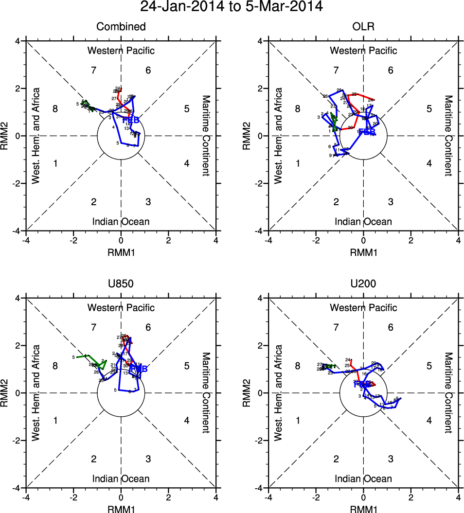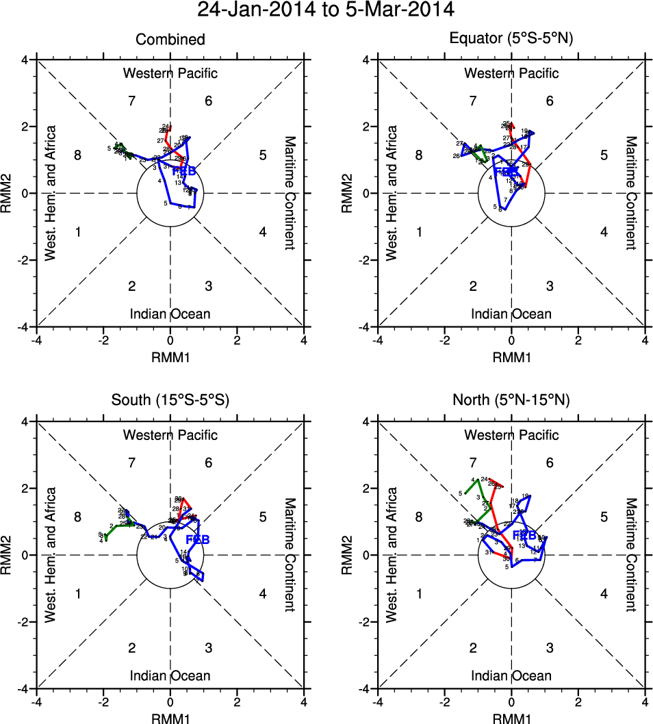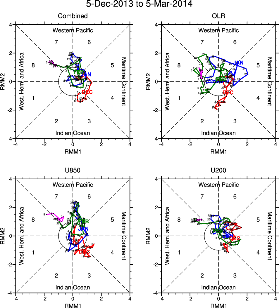 Wheeler and Hendon (2004) constructed the RMM index for monitoring the MJO. This index consists of the first two principal components (PCs) of OLR, 850-hPa zonal wind, and 200-hPa zonal wind averaged 15S-15N.