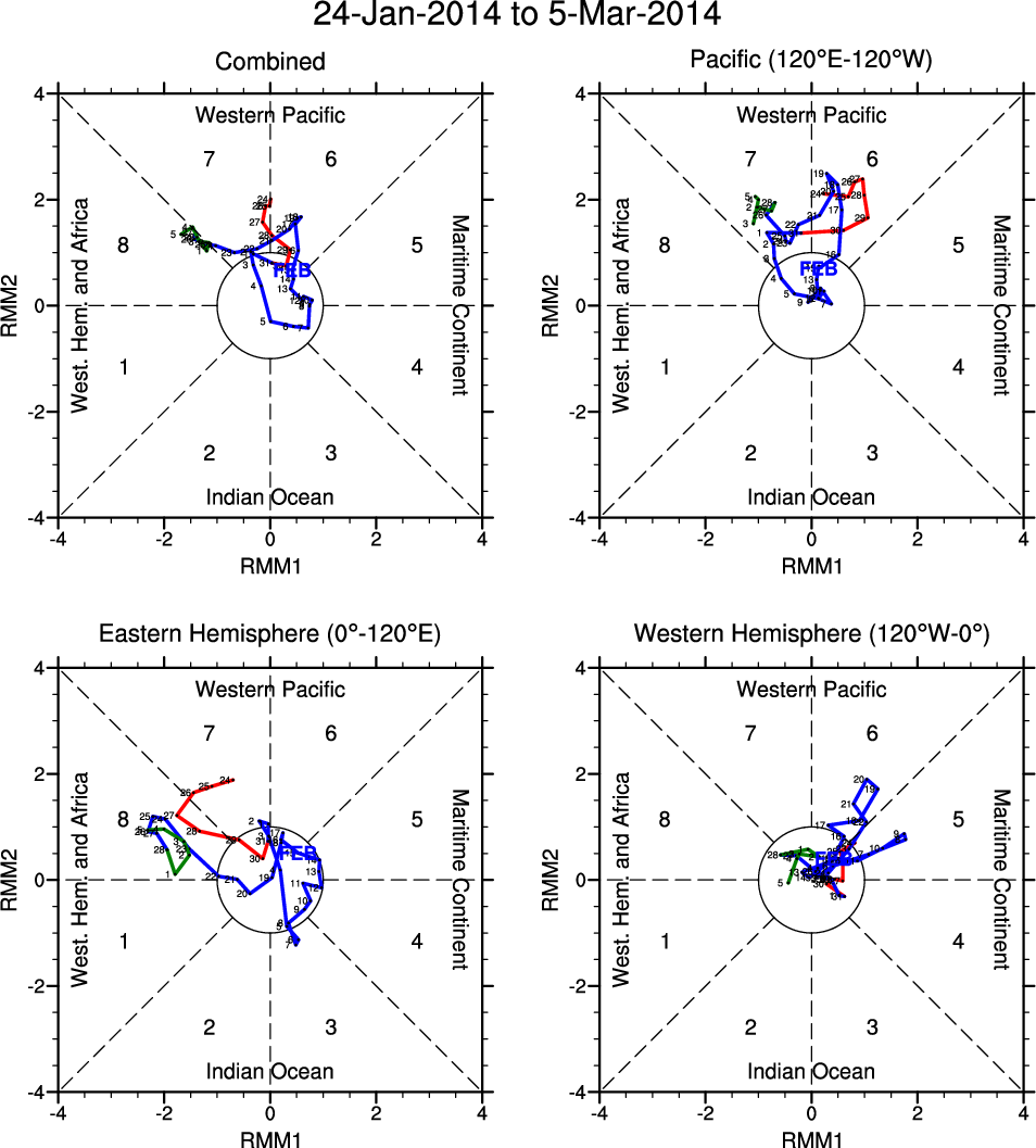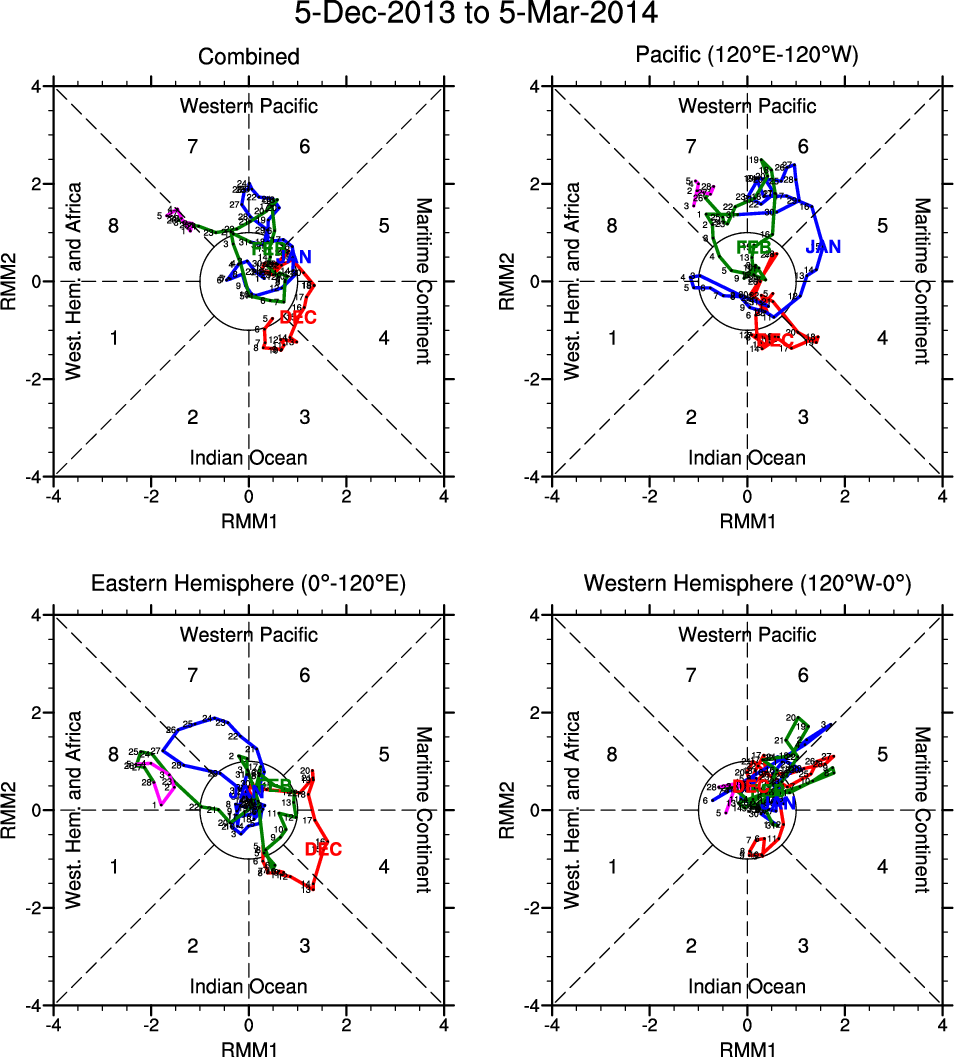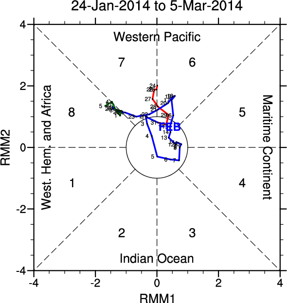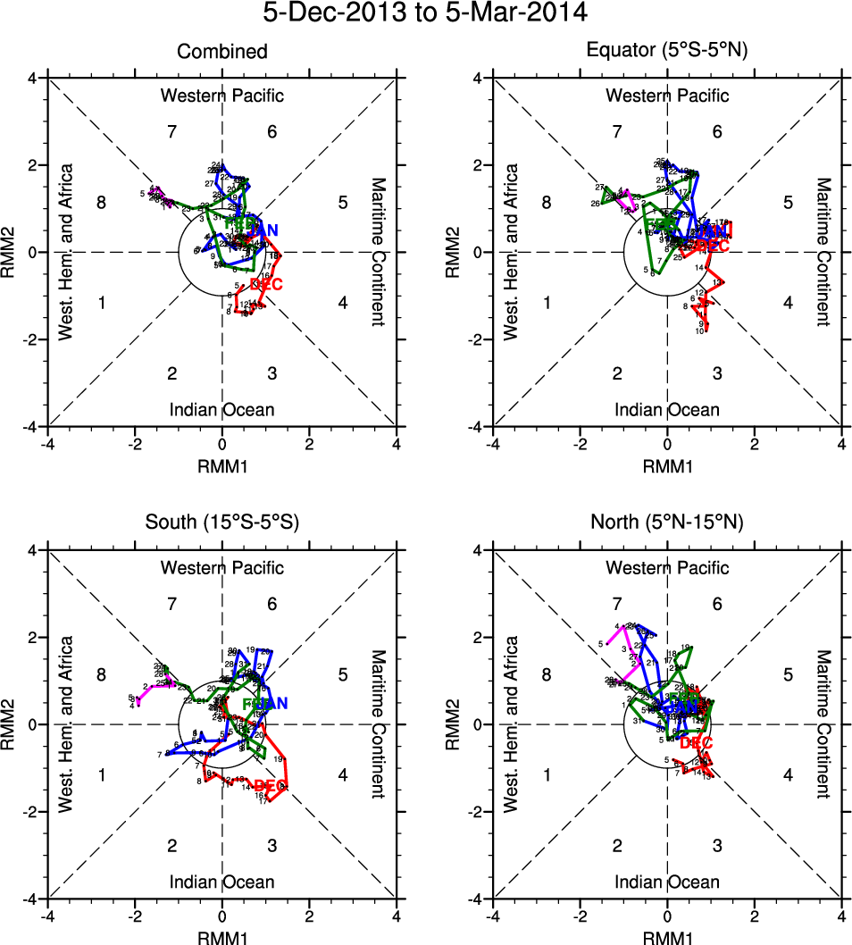 Wheeler and Hendon (2004) constructed the RMM index for monitoring the MJO. This index consists of the first two principal components (PCs) of OLR, 850-hPa zonal wind, and 200-hPa zonal wind averaged 15S-15N.