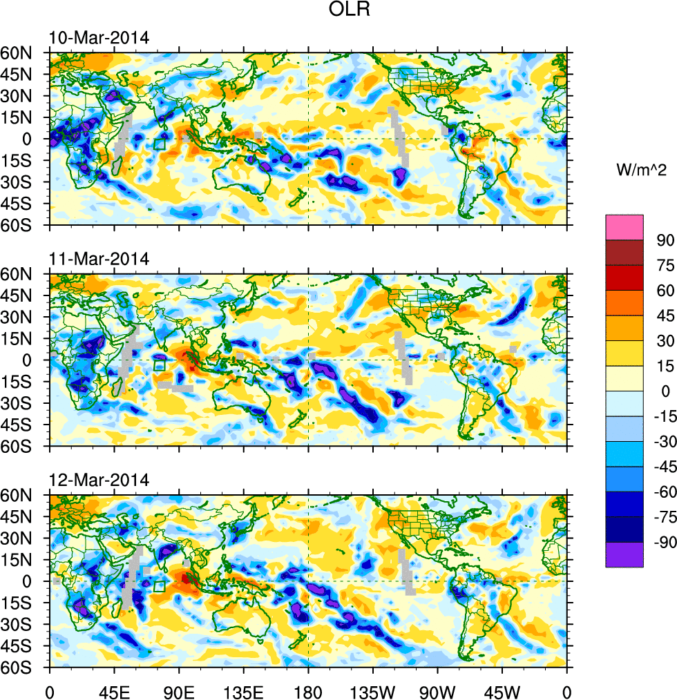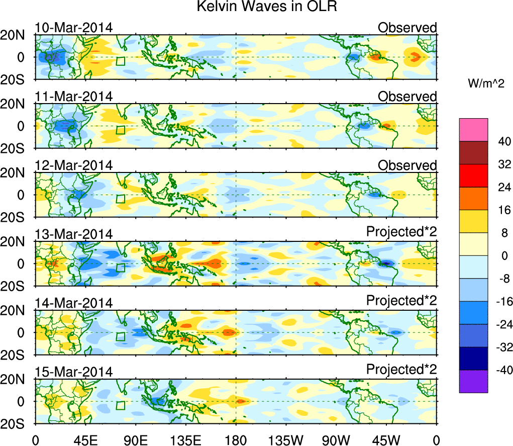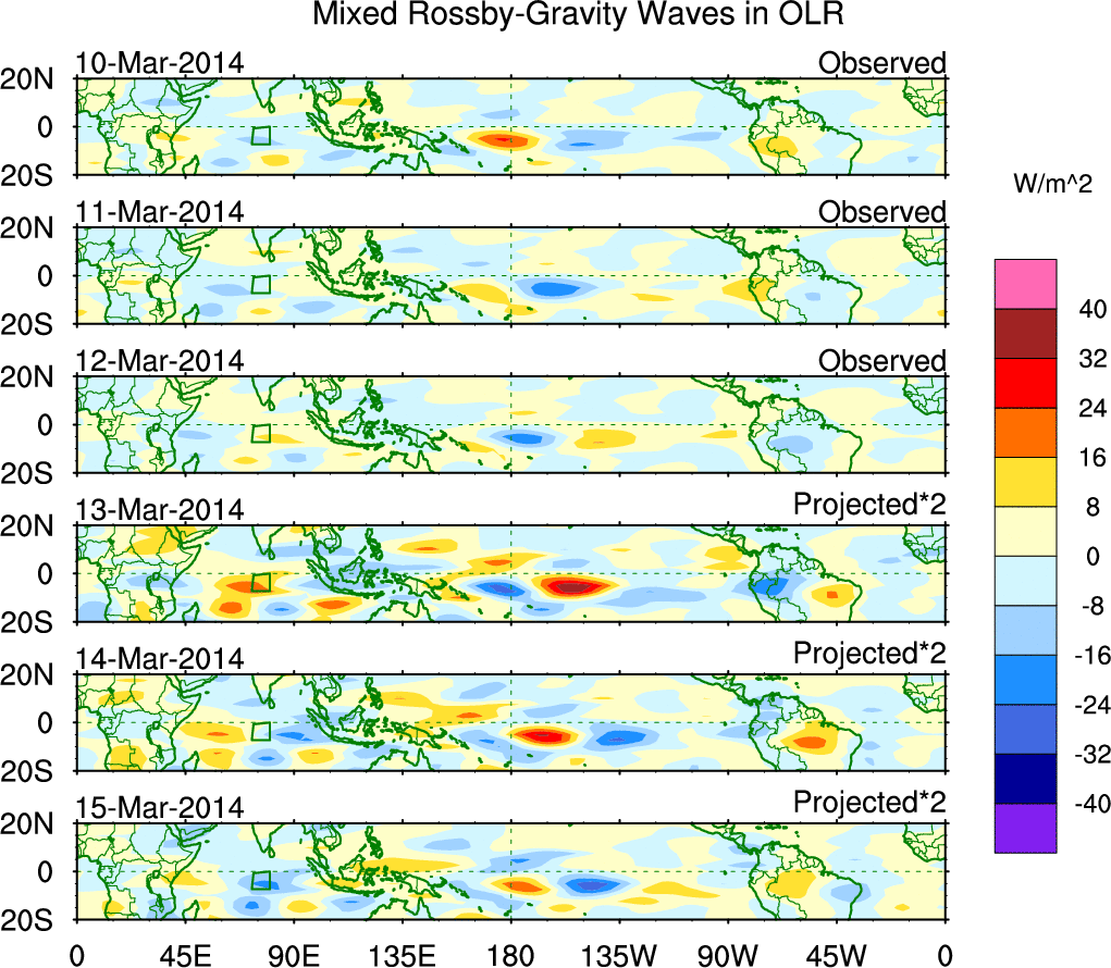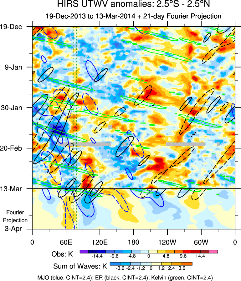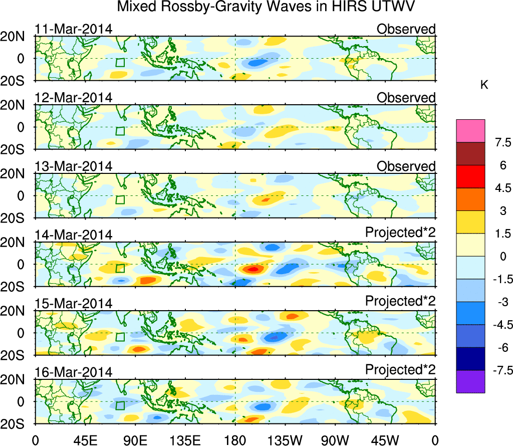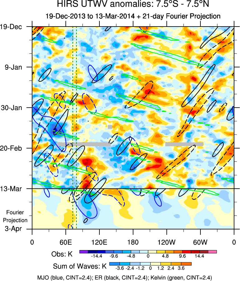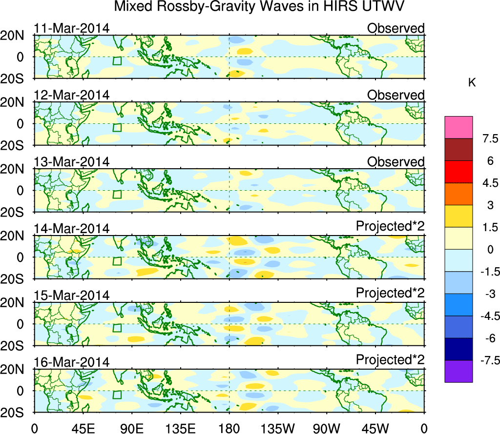 To identify tropical waves in near real-time, the OLR and UTWV data are filtered following Wheeler & Weickmann (2001 MWR). The daily anomalies are calculated using the first 3 harmonics of the seasonal cycle for 1979–2009. Missing values are then filled using linear interpolation in space and time. The most recent 365 days of anomalies are padded with 659 days of zeroes, and the result is filtered for each wave type.