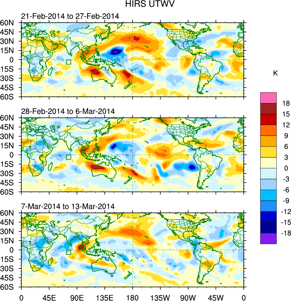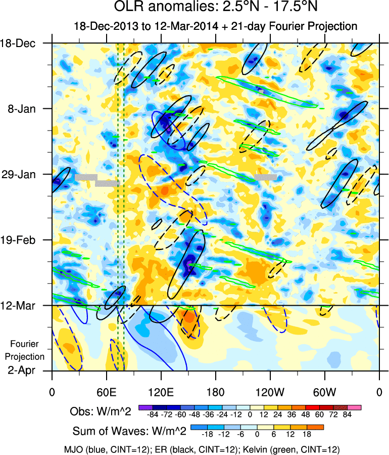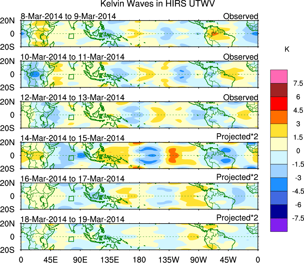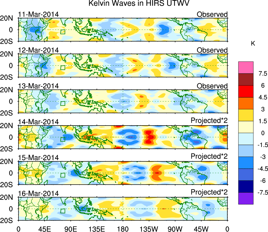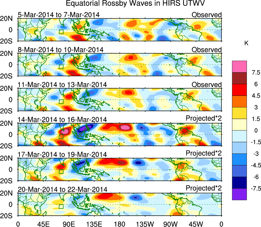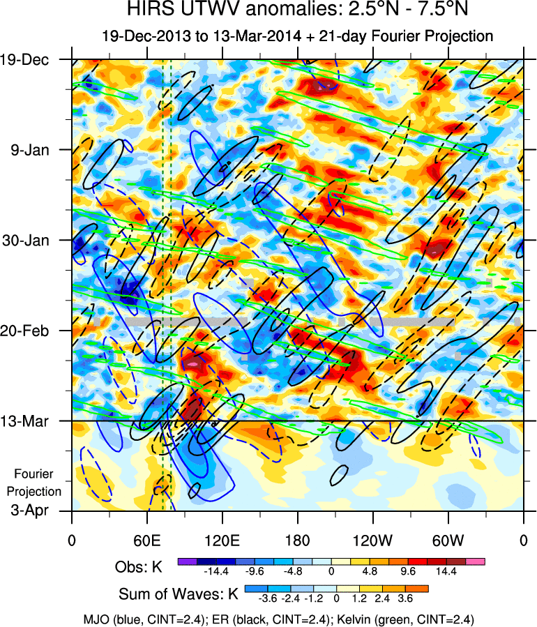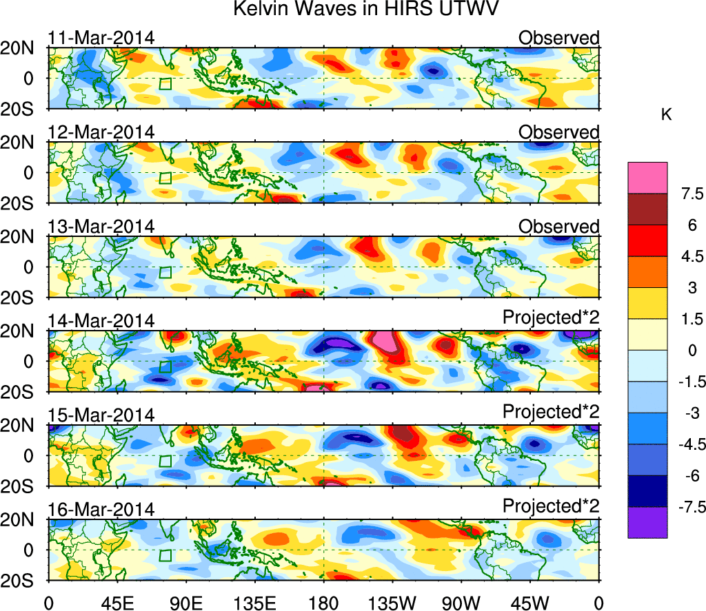 To identify tropical waves in near real-time, the OLR and UTWV data are filtered following Wheeler & Weickmann (2001 MWR). The daily anomalies are calculated using the first 3 harmonics of the seasonal cycle for 1979–2009. Missing values are then filled using linear interpolation in space and time. The most recent 365 days of anomalies are padded with 659 days of zeroes, and the result is filtered for each wave type.