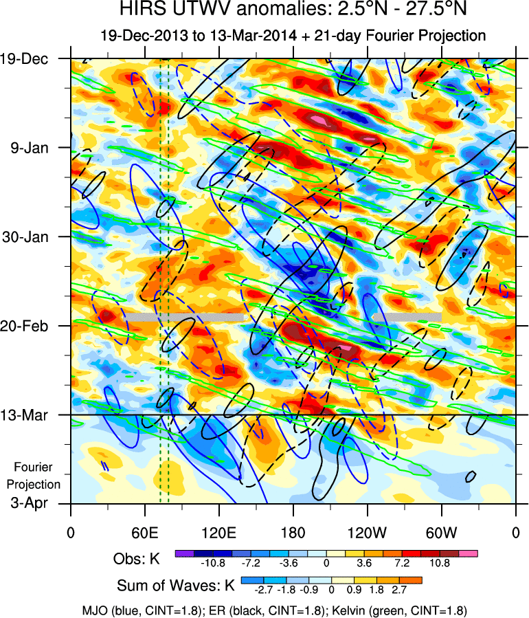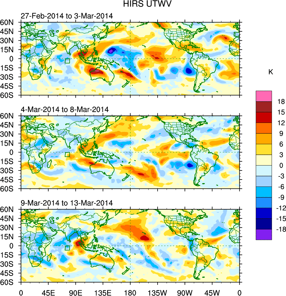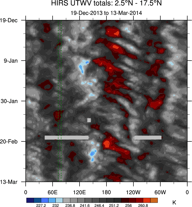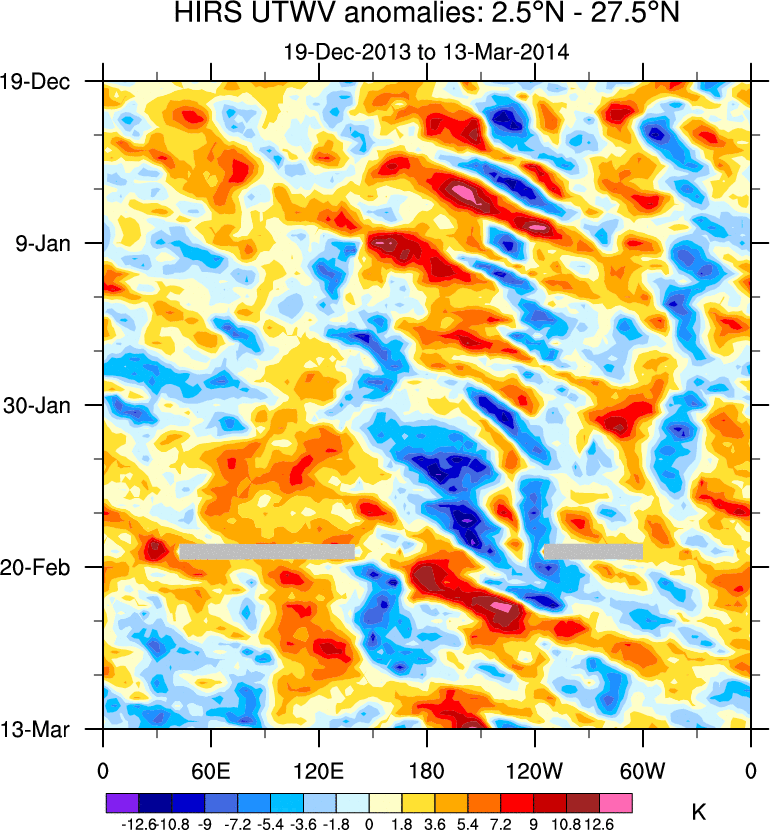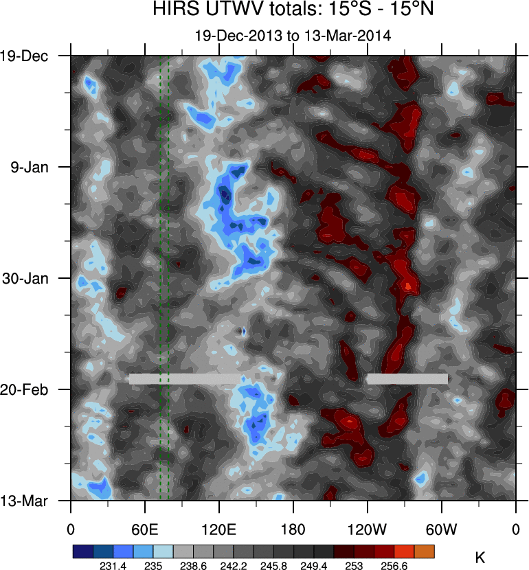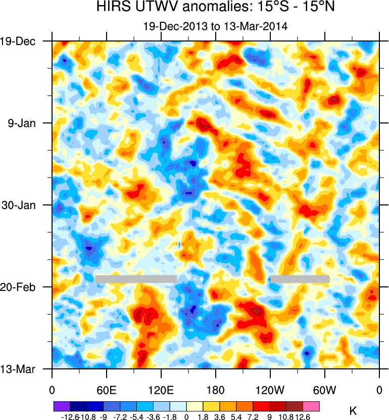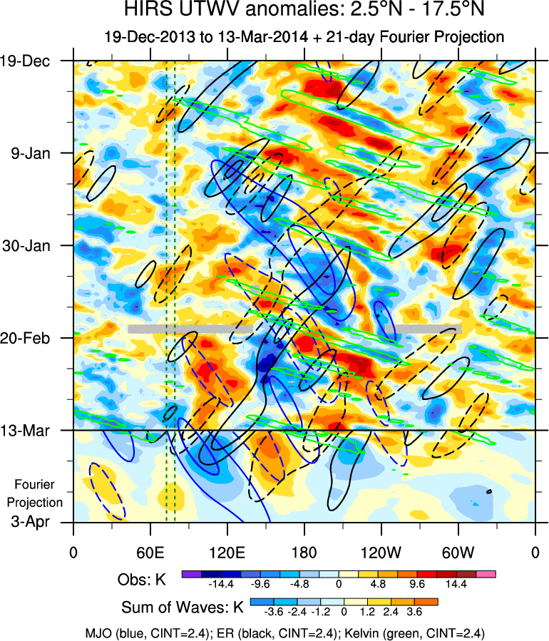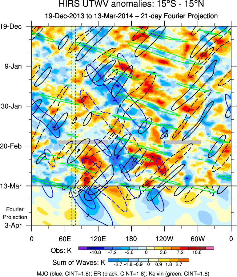 To identify tropical waves in near real-time, the OLR and UTWV data are filtered following Wheeler & Weickmann (2001 MWR). The daily anomalies are calculated using the first 3 harmonics of the seasonal cycle for 1979–2009. Missing values are then filled using linear interpolation in space and time. The most recent 365 days of anomalies are padded with 659 days of zeroes, and the result is filtered for each wave type.
