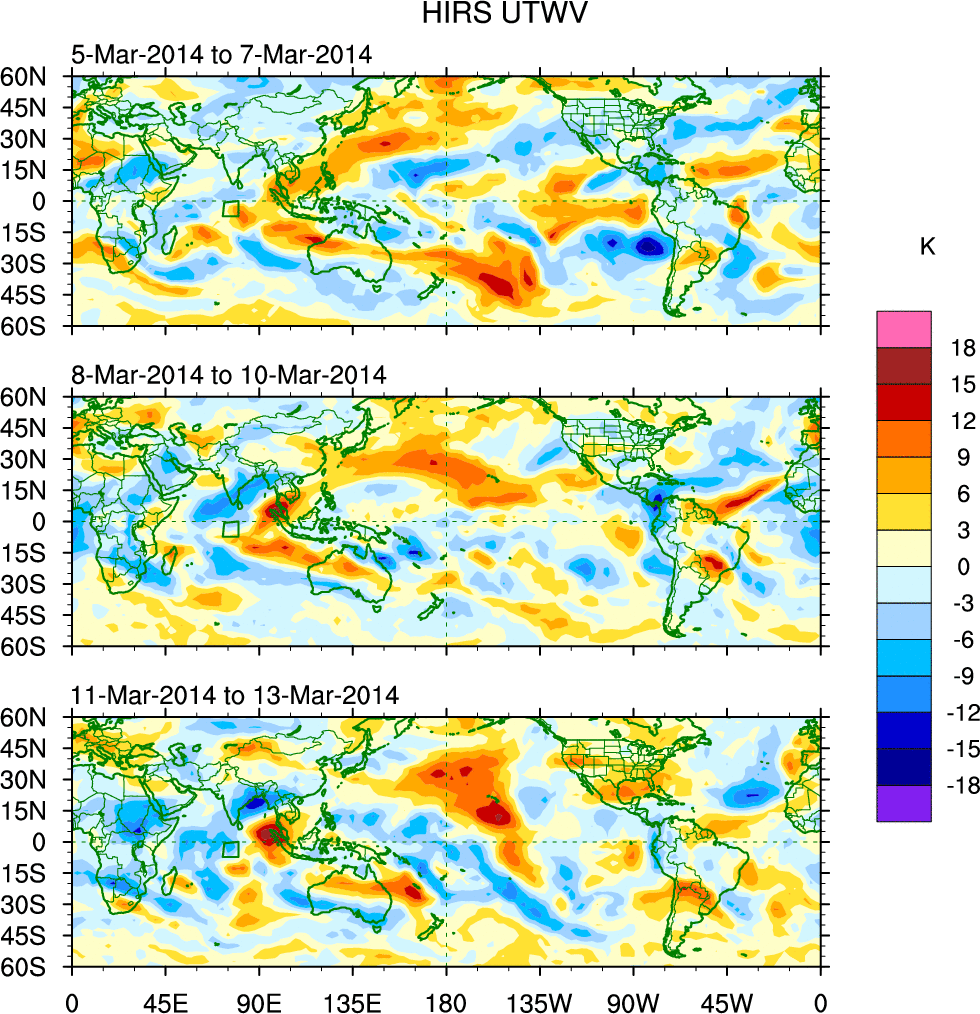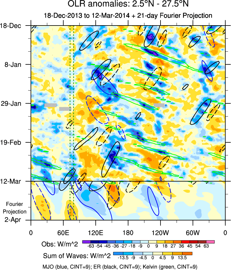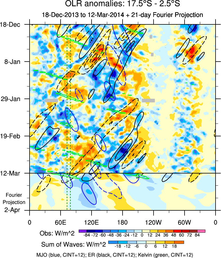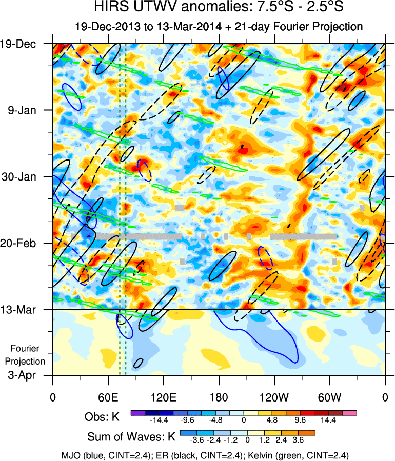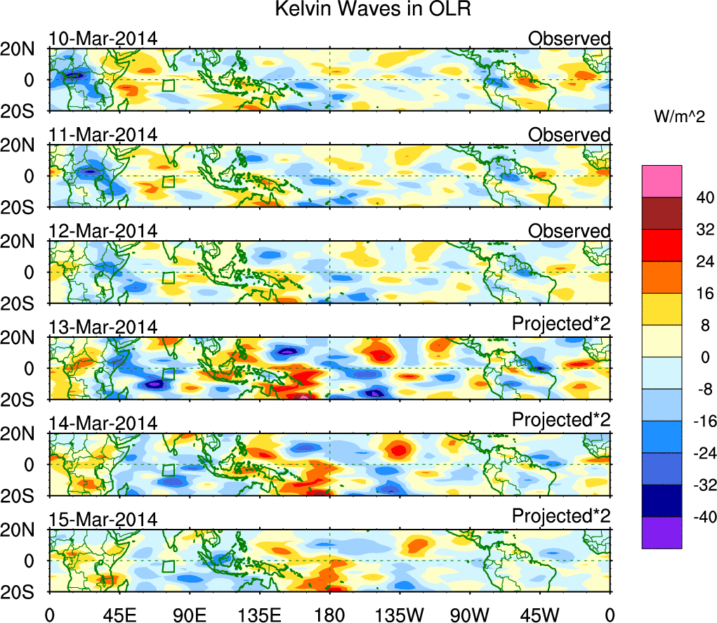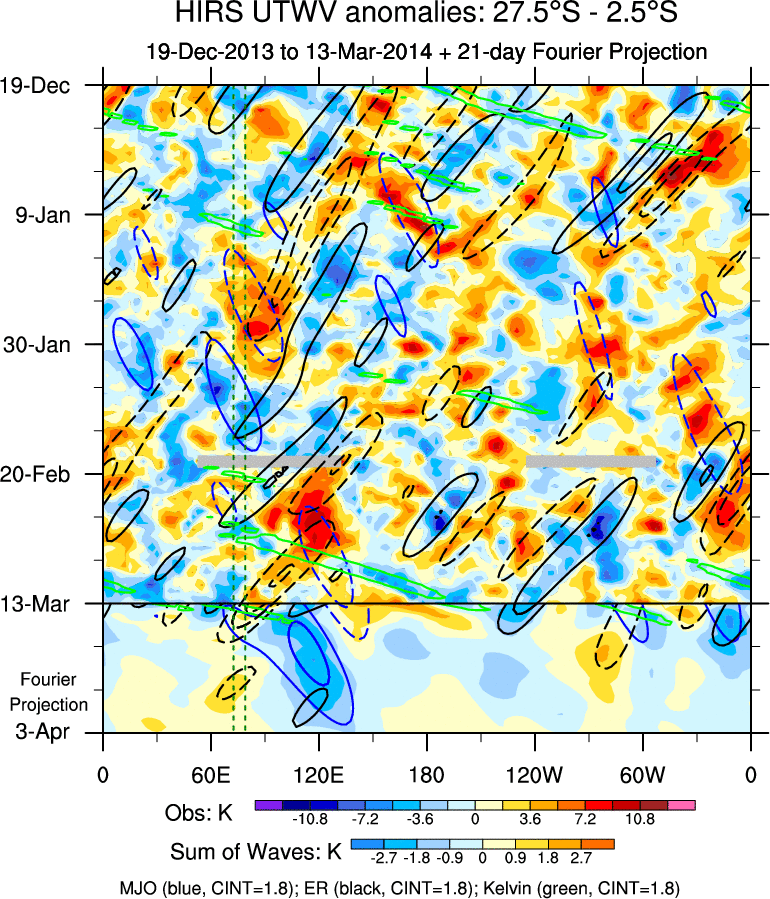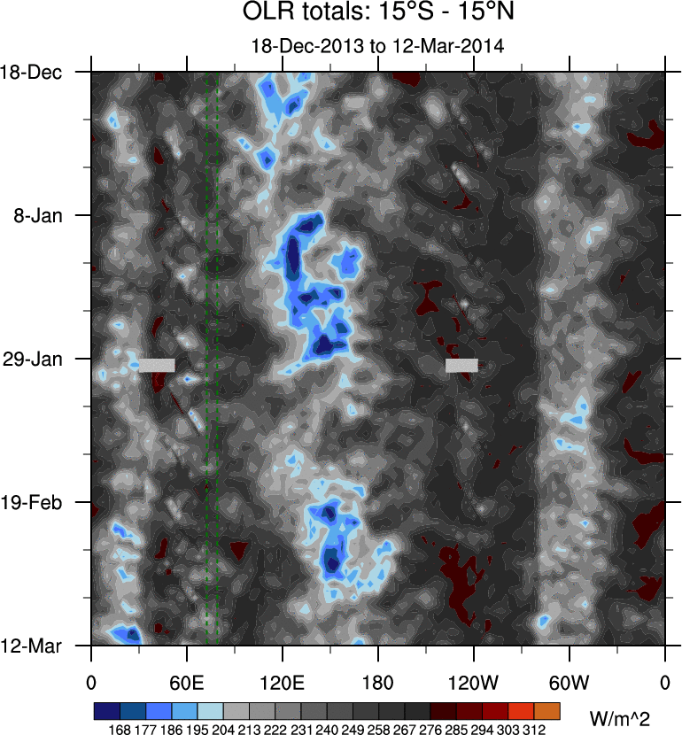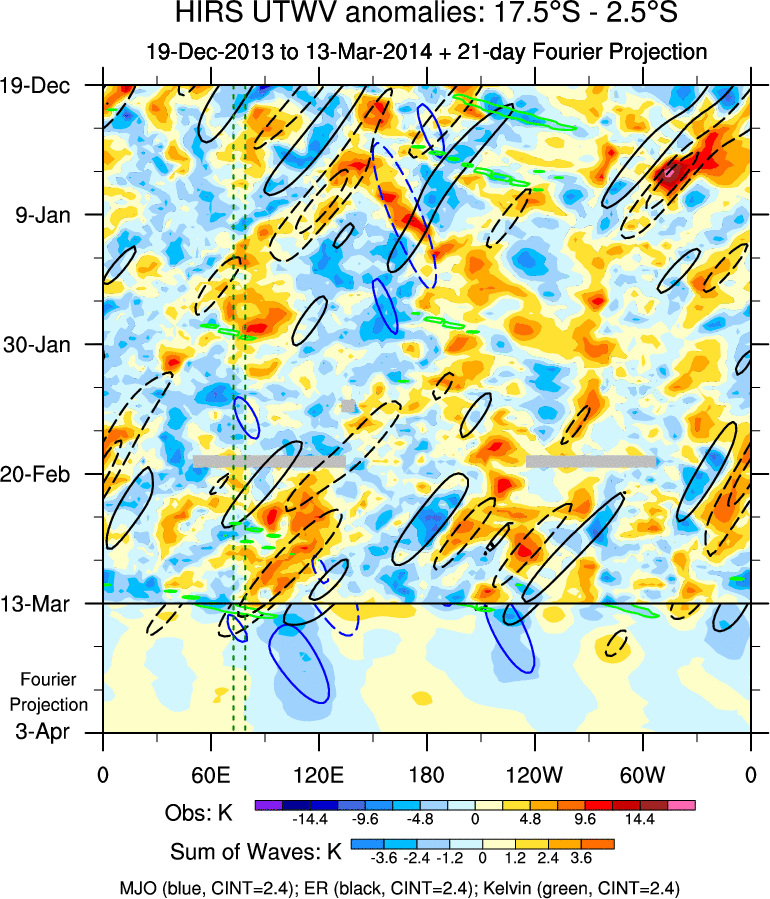 To identify tropical waves in near real-time, the OLR and UTWV data are filtered following Wheeler & Weickmann (2001 MWR). The daily anomalies are calculated using the first 3 harmonics of the seasonal cycle for 1979–2009. Missing values are then filled using linear interpolation in space and time. The most recent 365 days of anomalies are padded with 659 days of zeroes, and the result is filtered for each wave type.