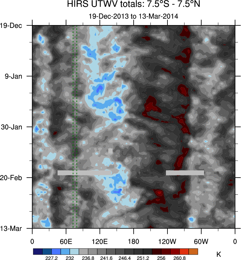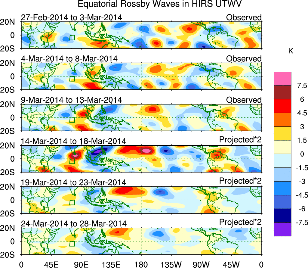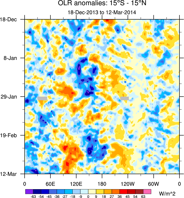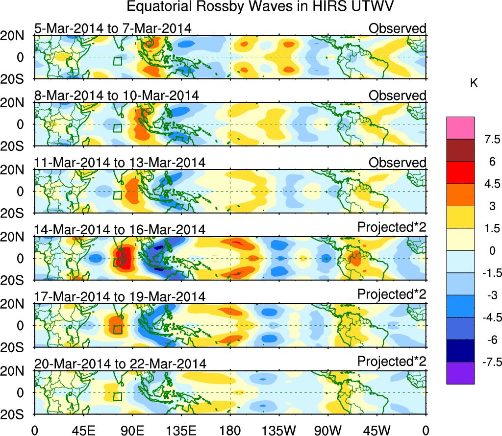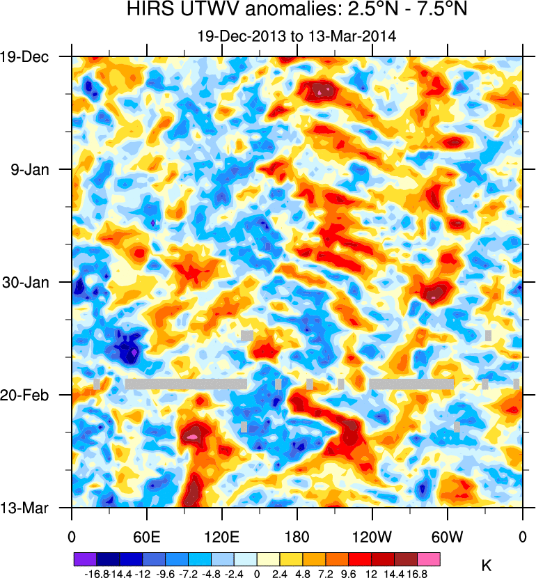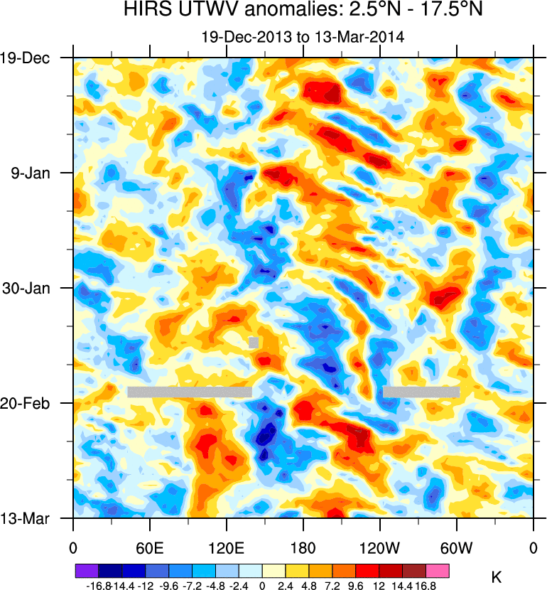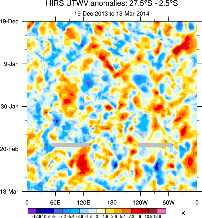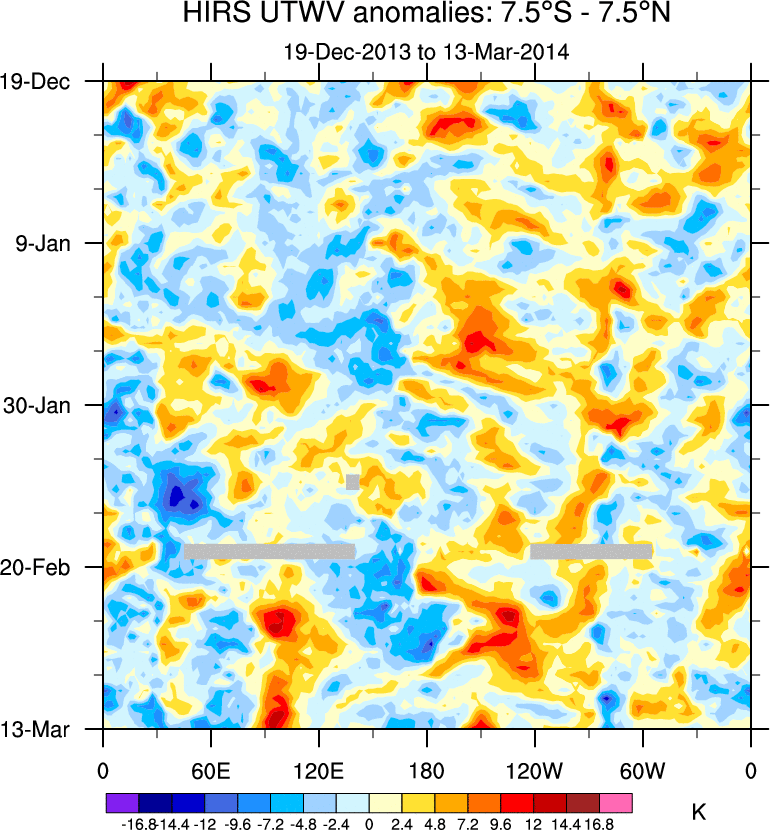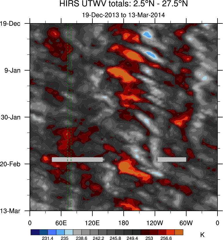 To identify tropical waves in near real-time, the OLR and UTWV data are filtered following Wheeler & Weickmann (2001 MWR). The daily anomalies are calculated using the first 3 harmonics of the seasonal cycle for 1979–2009. Missing values are then filled using linear interpolation in space and time. The most recent 365 days of anomalies are padded with 659 days of zeroes, and the result is filtered for each wave type.
