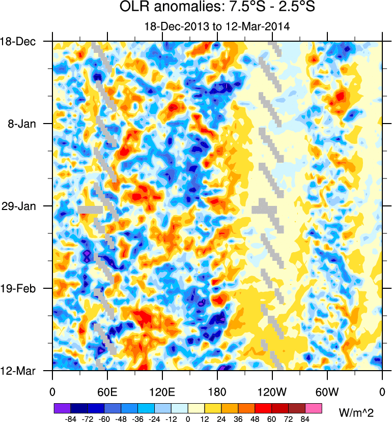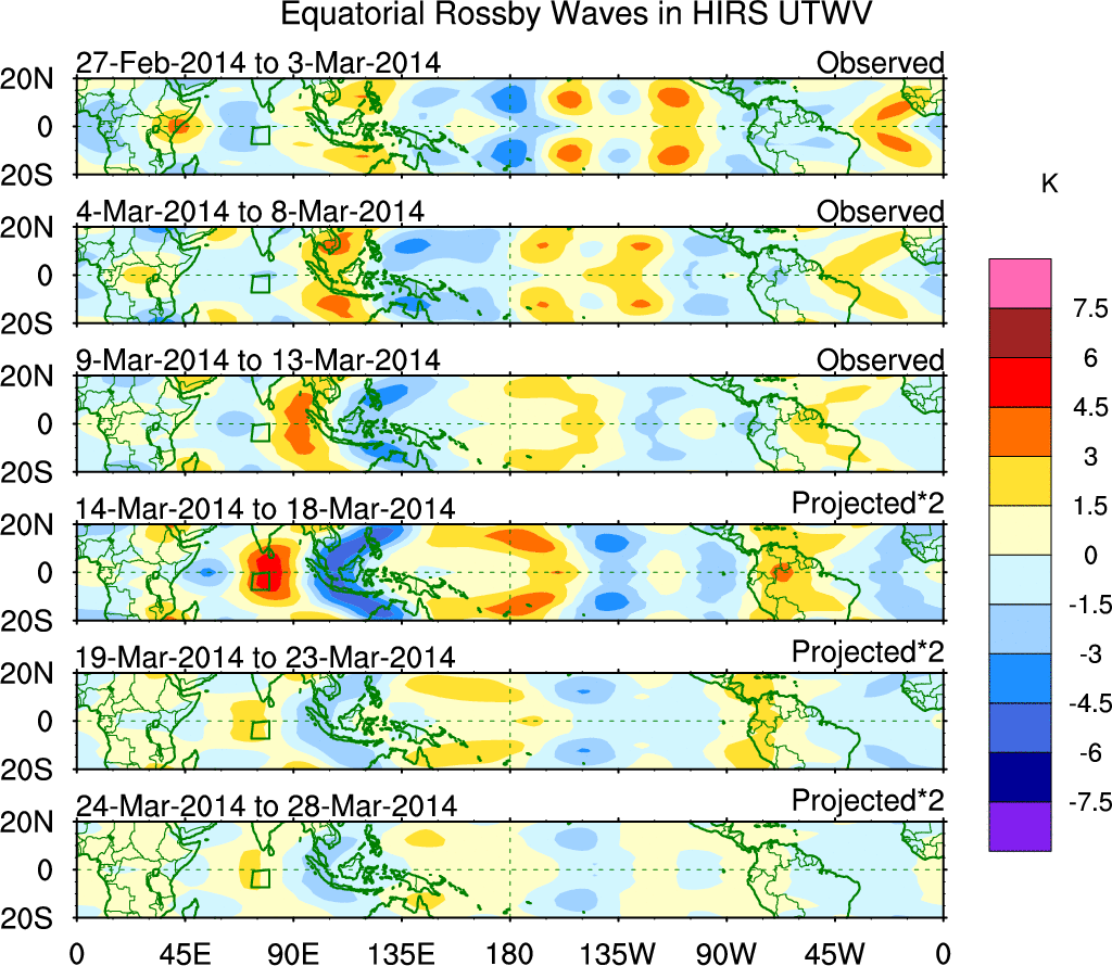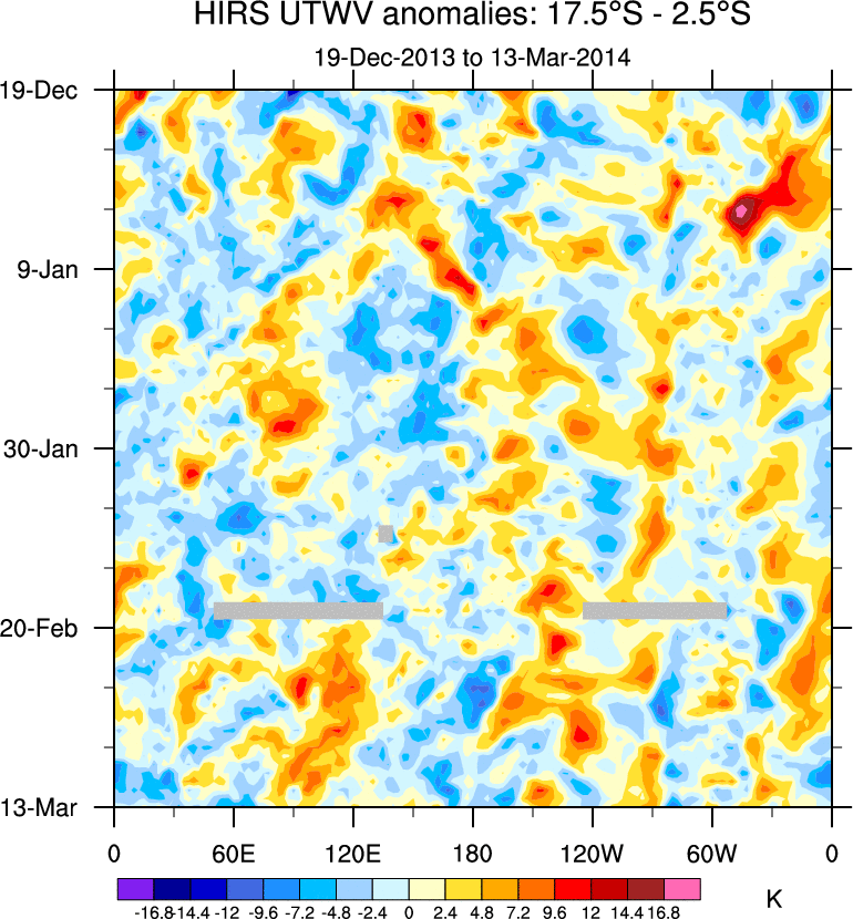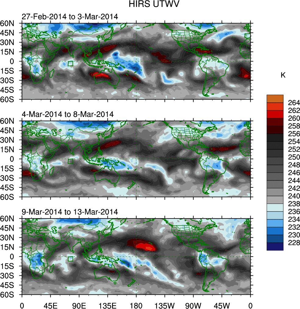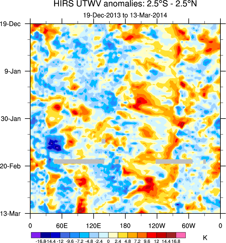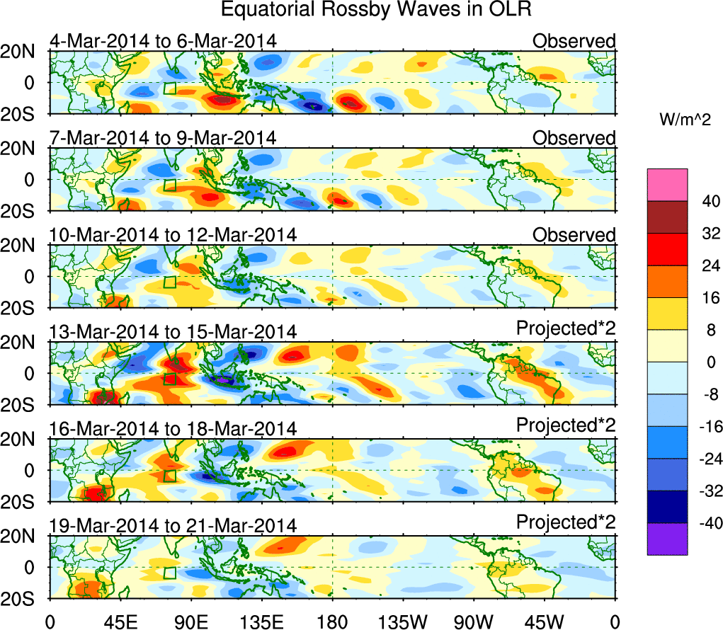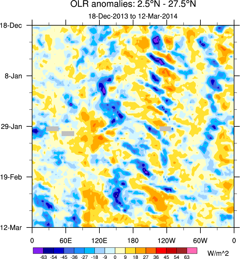 To identify tropical waves in near real-time, the OLR and UTWV data are filtered following Wheeler & Weickmann (2001 MWR). The daily anomalies are calculated using the first 3 harmonics of the seasonal cycle for 1979–2009. Missing values are then filled using linear interpolation in space and time. The most recent 365 days of anomalies are padded with 659 days of zeroes, and the result is filtered for each wave type.