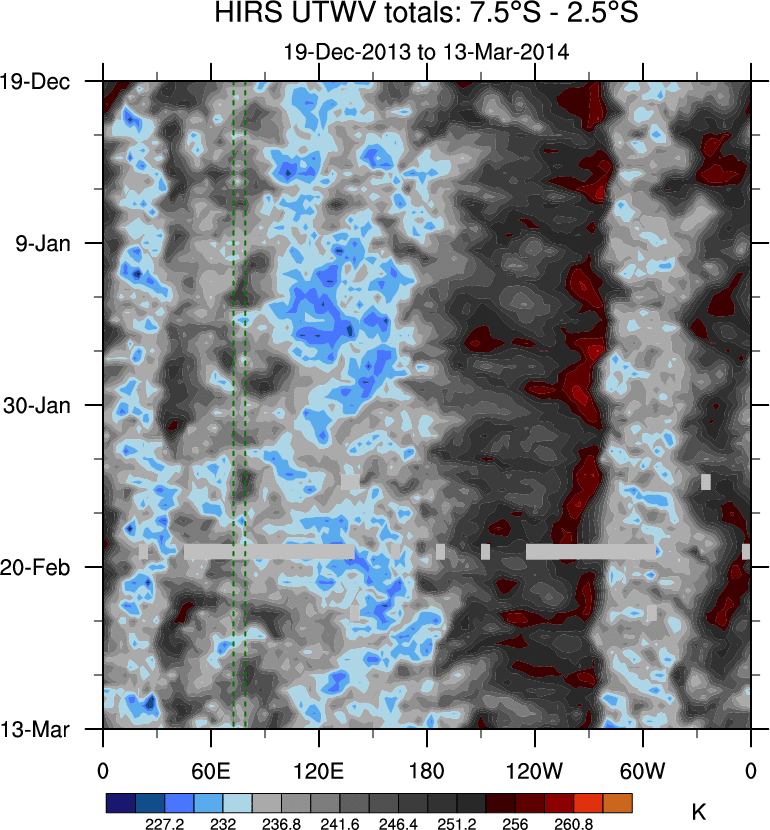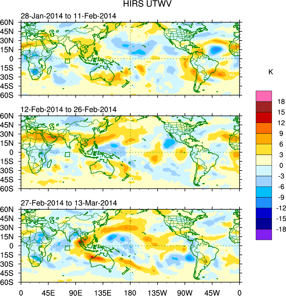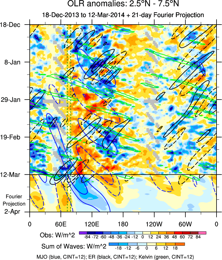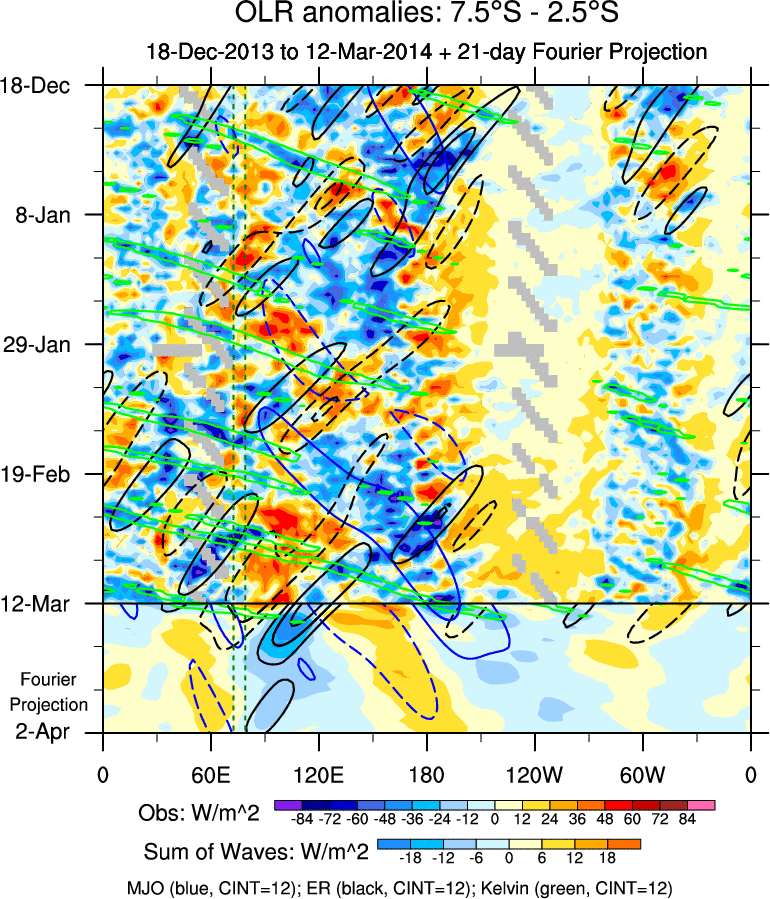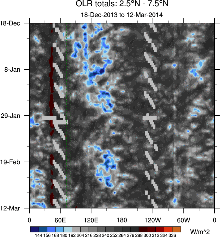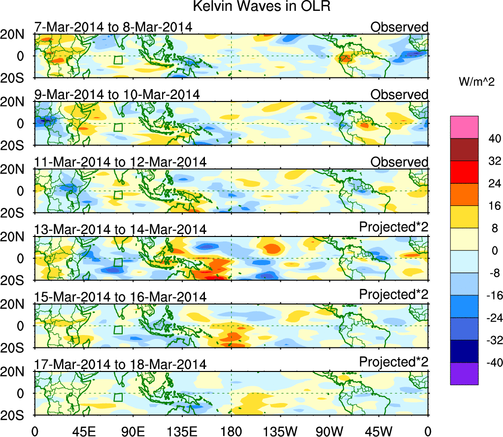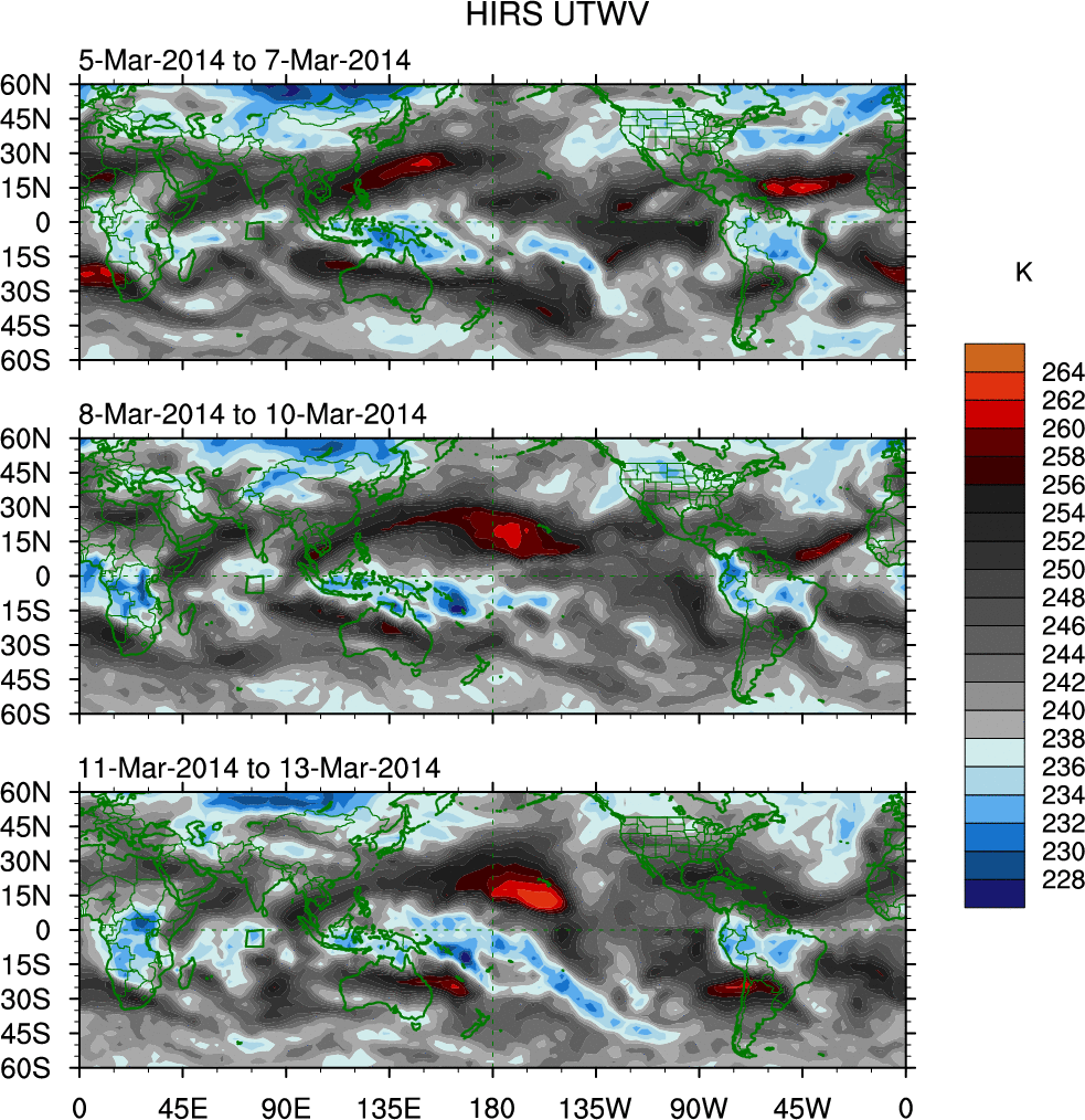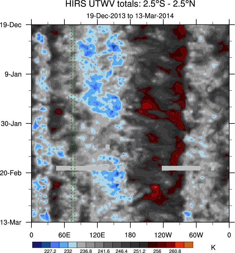 To identify tropical waves in near real-time, the OLR and UTWV data are filtered following Wheeler & Weickmann (2001 MWR). The daily anomalies are calculated using the first 3 harmonics of the seasonal cycle for 1979–2009. Missing values are then filled using linear interpolation in space and time. The most recent 365 days of anomalies are padded with 659 days of zeroes, and the result is filtered for each wave type.