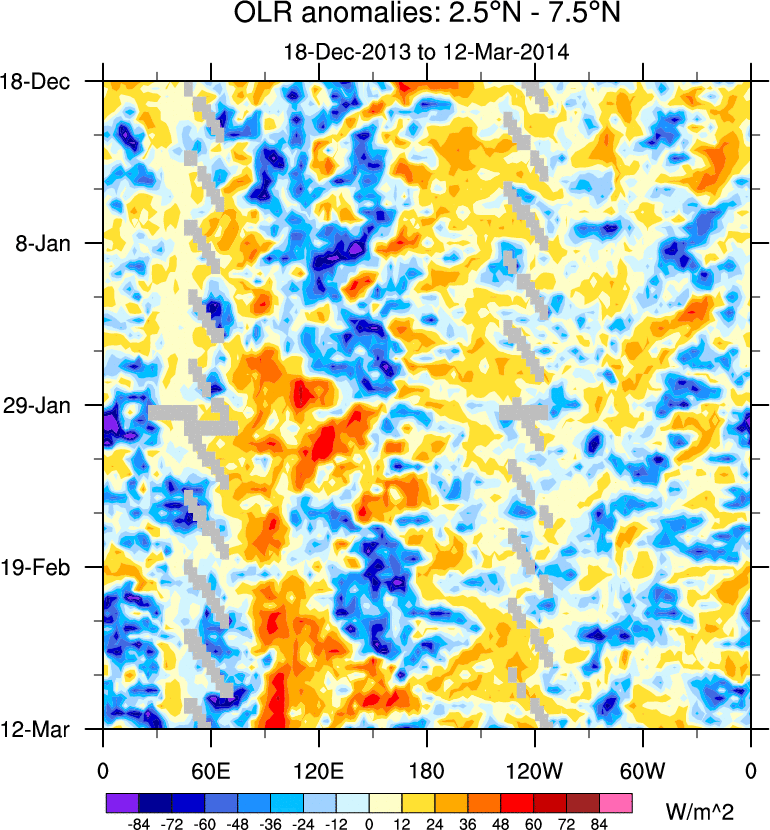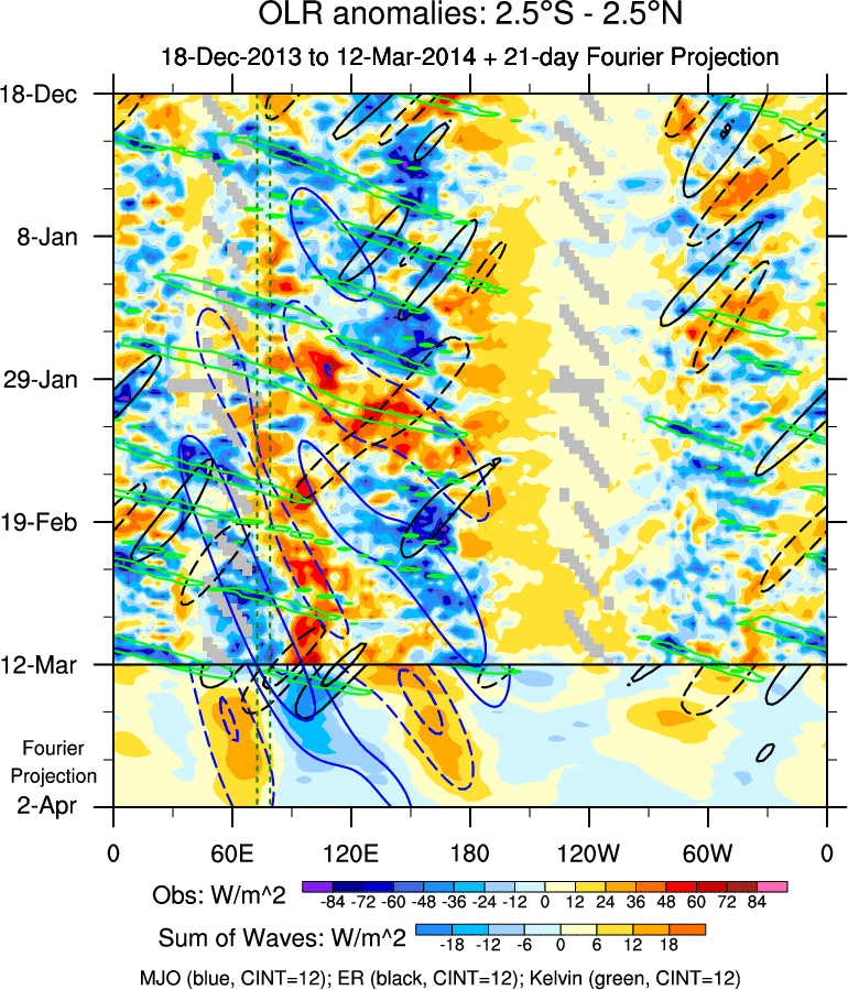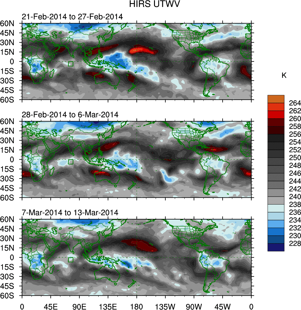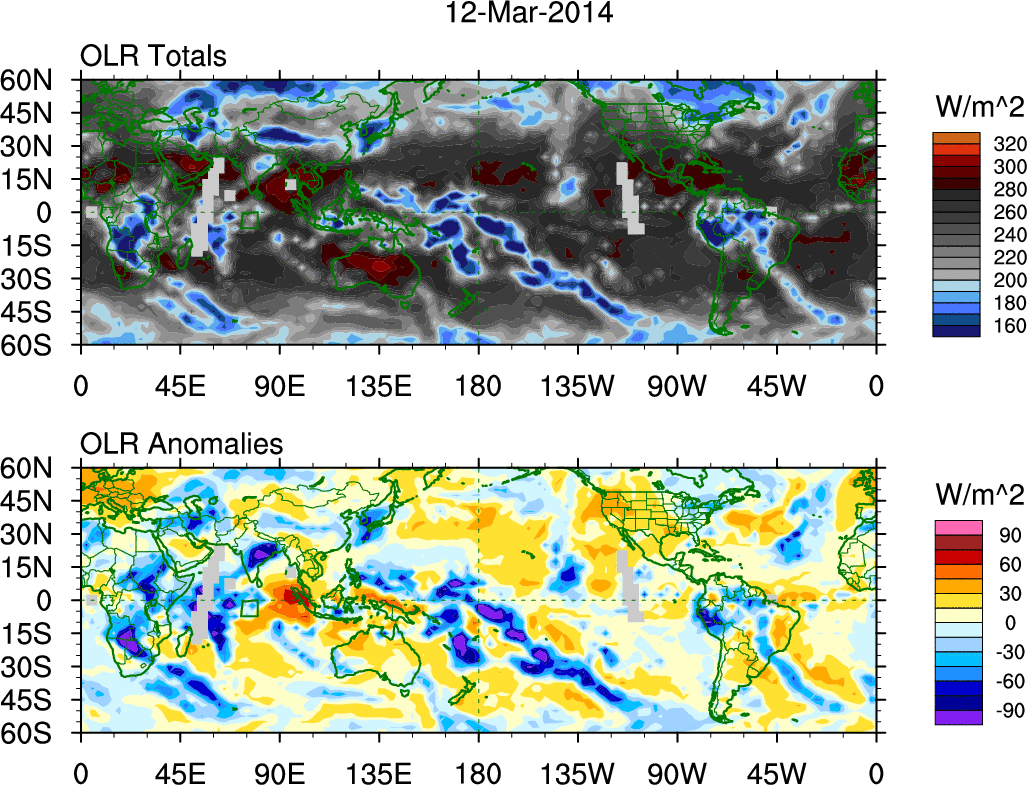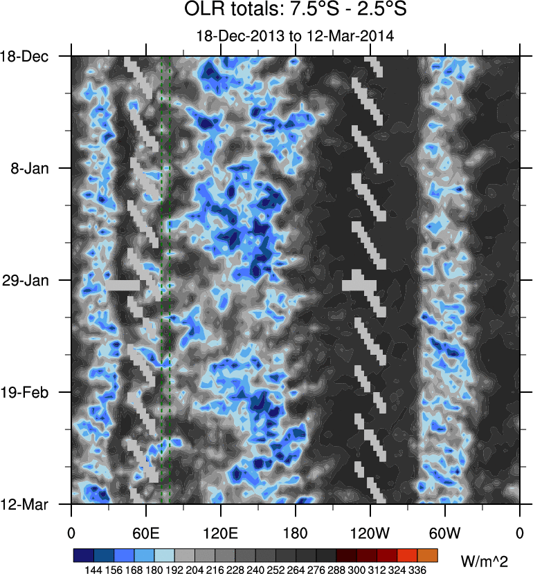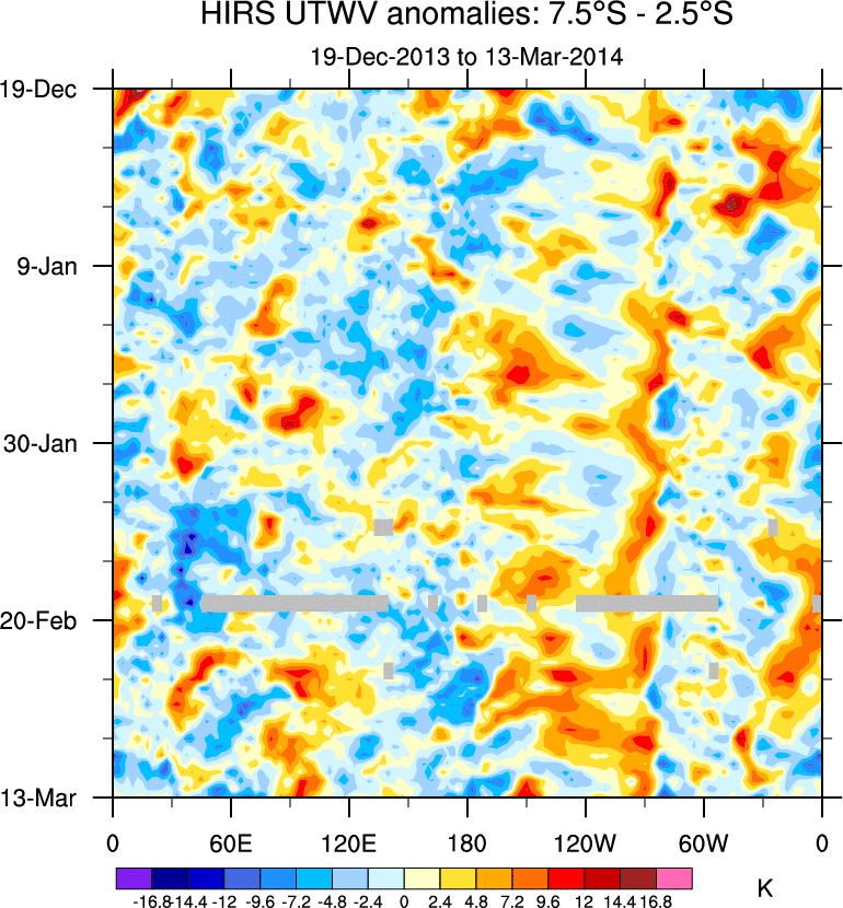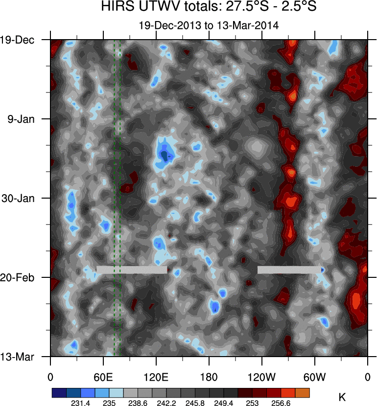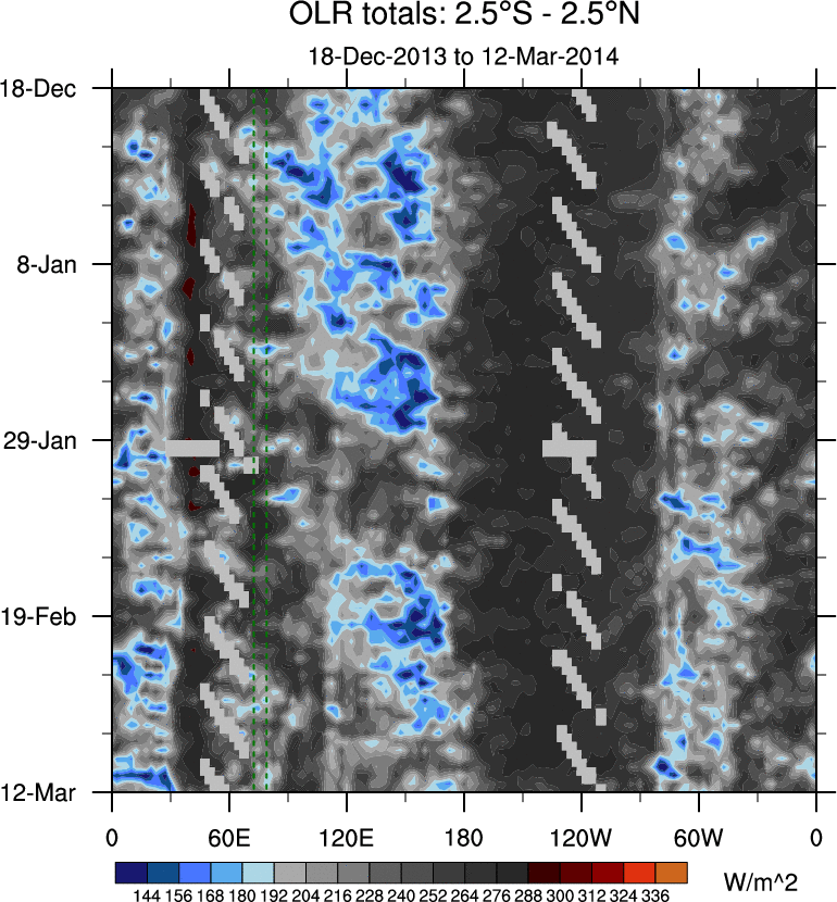To identify tropical waves in near real-time, the OLR and UTWV data are filtered following Wheeler & Weickmann (2001 MWR). The daily anomalies are calculated using the first 3 harmonics of the seasonal cycle for 1979–2009. Missing values are then filled using linear interpolation in space and time. The most recent 365 days of anomalies are padded with 659 days of zeroes, and the result is filtered for each wave type.