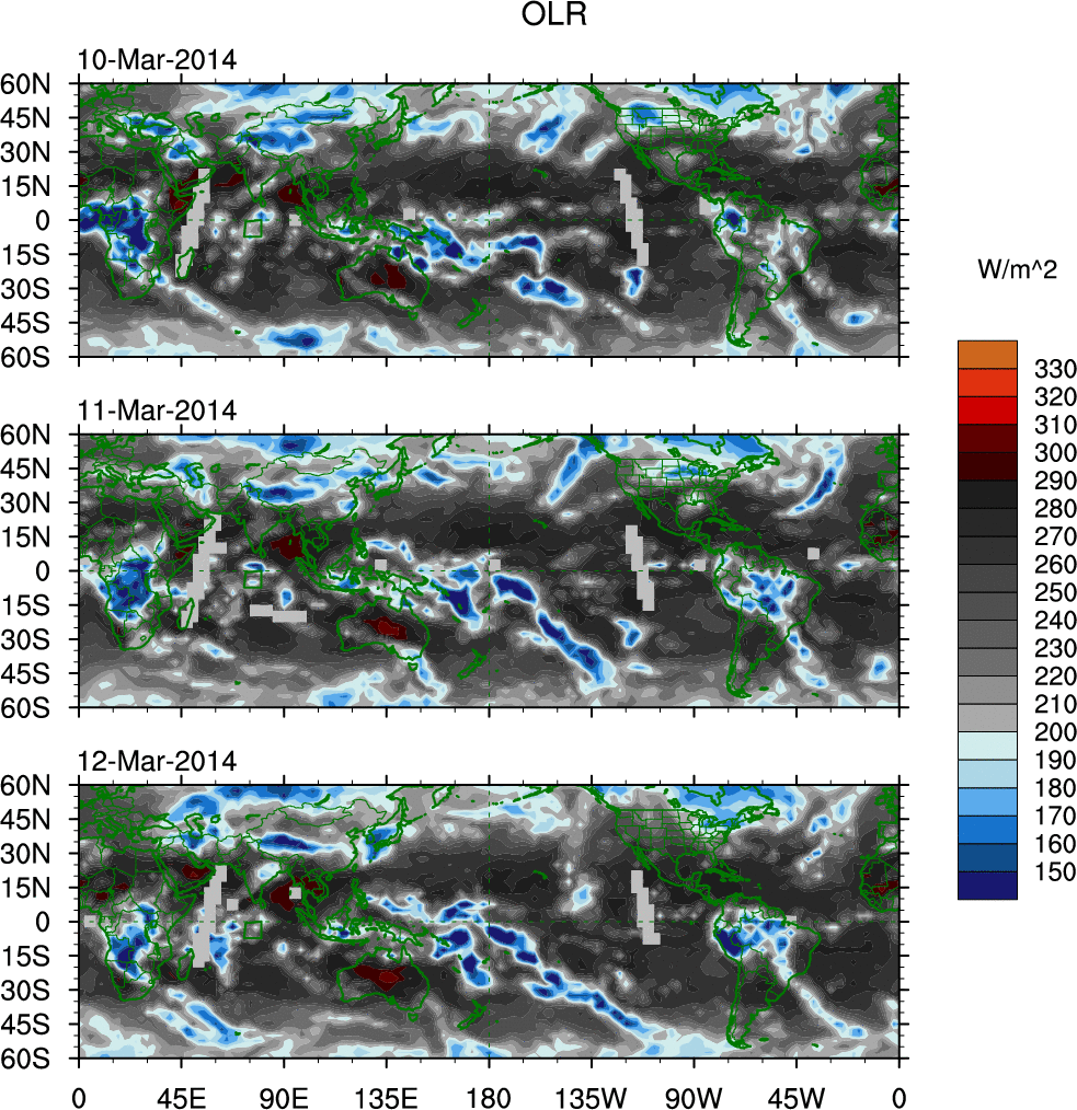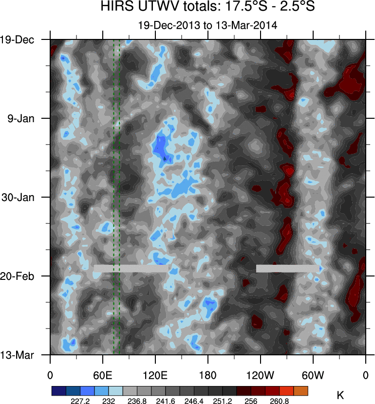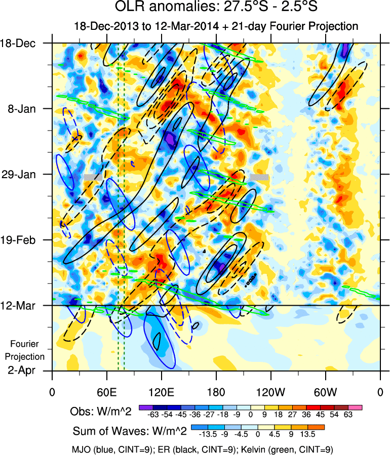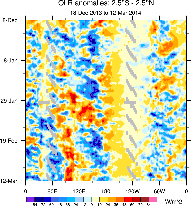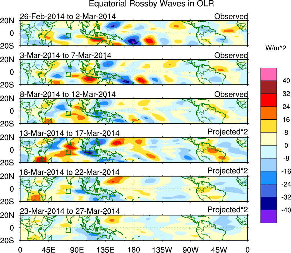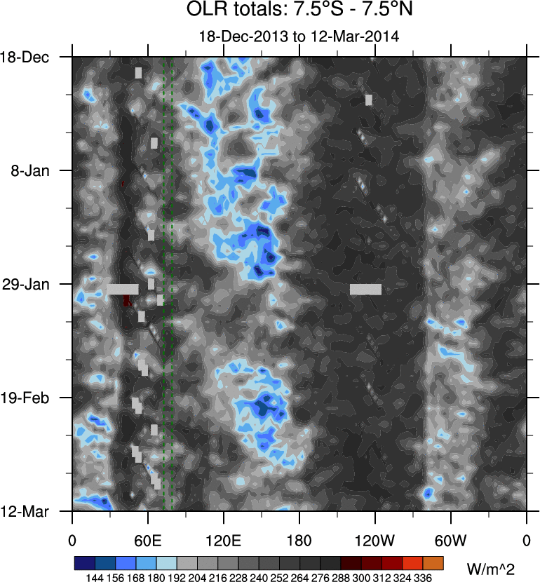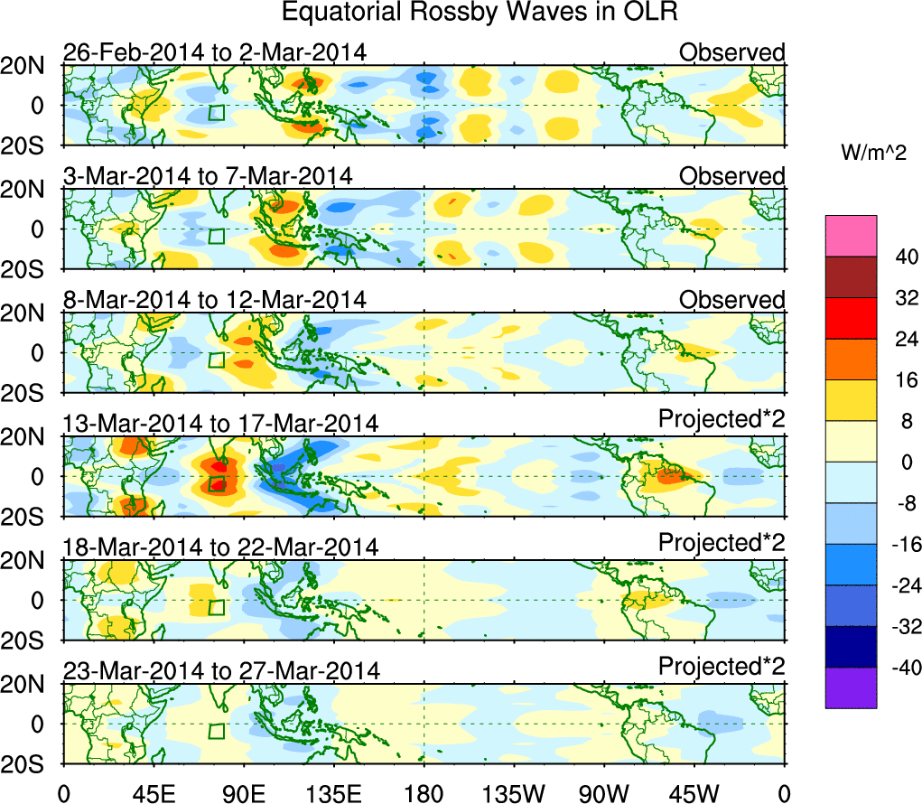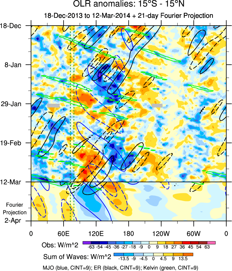 To identify tropical waves in near real-time, the OLR and UTWV data are filtered following Wheeler & Weickmann (2001 MWR). The daily anomalies are calculated using the first 3 harmonics of the seasonal cycle for 1979–2009. Missing values are then filled using linear interpolation in space and time. The most recent 365 days of anomalies are padded with 659 days of zeroes, and the result is filtered for each wave type.