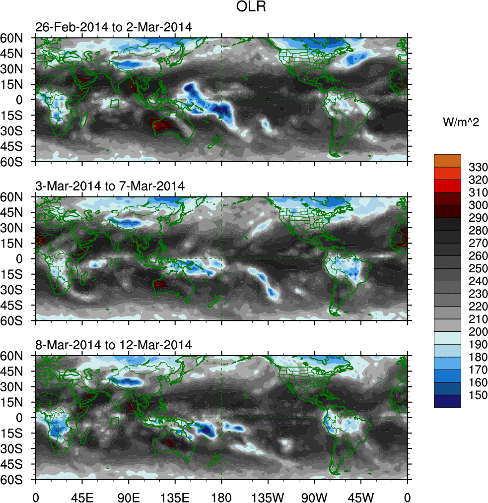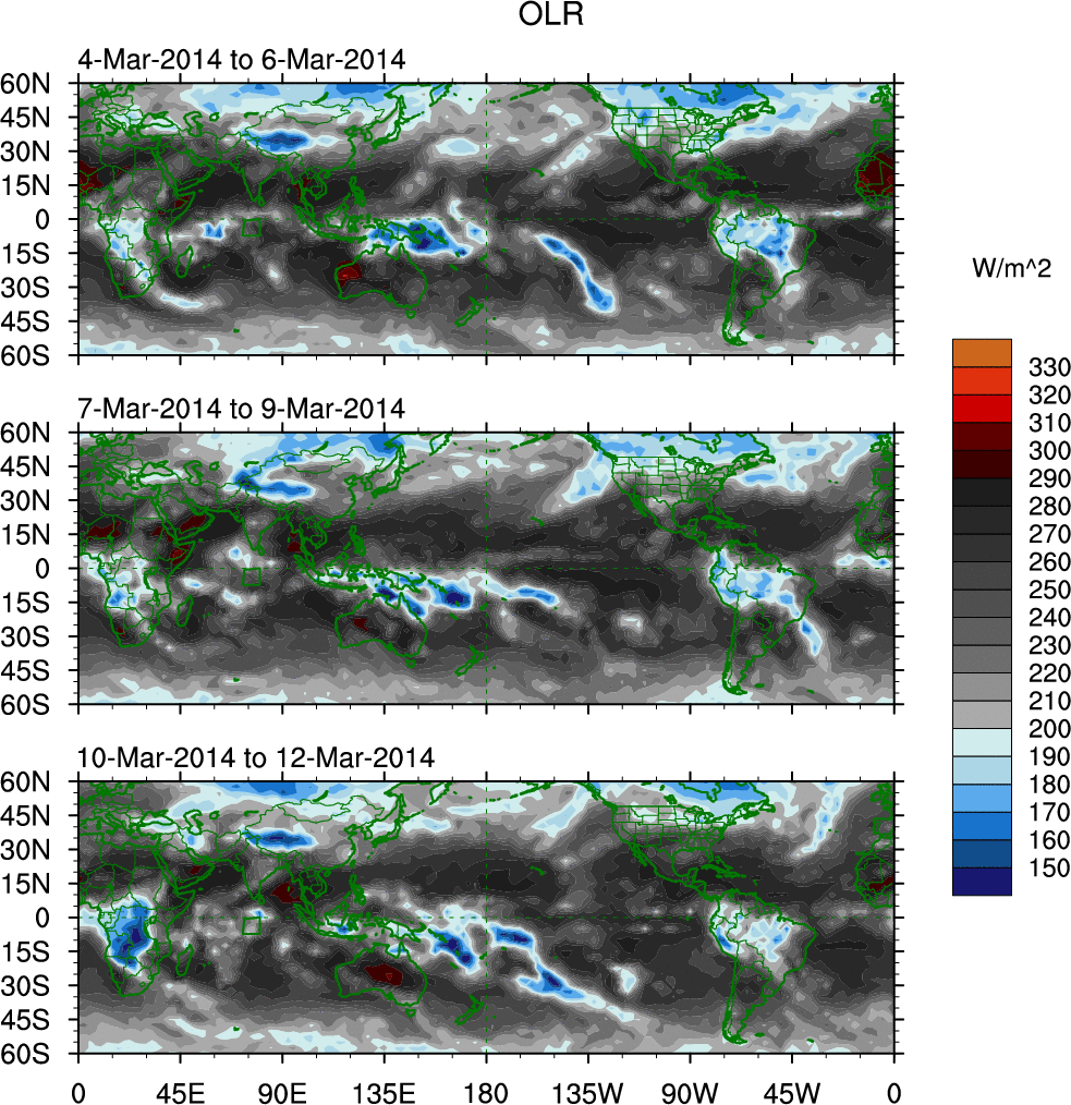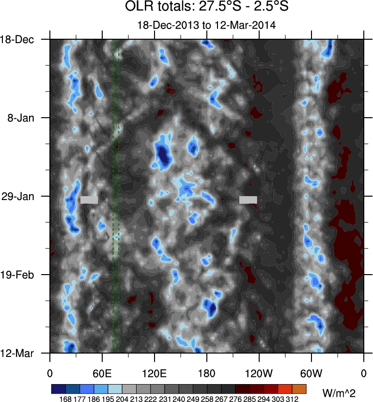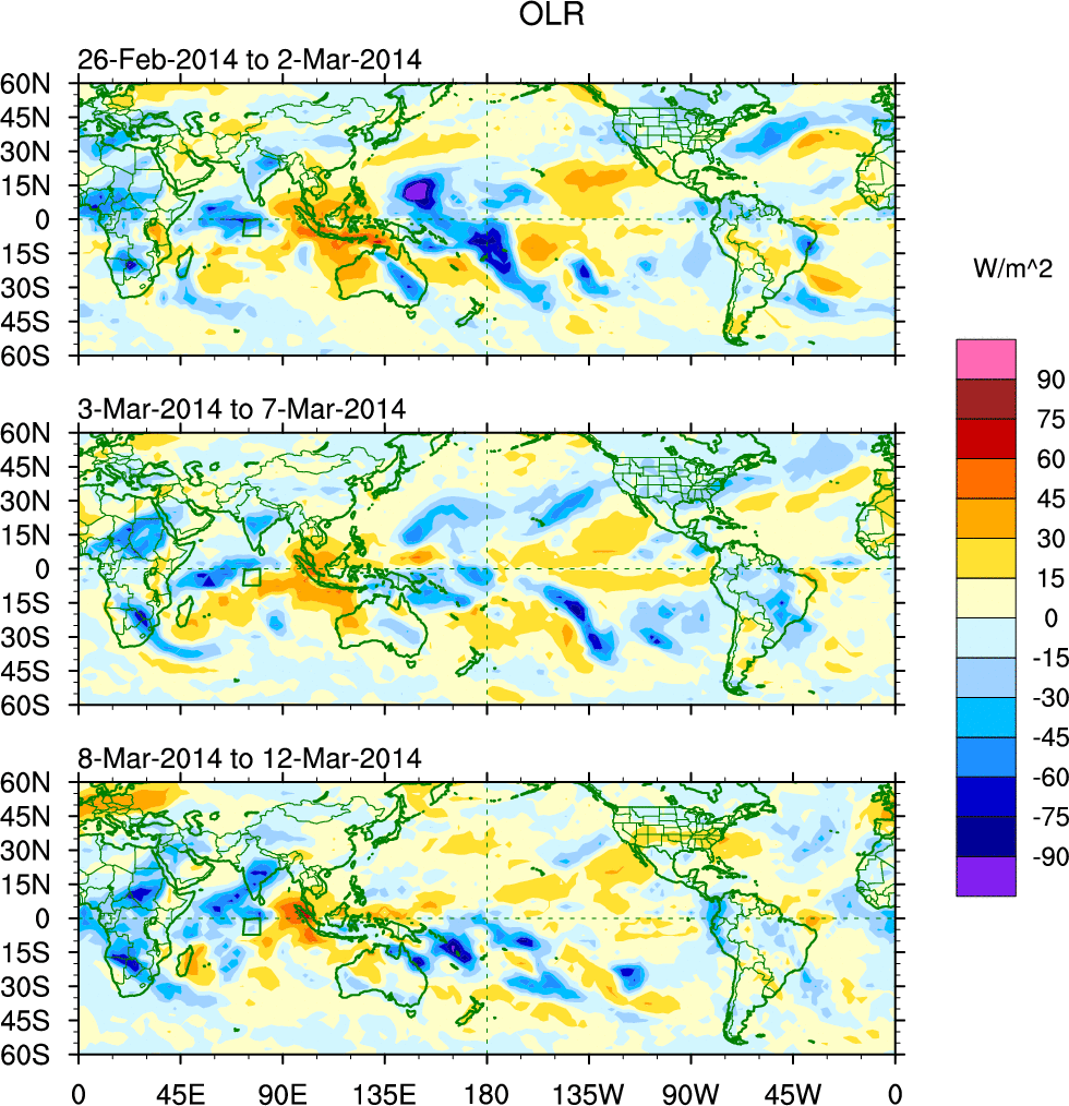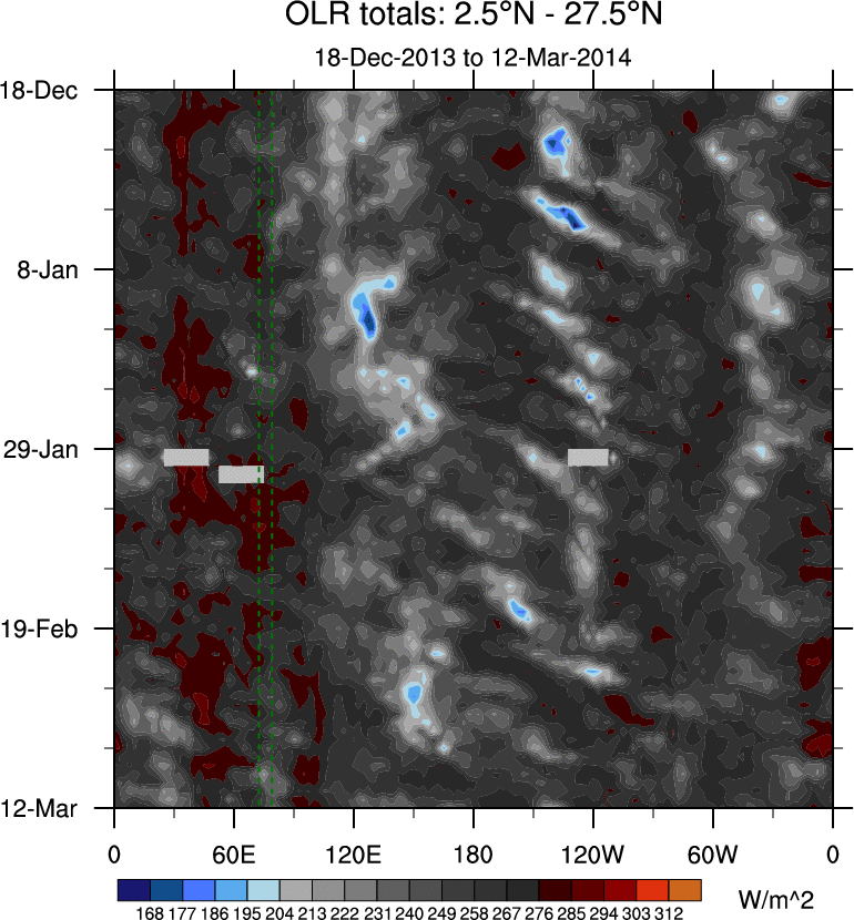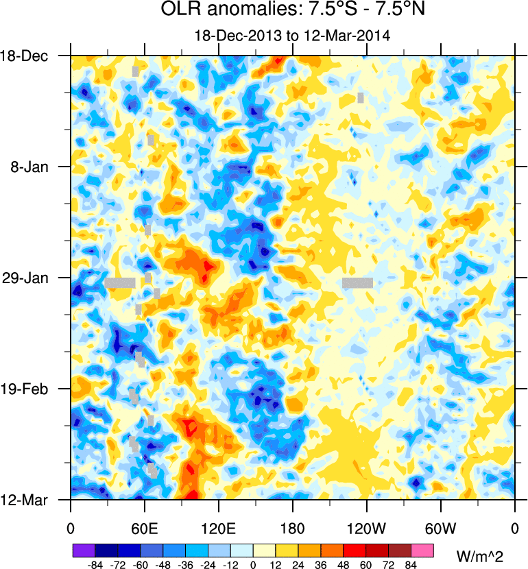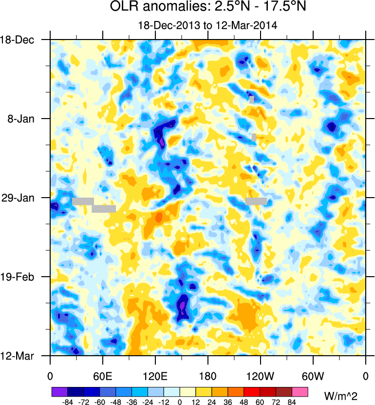 To identify tropical waves in near real-time, the OLR and UTWV data are filtered following Wheeler & Weickmann (2001 MWR). The daily anomalies are calculated using the first 3 harmonics of the seasonal cycle for 1979–2009. Missing values are then filled using linear interpolation in space and time. The most recent 365 days of anomalies are padded with 659 days of zeroes, and the result is filtered for each wave type.