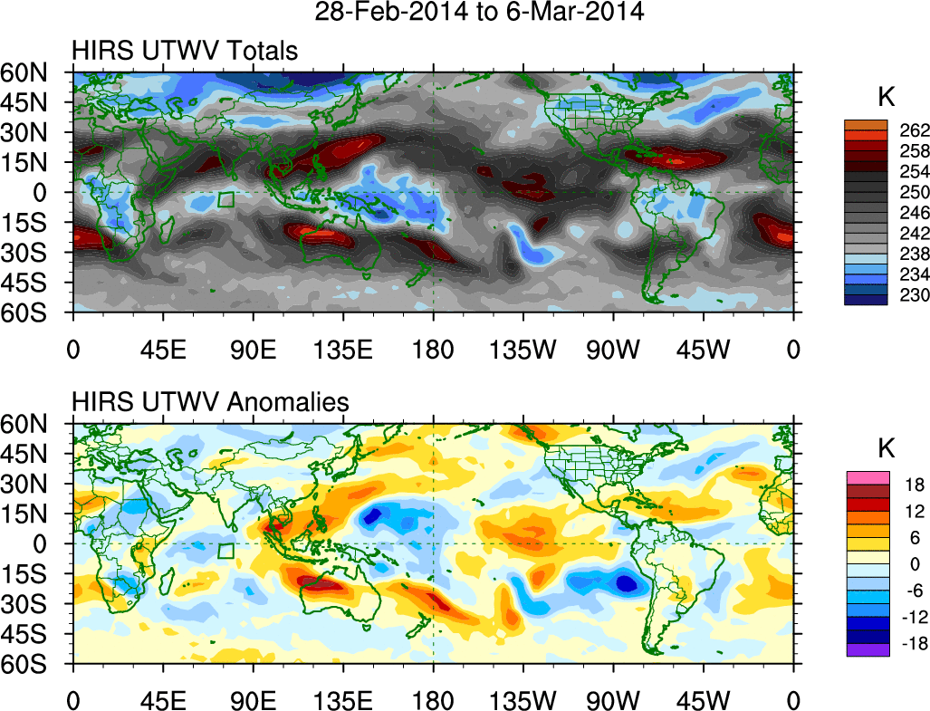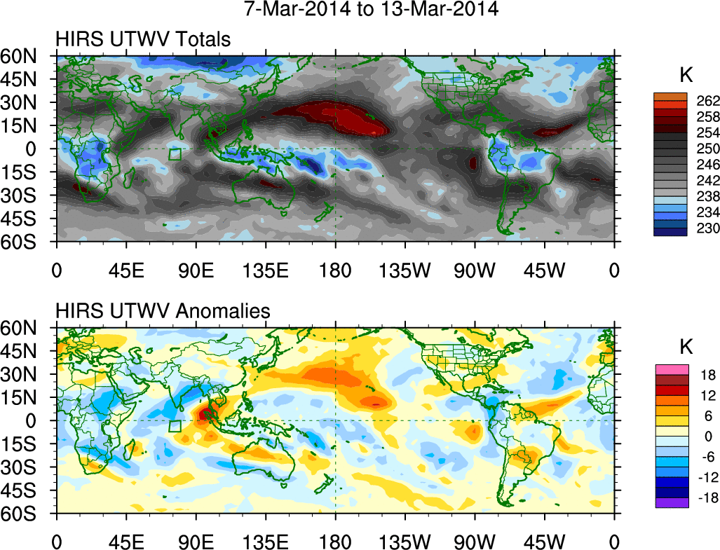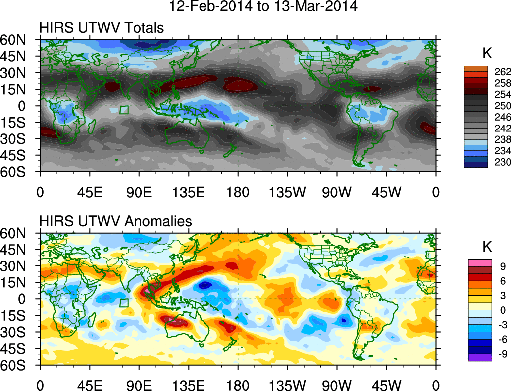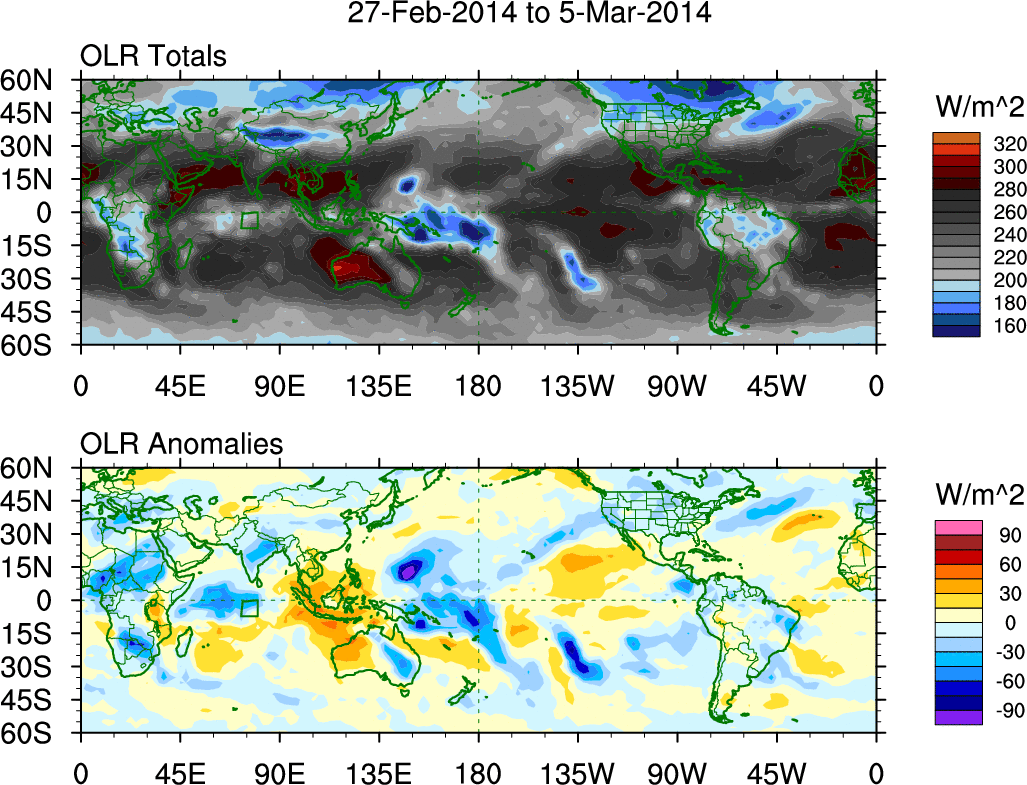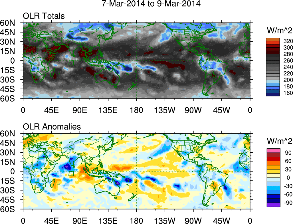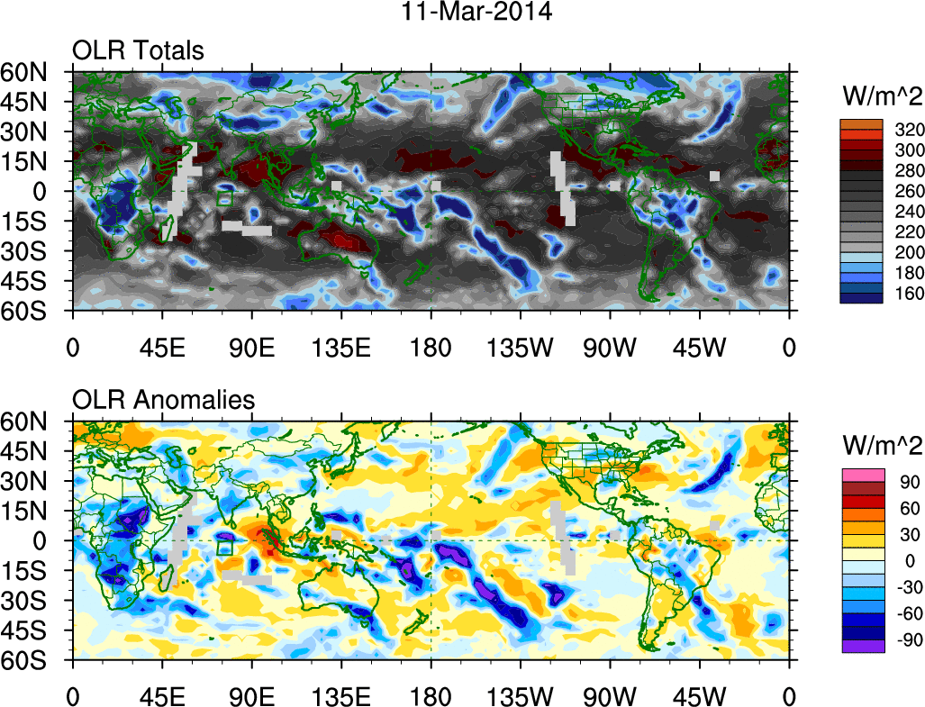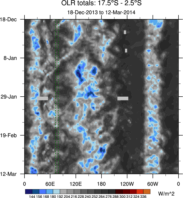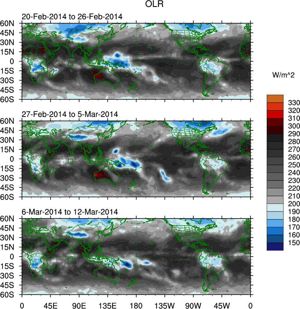To identify tropical waves in near real-time, the OLR and UTWV data are filtered following Wheeler & Weickmann (2001 MWR). The daily anomalies are calculated using the first 3 harmonics of the seasonal cycle for 1979–2009. Missing values are then filled using linear interpolation in space and time. The most recent 365 days of anomalies are padded with 659 days of zeroes, and the result is filtered for each wave type.