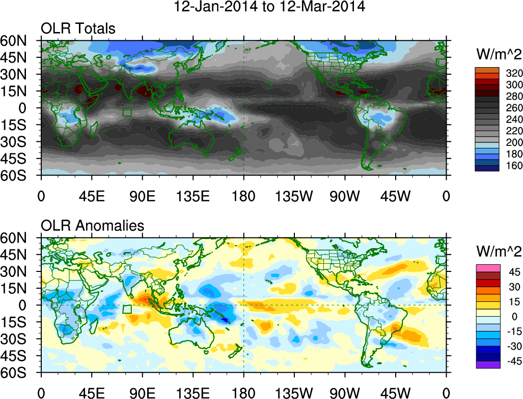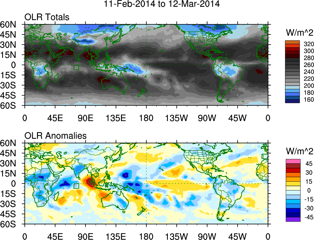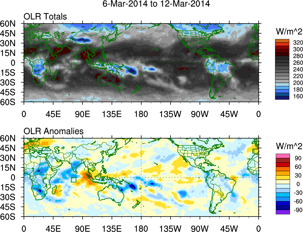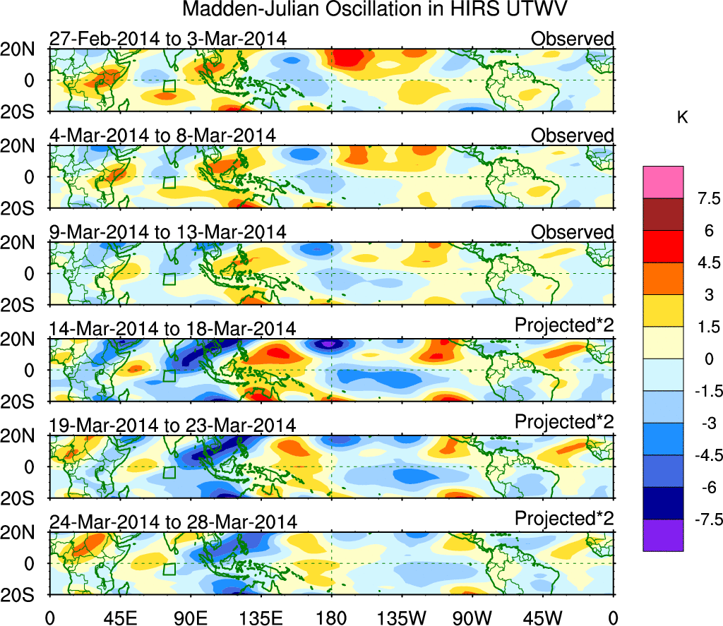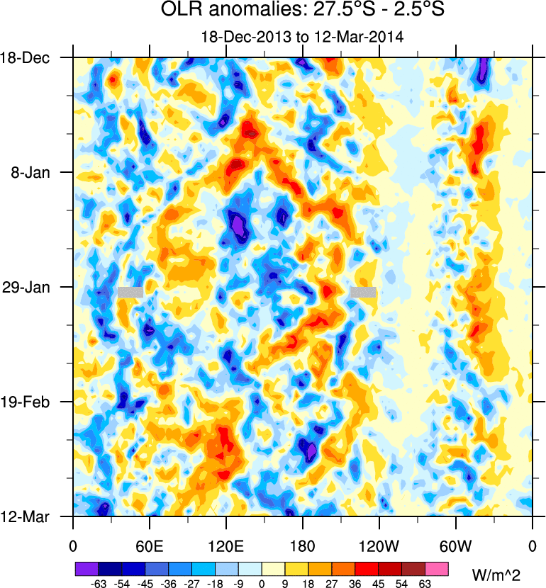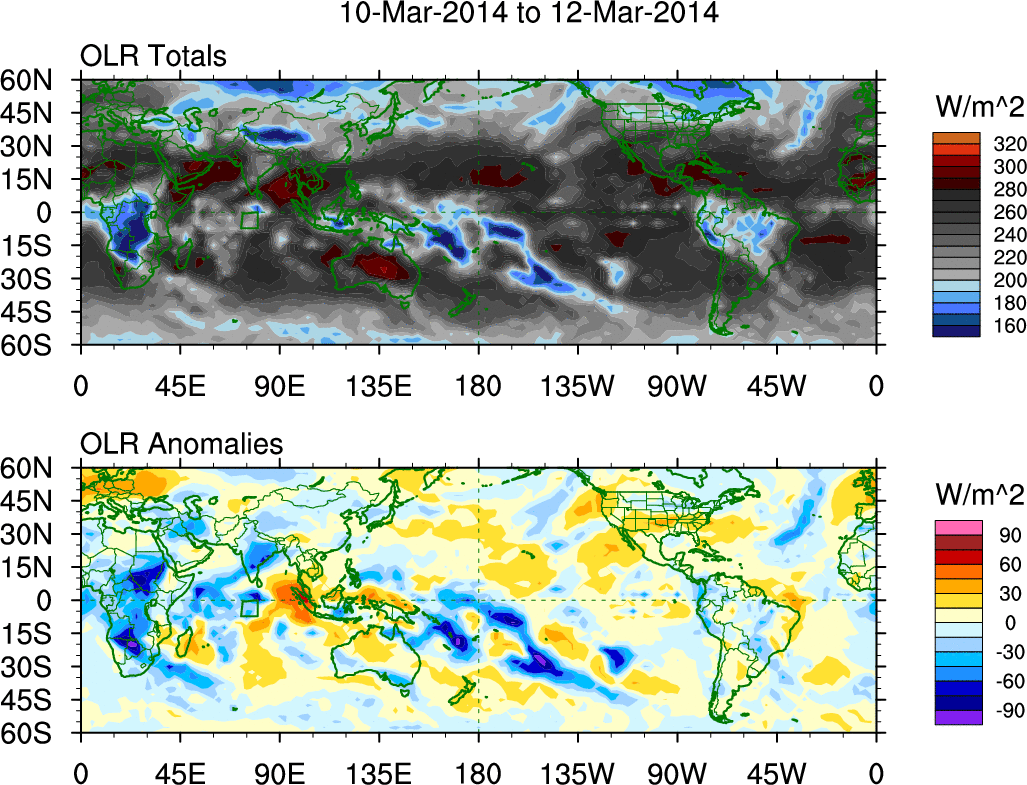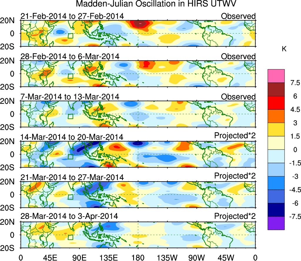 To identify tropical waves in near real-time, the OLR and UTWV data are filtered following Wheeler & Weickmann (2001 MWR). The daily anomalies are calculated using the first 3 harmonics of the seasonal cycle for 1979–2009. Missing values are then filled using linear interpolation in space and time. The most recent 365 days of anomalies are padded with 659 days of zeroes, and the result is filtered for each wave type.