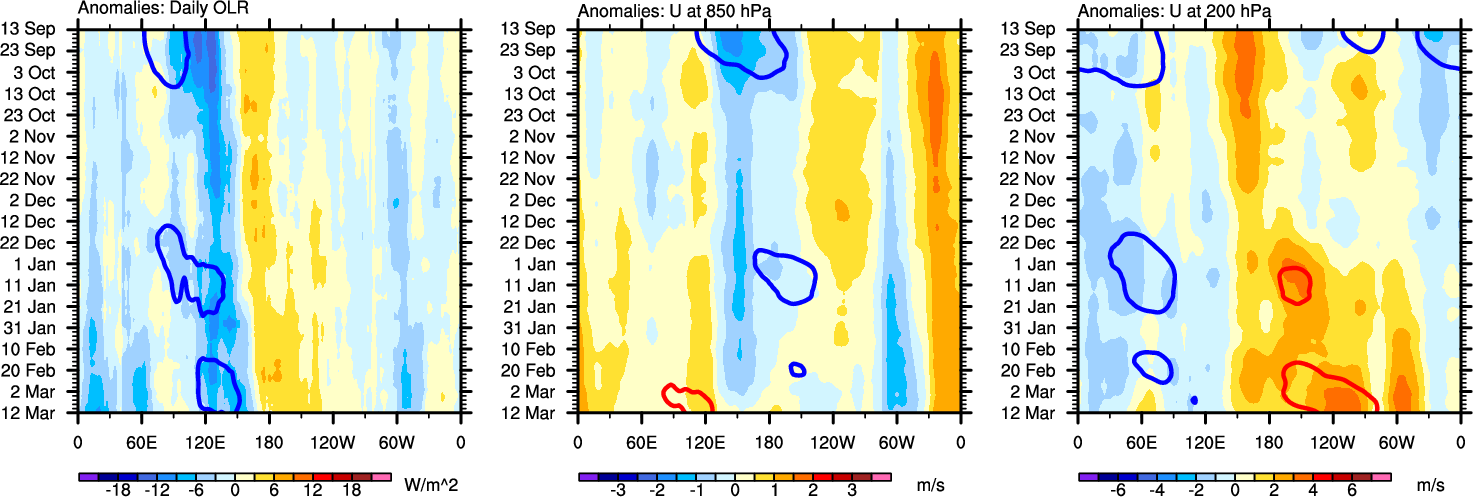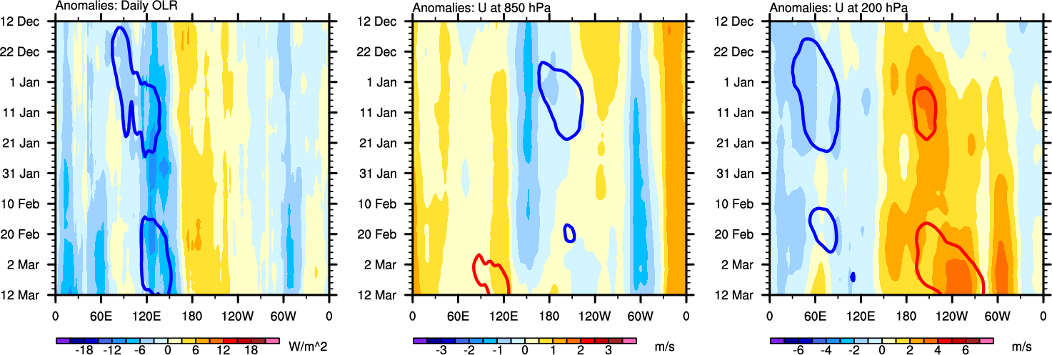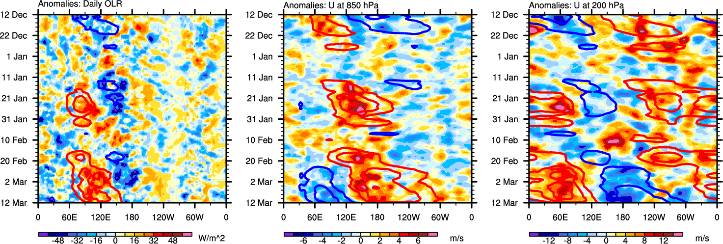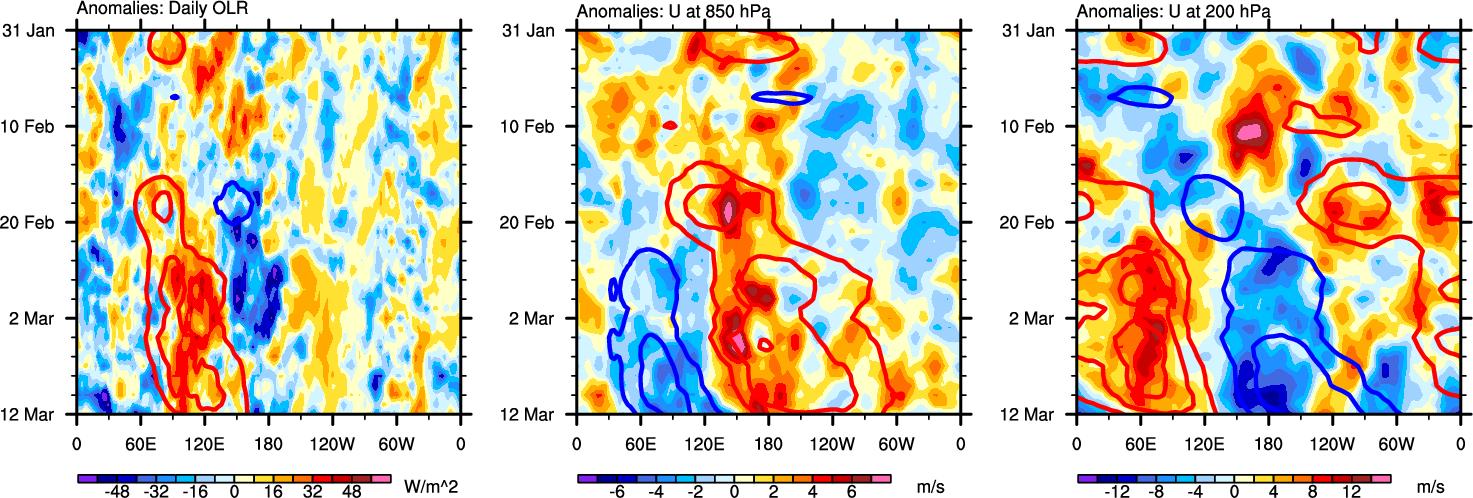 The Hovmollers show longitude-time plots for OLR, U-850, and U-200. The shading indicates the observed anomalies, while the contours are the projection of those anomalies onto the RMM EOFs.
