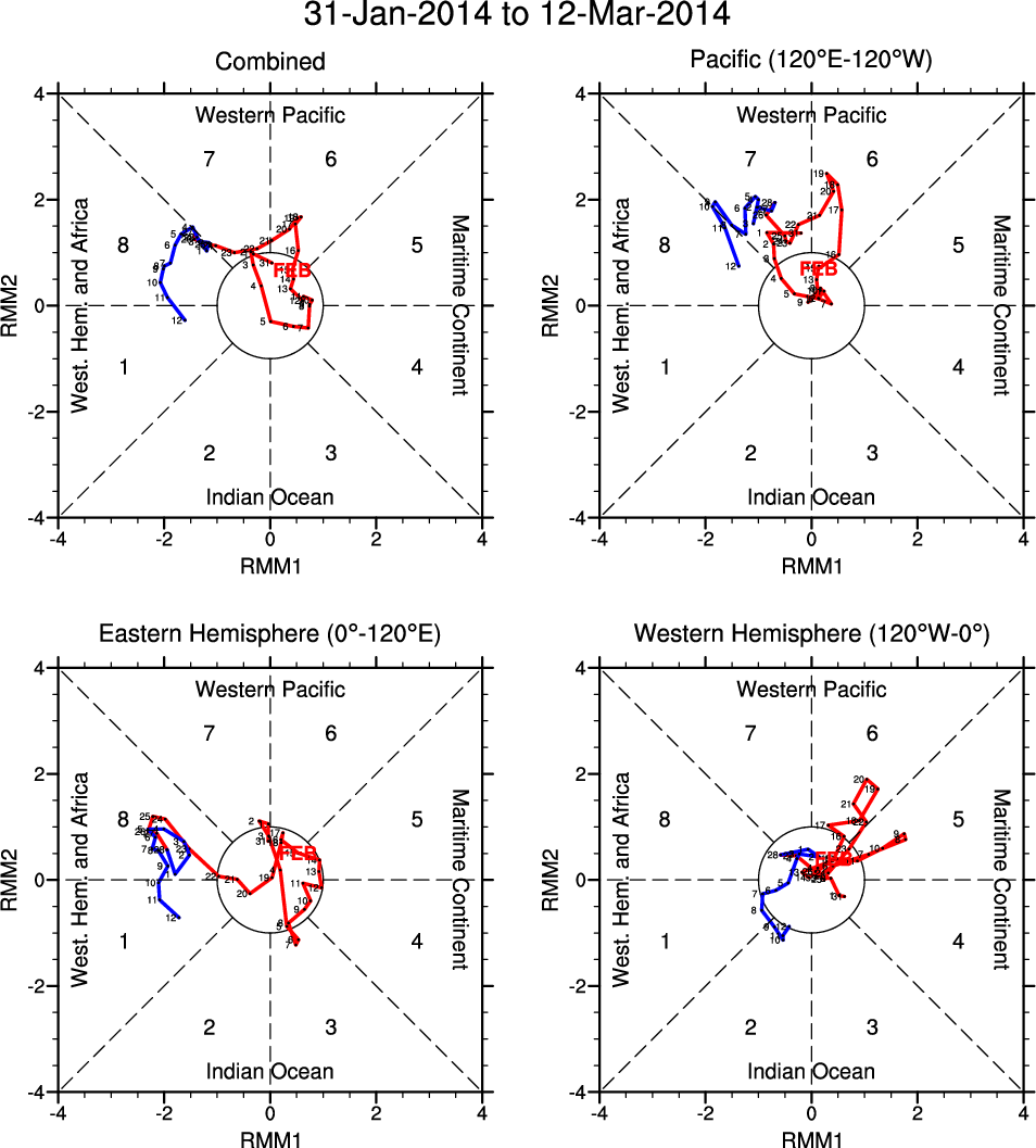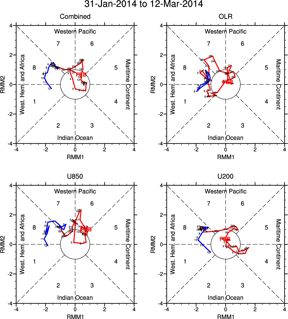 Wheeler and Hendon (2004) constructed the RMM index for monitoring the MJO. This index consists of the first two principal components (PCs) of OLR, 850-hPa zonal wind, and 200-hPa zonal wind averaged 15S-15N.