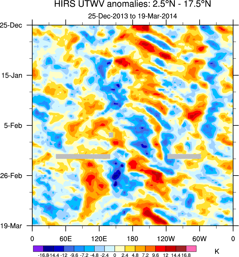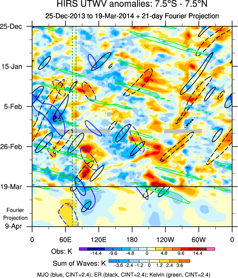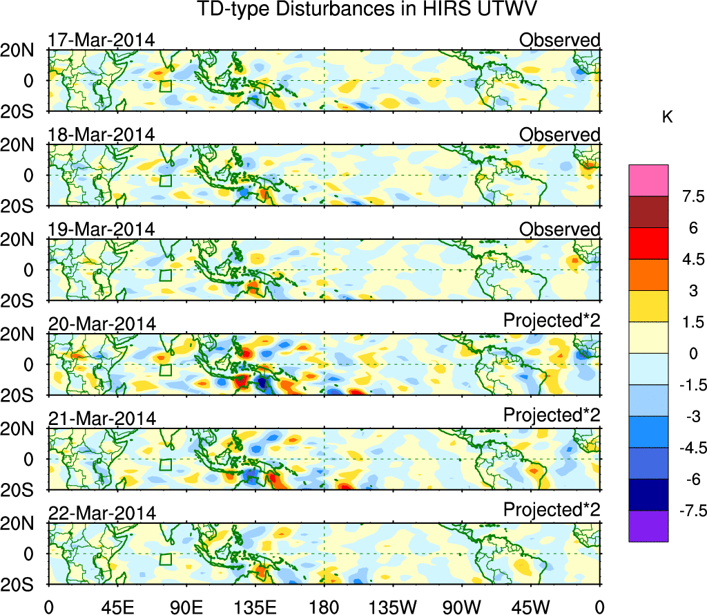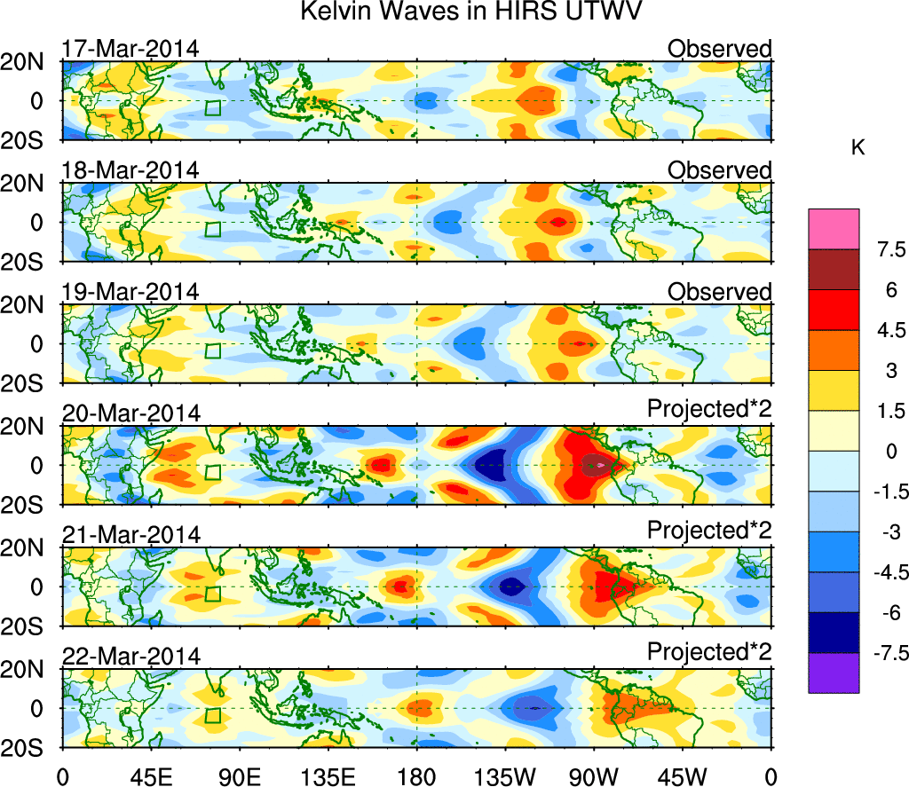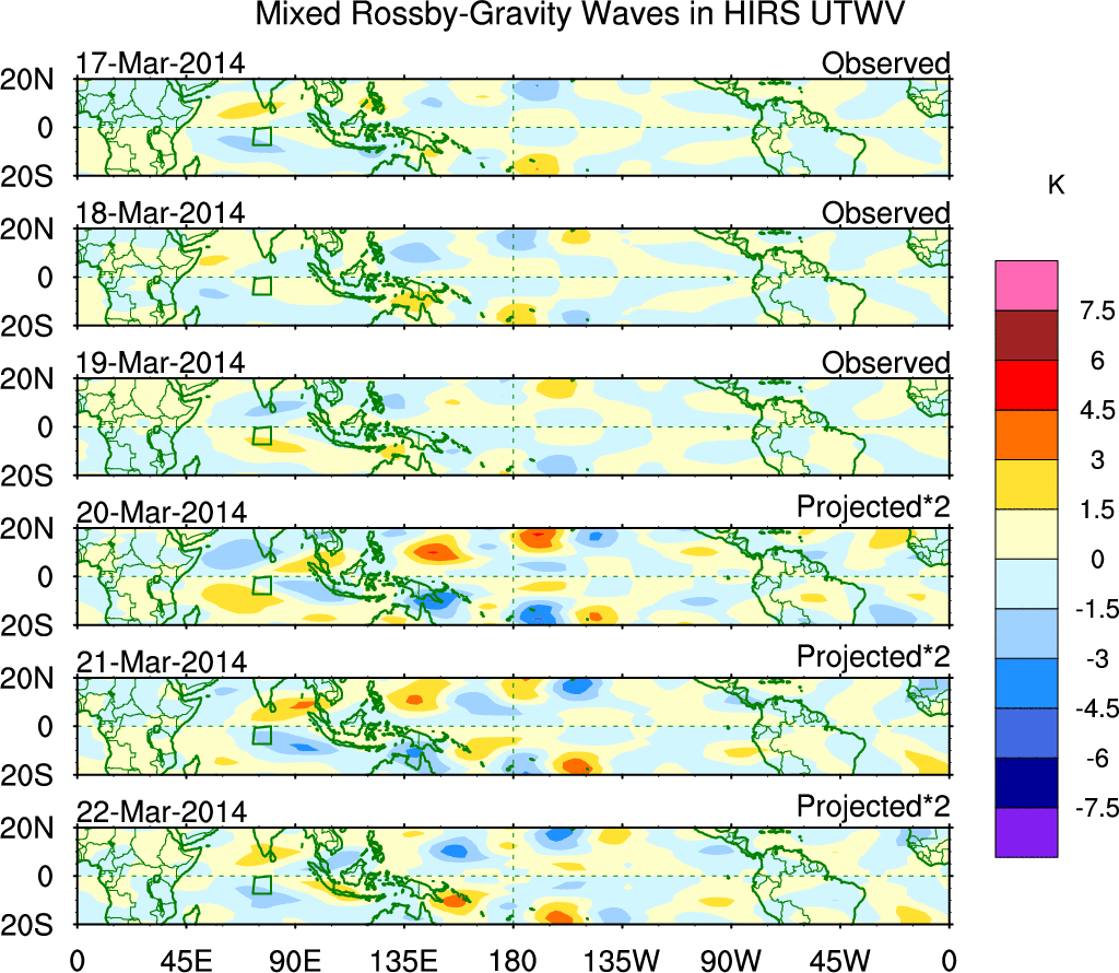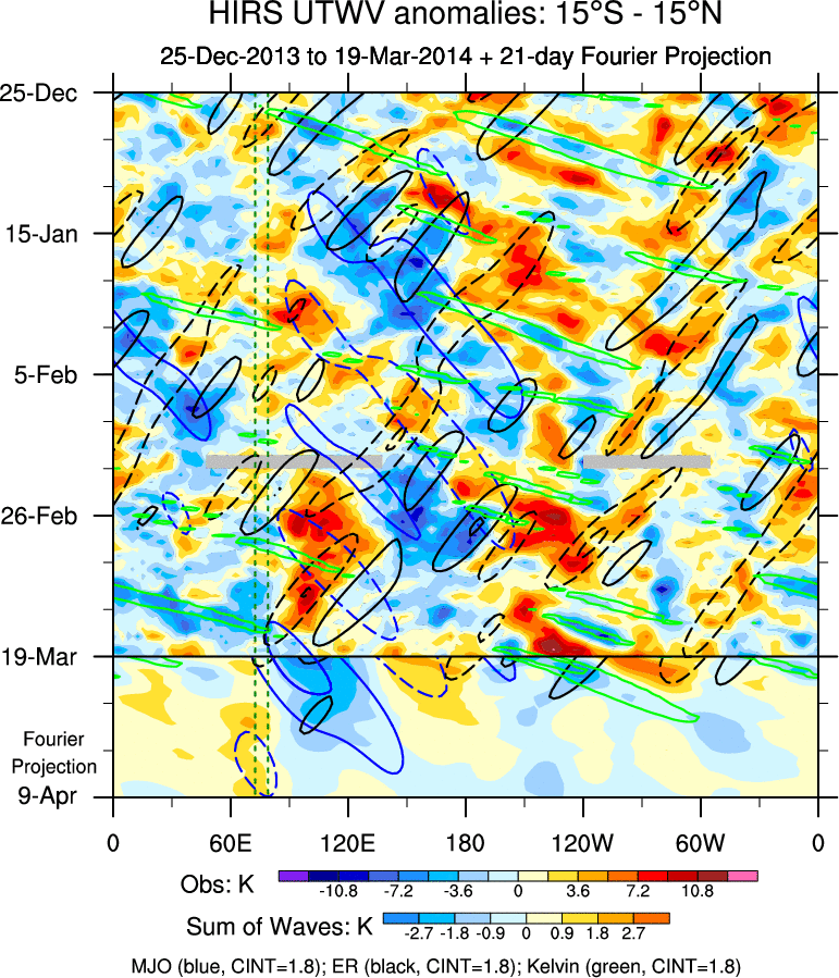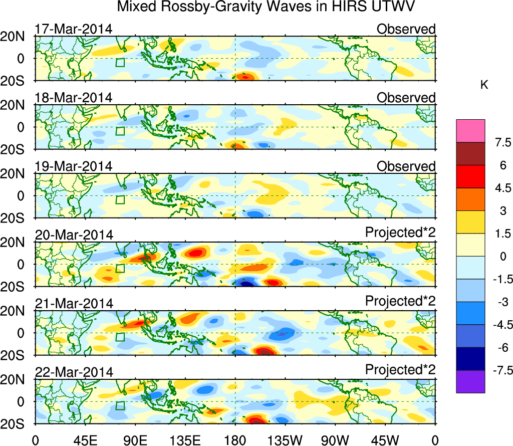To identify tropical waves in near real-time, the OLR and UTWV data are filtered following Wheeler & Weickmann (2001 MWR). The daily anomalies are calculated using the first 3 harmonics of the seasonal cycle for 1979–2009. Missing values are then filled using linear interpolation in space and time. The most recent 365 days of anomalies are padded with 659 days of zeroes, and the result is filtered for each wave type.