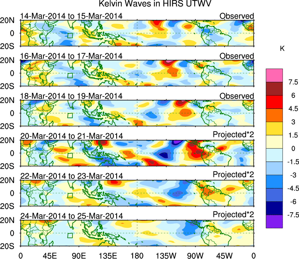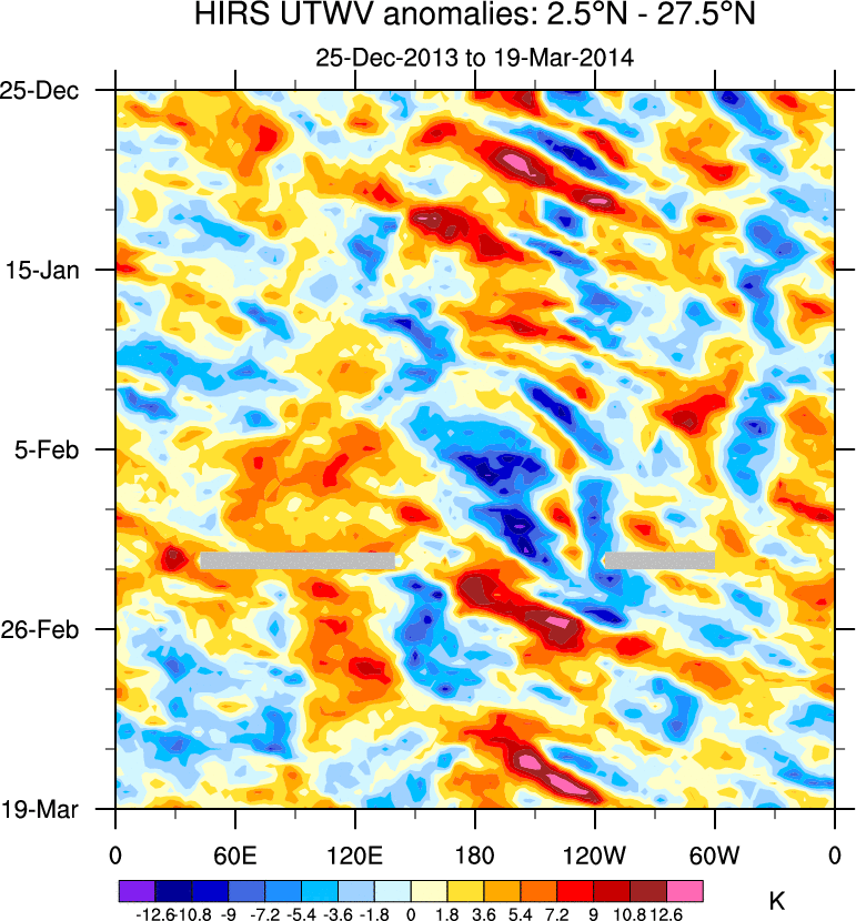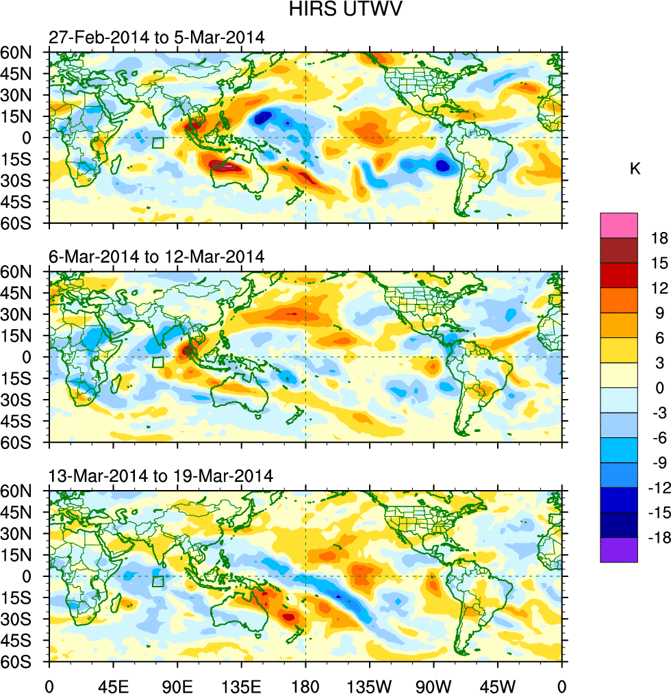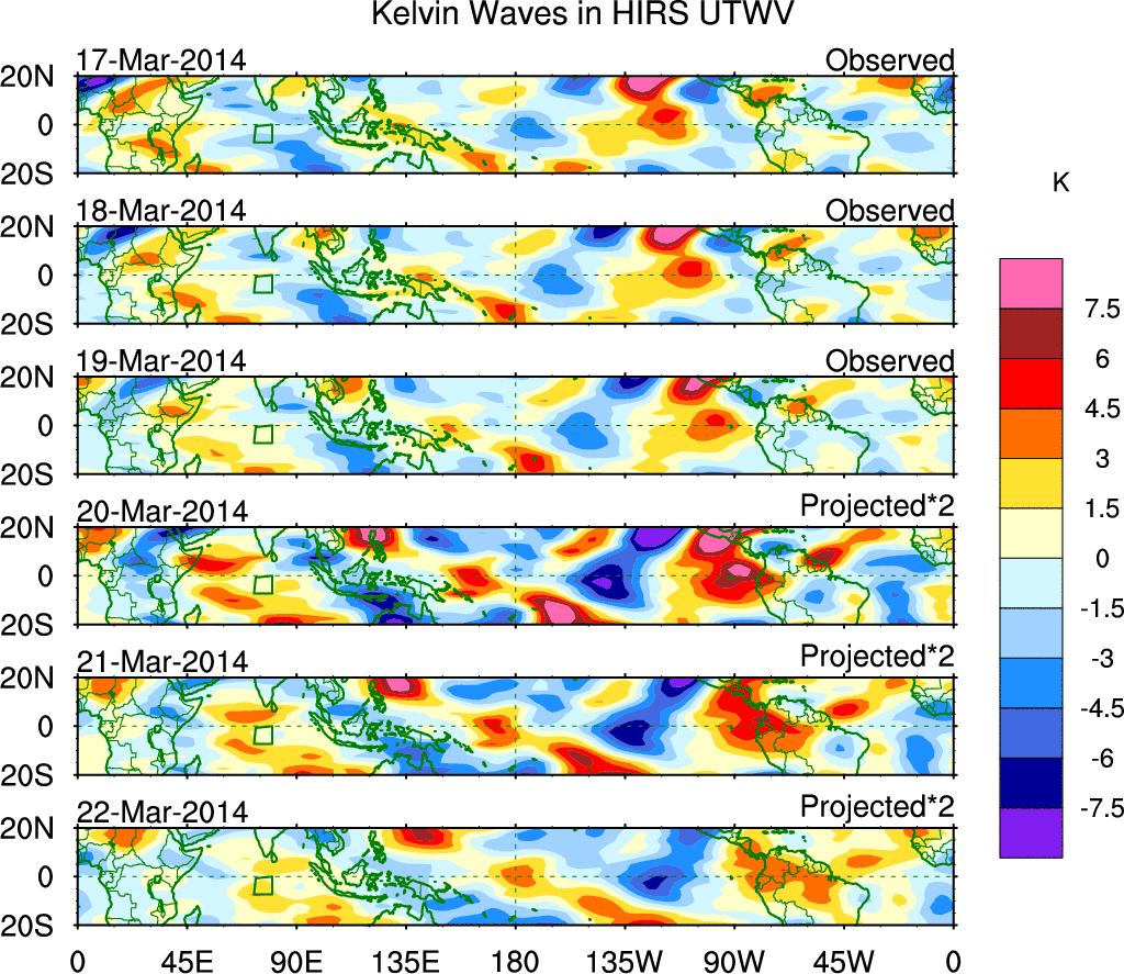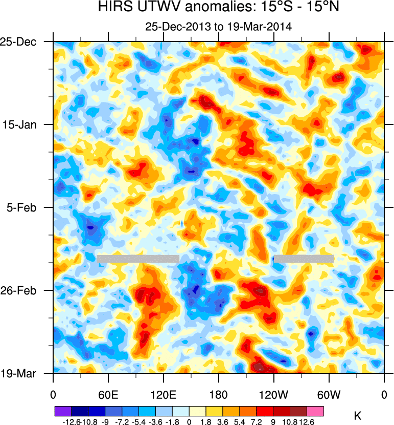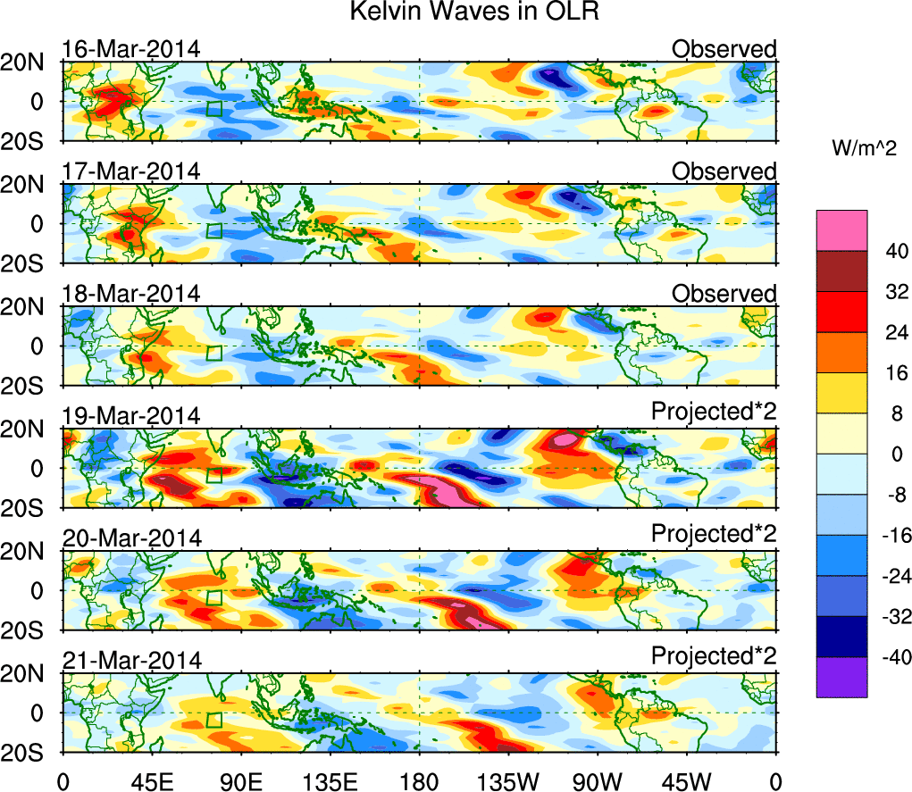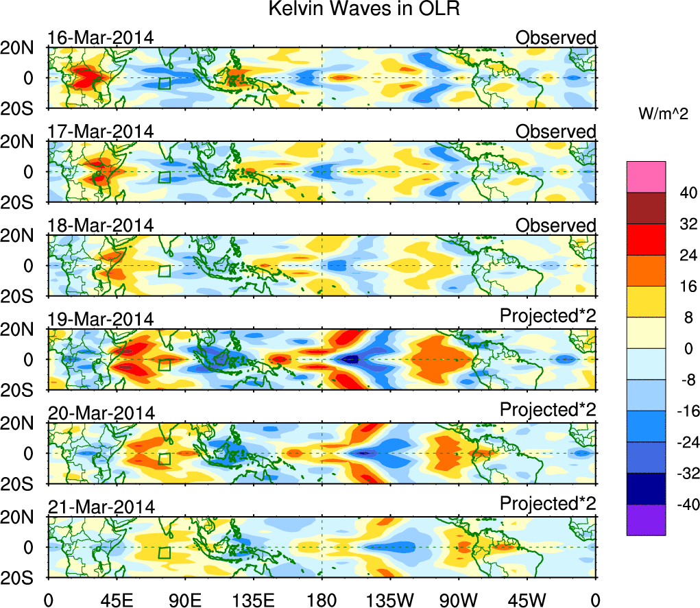 To identify tropical waves in near real-time, the OLR and UTWV data are filtered following Wheeler & Weickmann (2001 MWR). The daily anomalies are calculated using the first 3 harmonics of the seasonal cycle for 1979–2009. Missing values are then filled using linear interpolation in space and time. The most recent 365 days of anomalies are padded with 659 days of zeroes, and the result is filtered for each wave type.