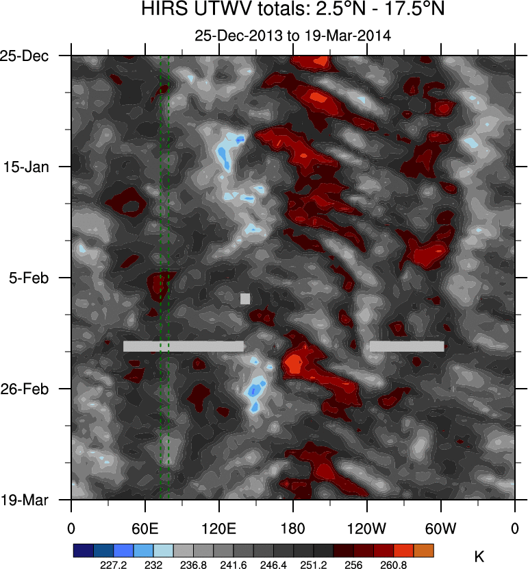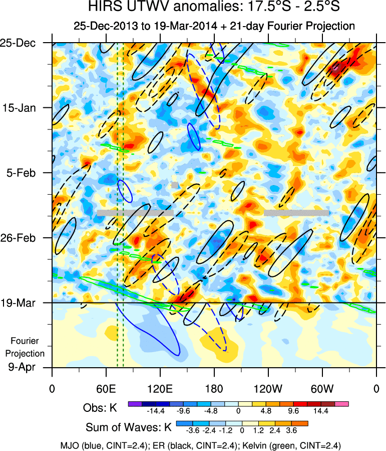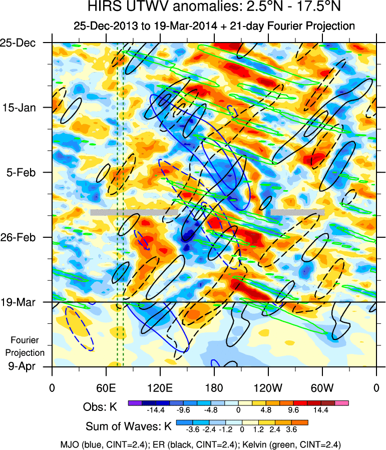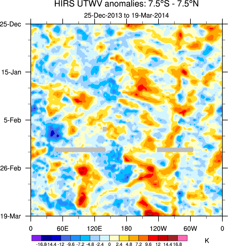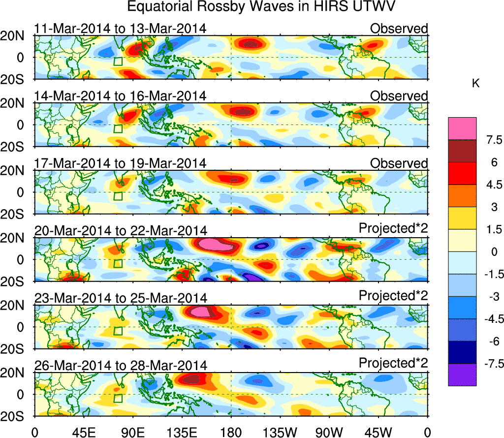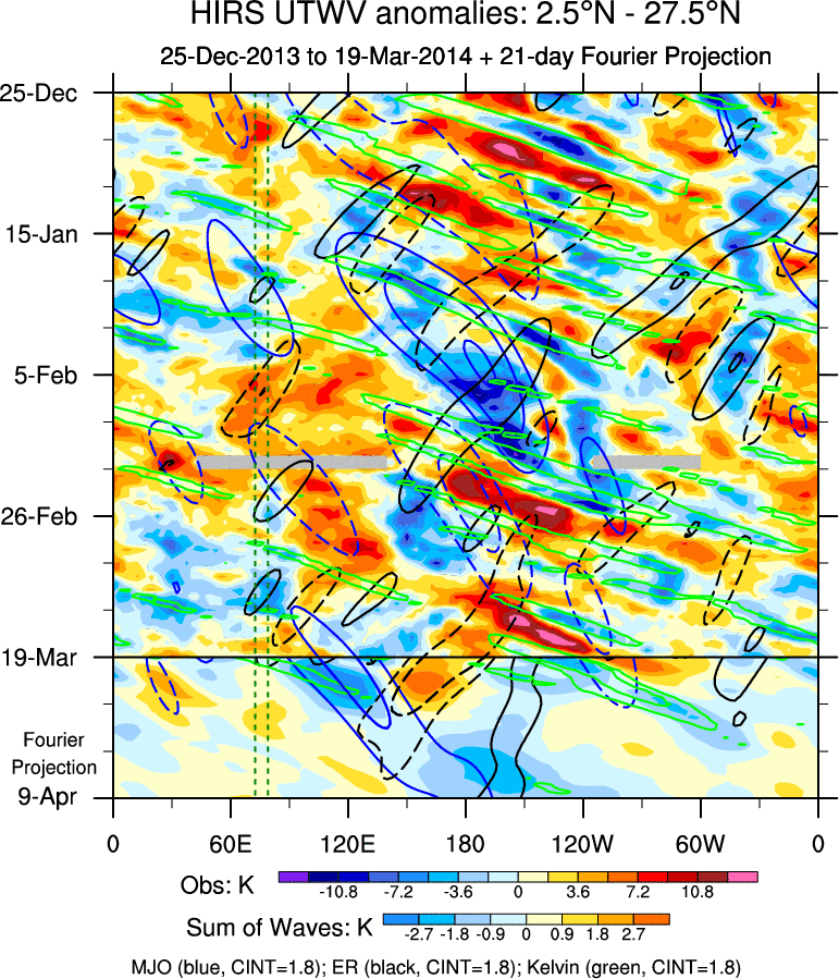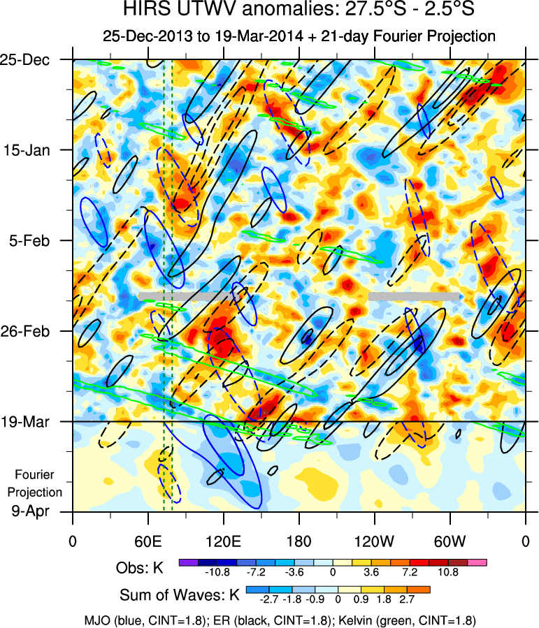 To identify tropical waves in near real-time, the OLR and UTWV data are filtered following Wheeler & Weickmann (2001 MWR). The daily anomalies are calculated using the first 3 harmonics of the seasonal cycle for 1979–2009. Missing values are then filled using linear interpolation in space and time. The most recent 365 days of anomalies are padded with 659 days of zeroes, and the result is filtered for each wave type.