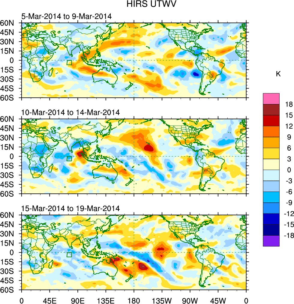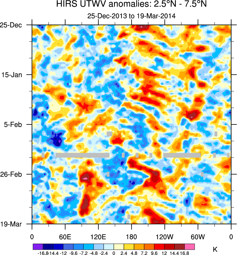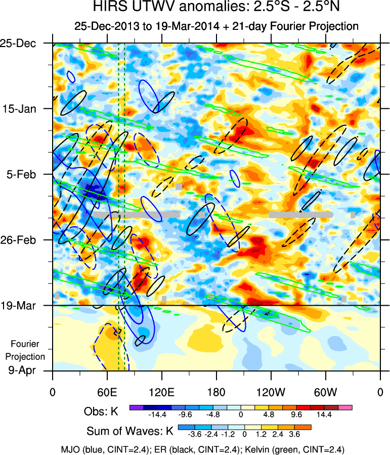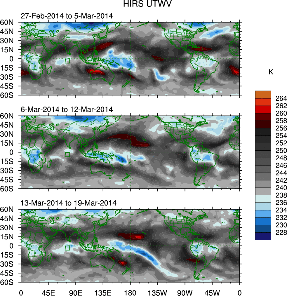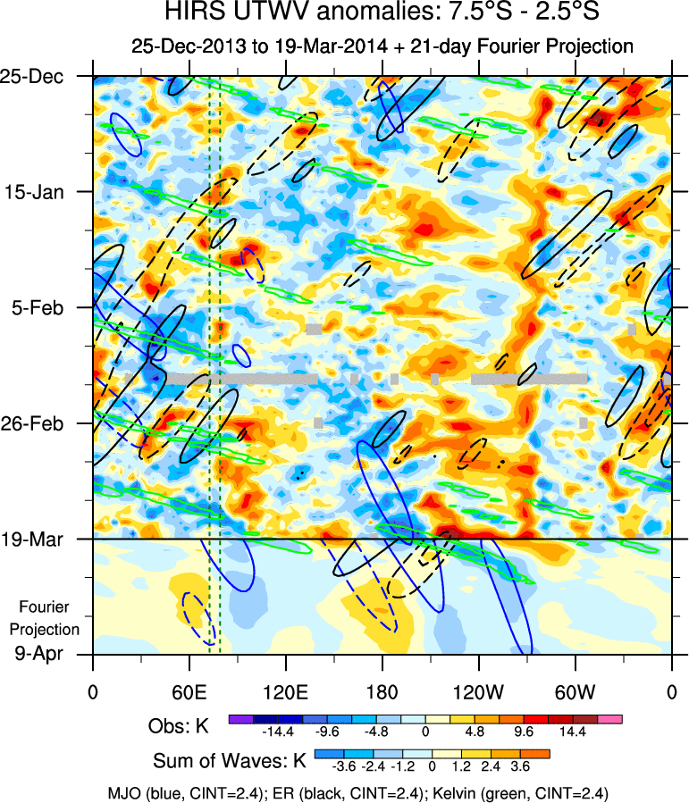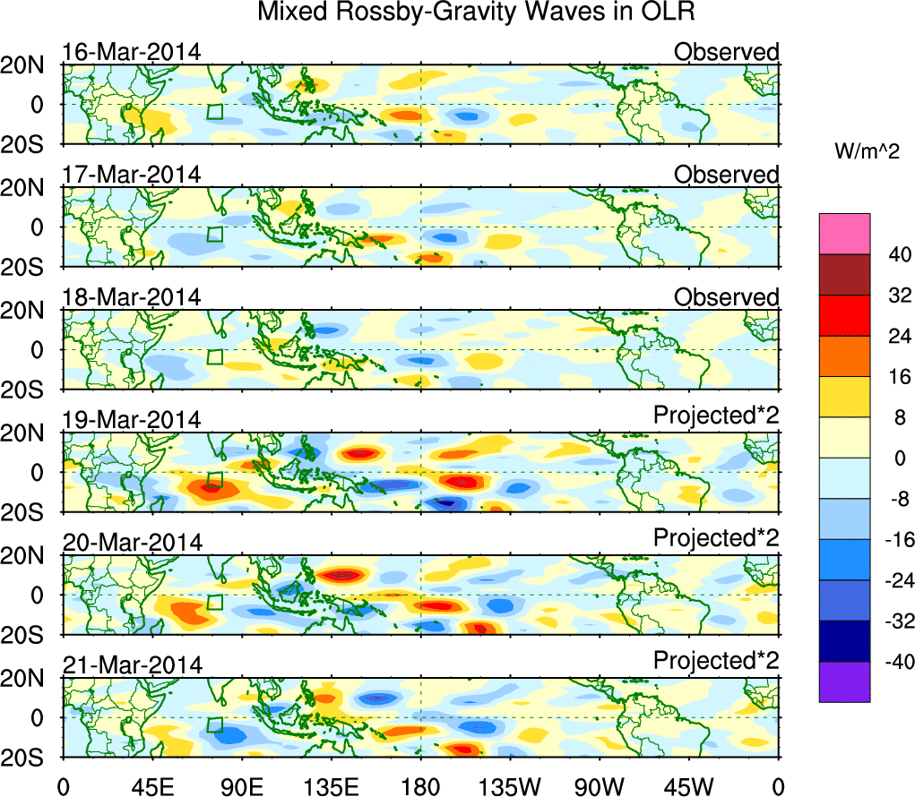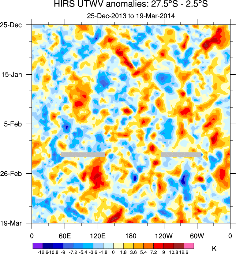 To identify tropical waves in near real-time, the OLR and UTWV data are filtered following Wheeler & Weickmann (2001 MWR). The daily anomalies are calculated using the first 3 harmonics of the seasonal cycle for 1979–2009. Missing values are then filled using linear interpolation in space and time. The most recent 365 days of anomalies are padded with 659 days of zeroes, and the result is filtered for each wave type.