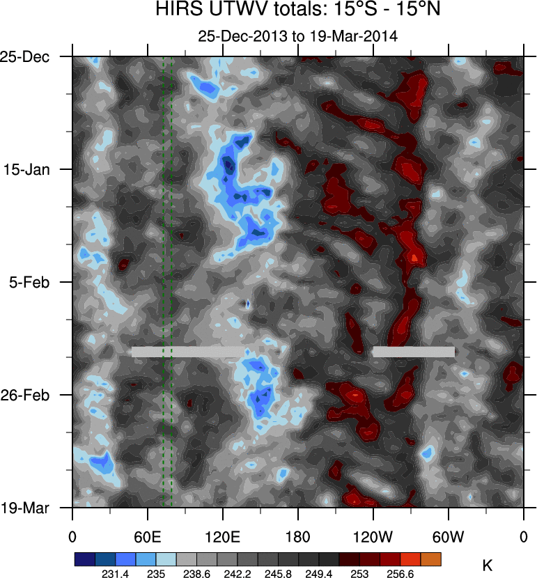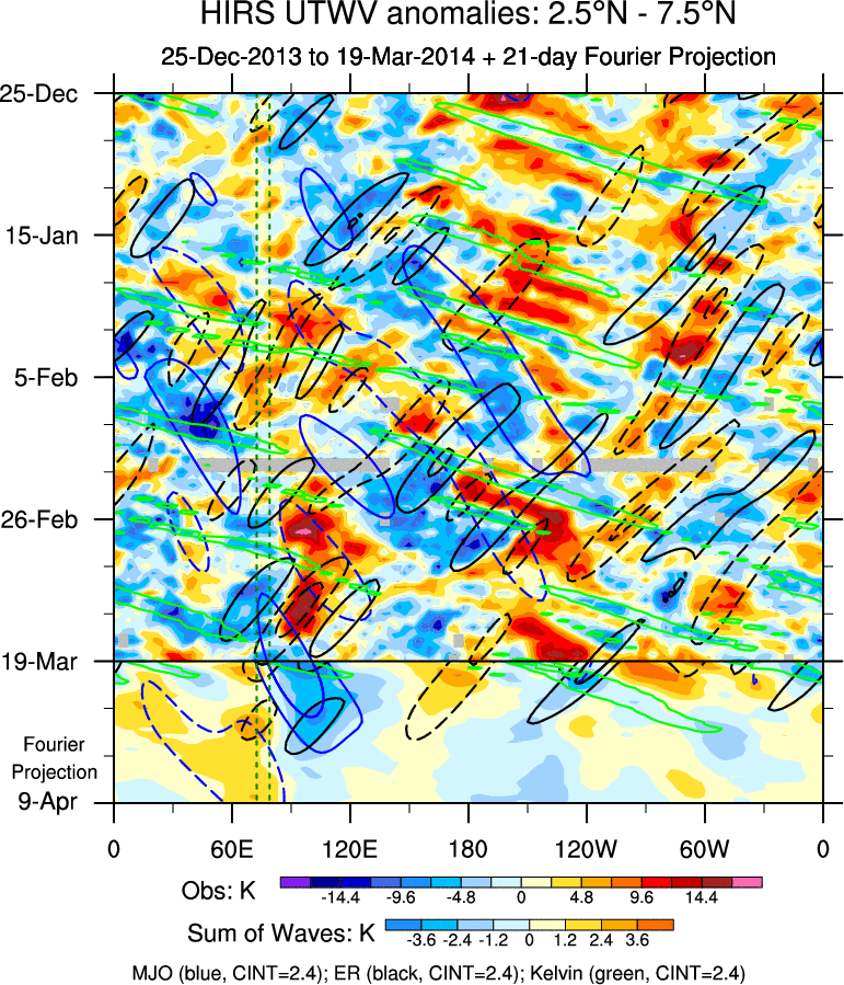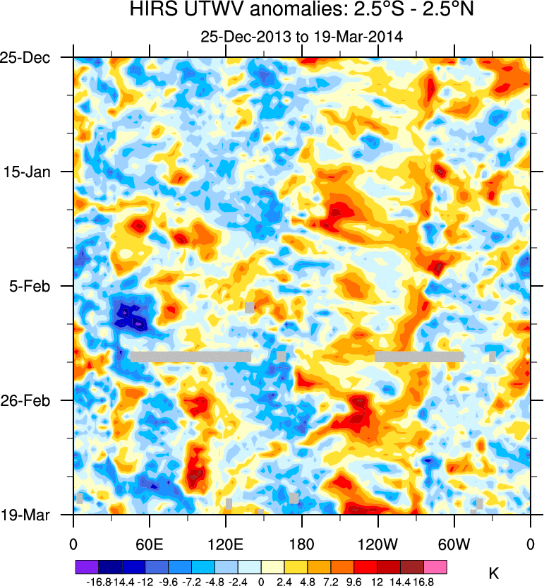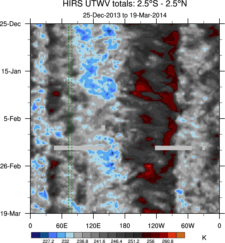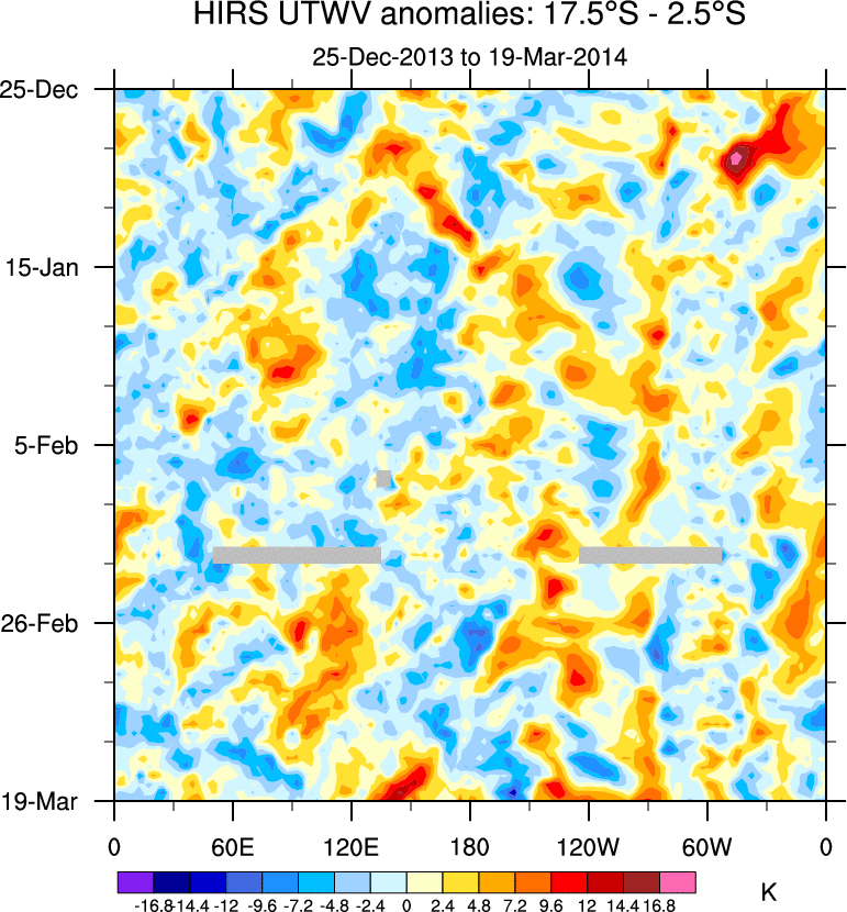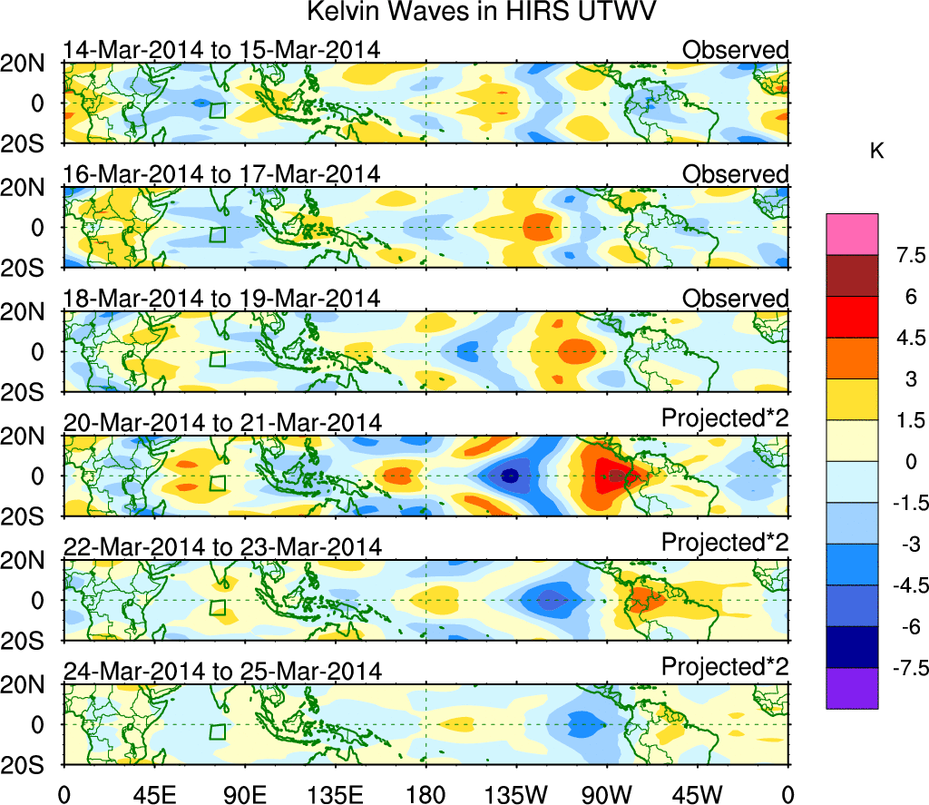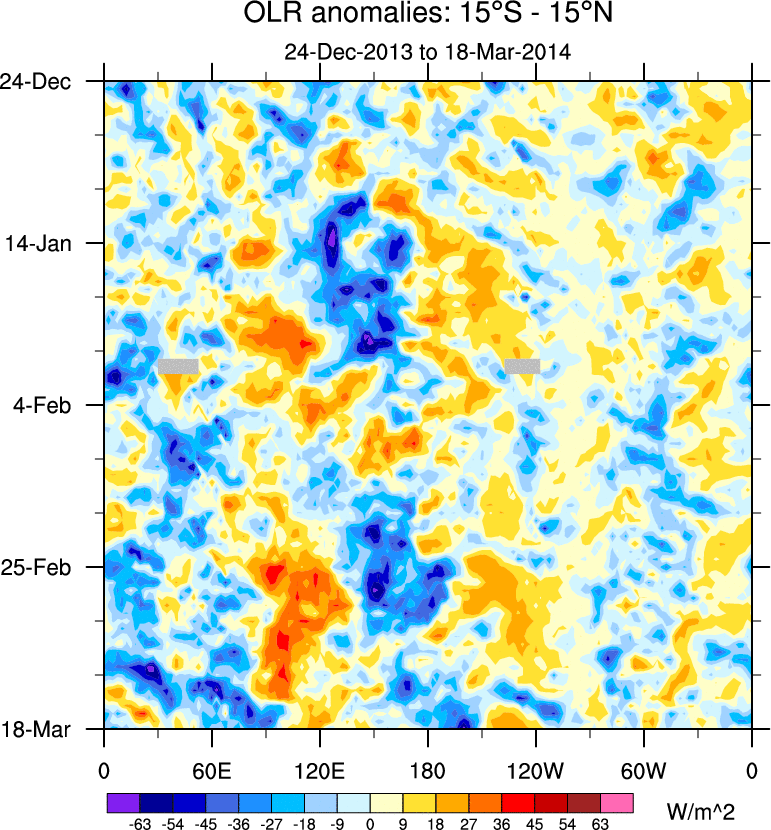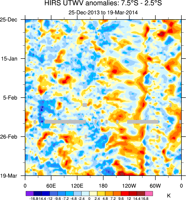 To identify tropical waves in near real-time, the OLR and UTWV data are filtered following Wheeler & Weickmann (2001 MWR). The daily anomalies are calculated using the first 3 harmonics of the seasonal cycle for 1979–2009. Missing values are then filled using linear interpolation in space and time. The most recent 365 days of anomalies are padded with 659 days of zeroes, and the result is filtered for each wave type.