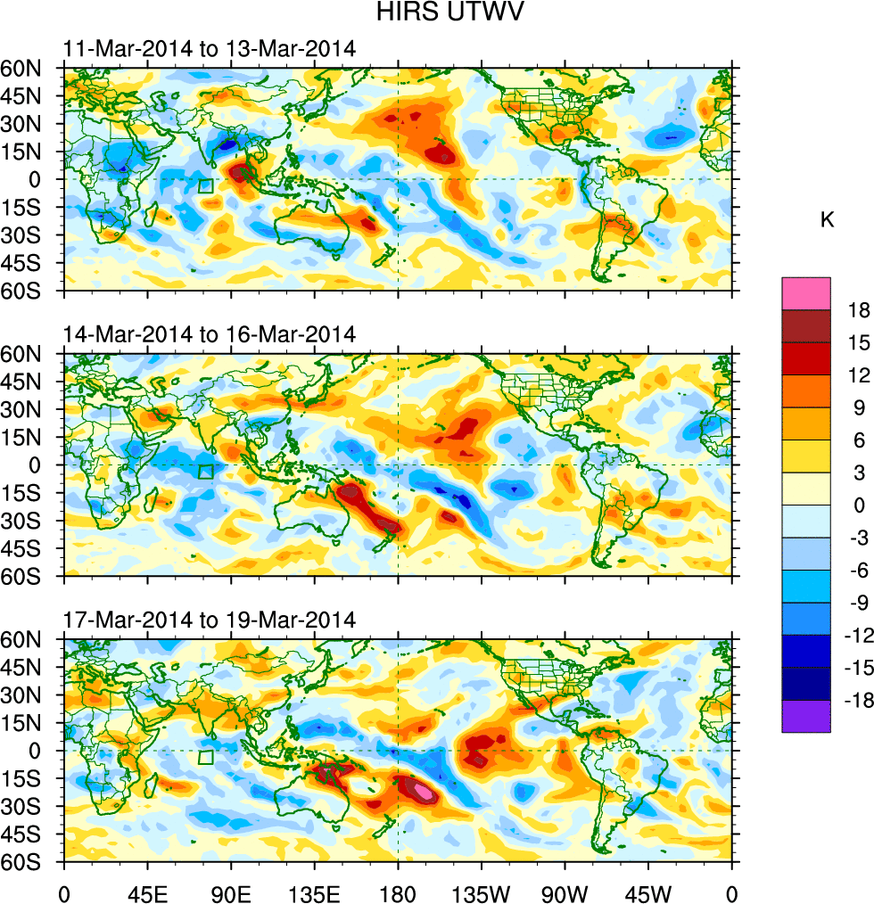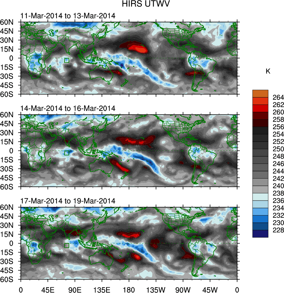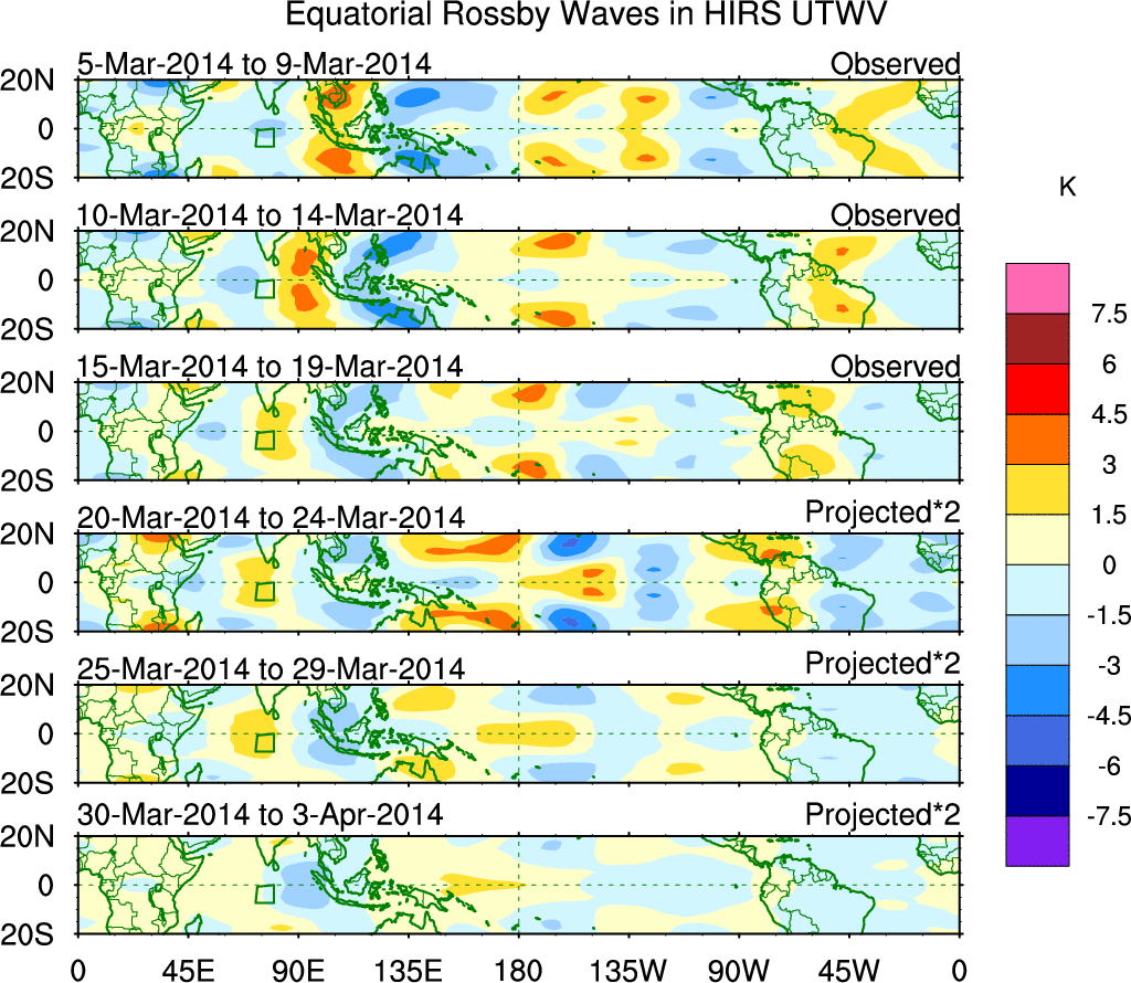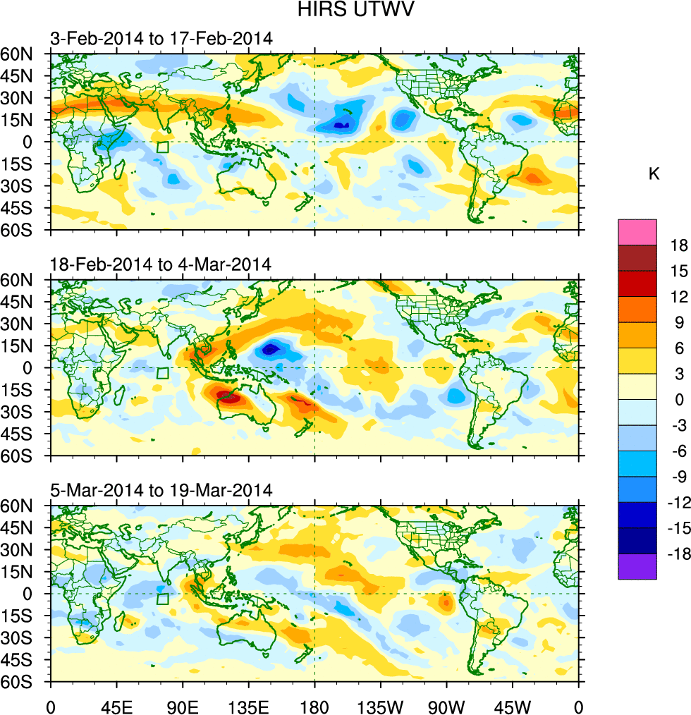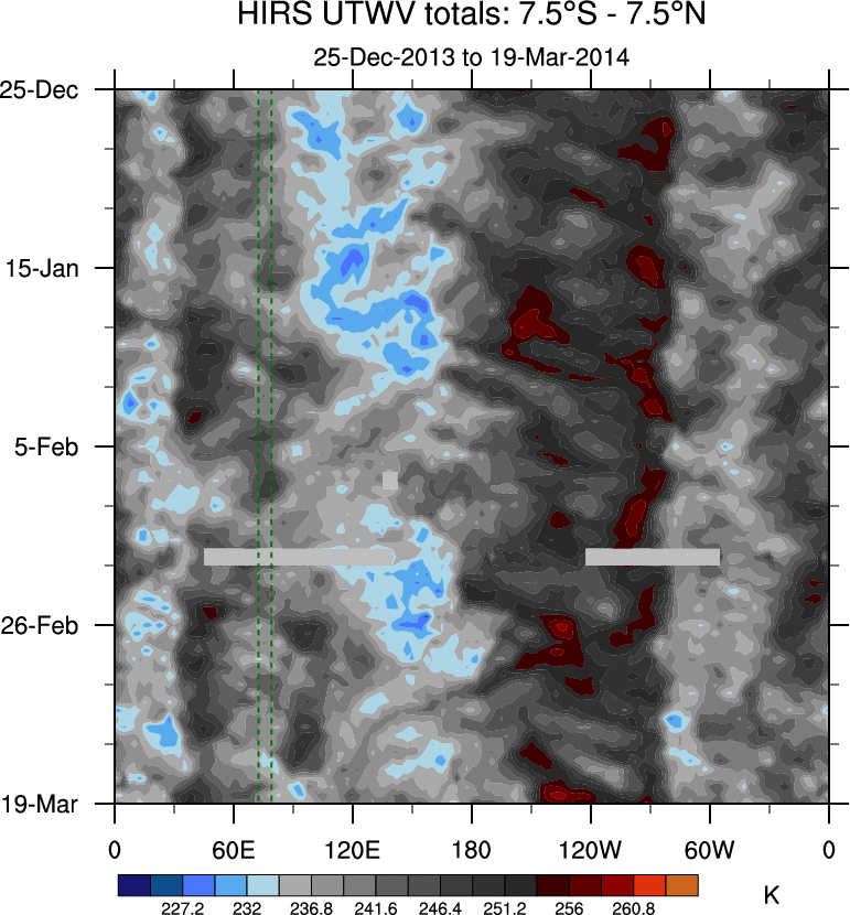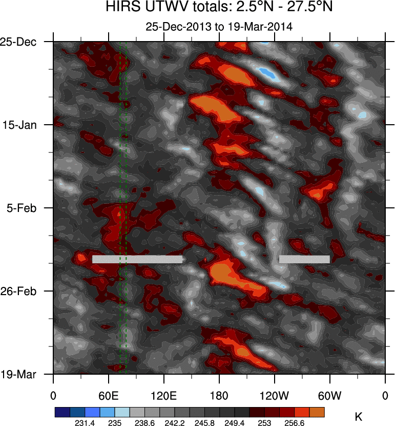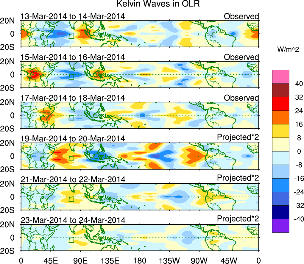 To identify tropical waves in near real-time, the OLR and UTWV data are filtered following Wheeler & Weickmann (2001 MWR). The daily anomalies are calculated using the first 3 harmonics of the seasonal cycle for 1979–2009. Missing values are then filled using linear interpolation in space and time. The most recent 365 days of anomalies are padded with 659 days of zeroes, and the result is filtered for each wave type.