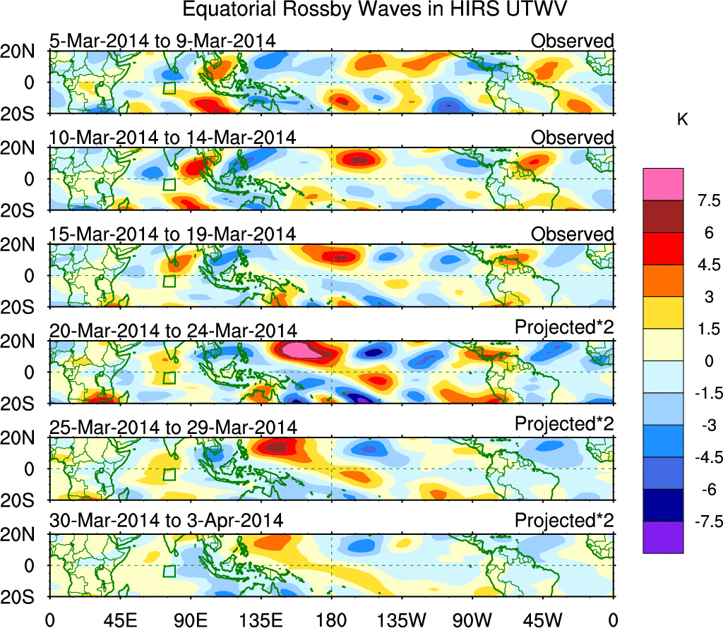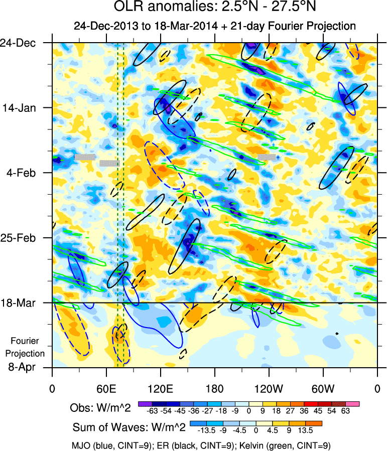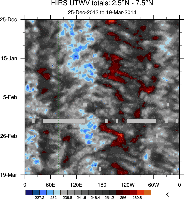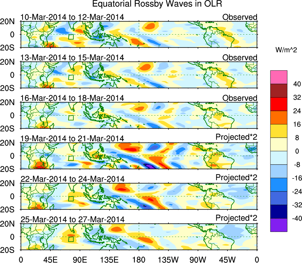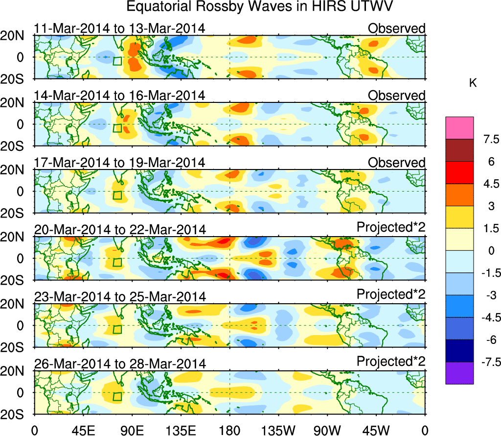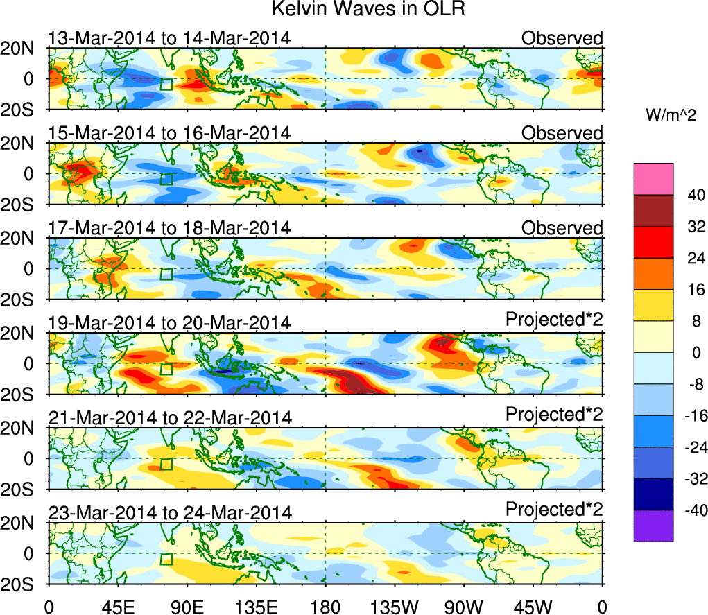 To identify tropical waves in near real-time, the OLR and UTWV data are filtered following Wheeler & Weickmann (2001 MWR). The daily anomalies are calculated using the first 3 harmonics of the seasonal cycle for 1979–2009. Missing values are then filled using linear interpolation in space and time. The most recent 365 days of anomalies are padded with 659 days of zeroes, and the result is filtered for each wave type.