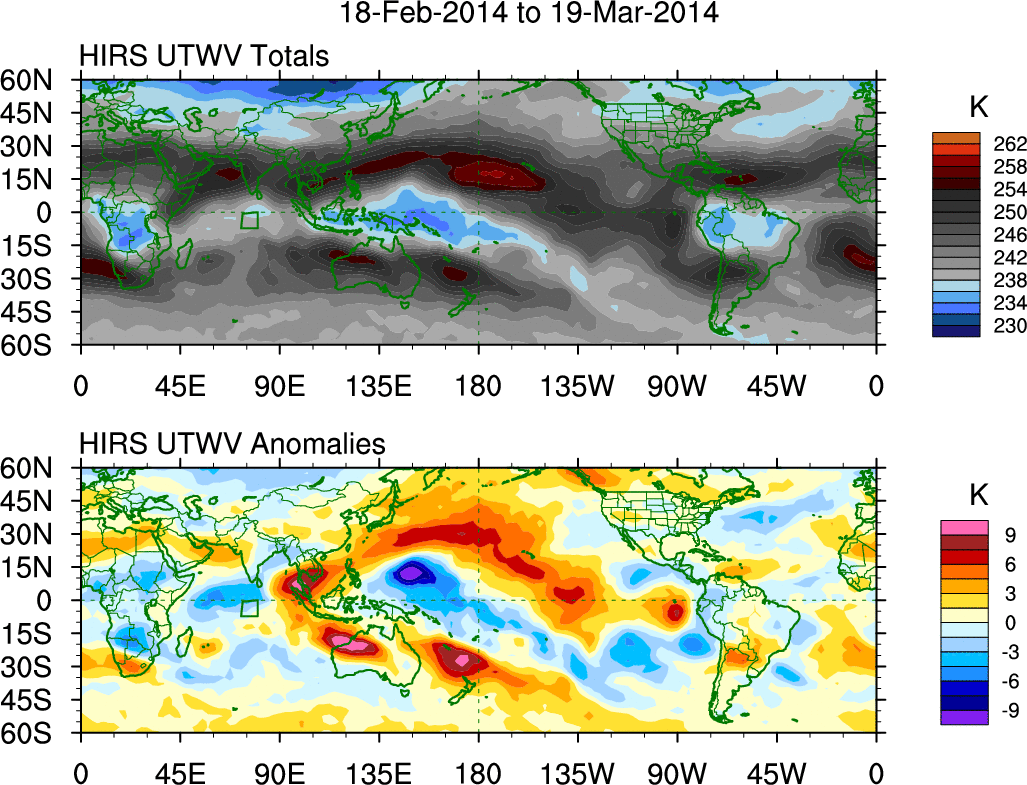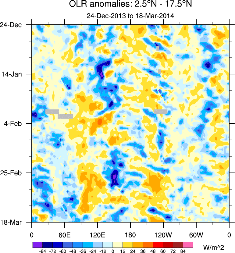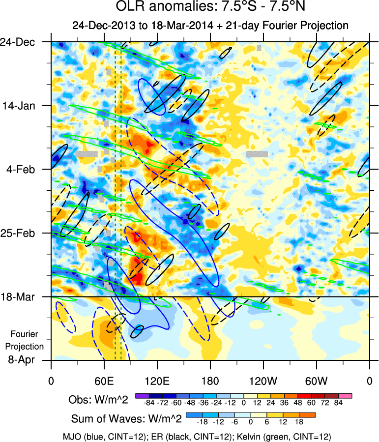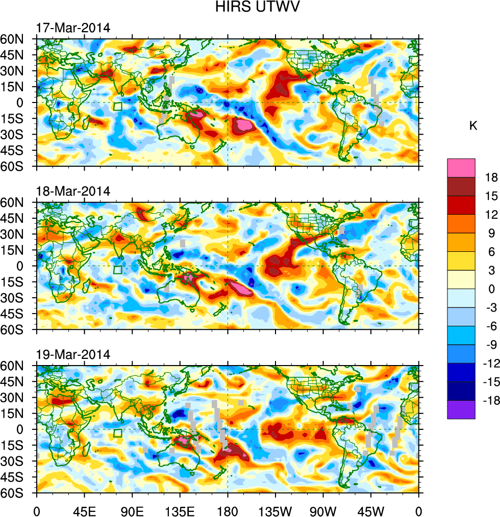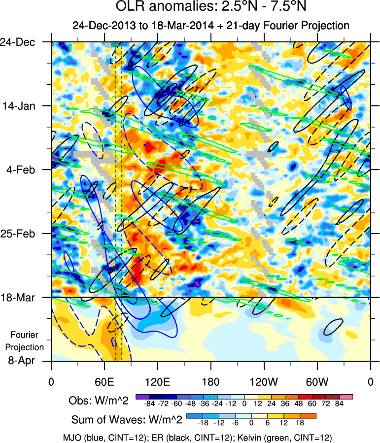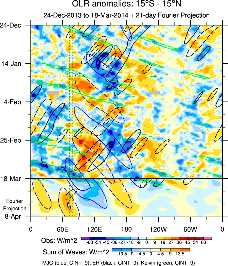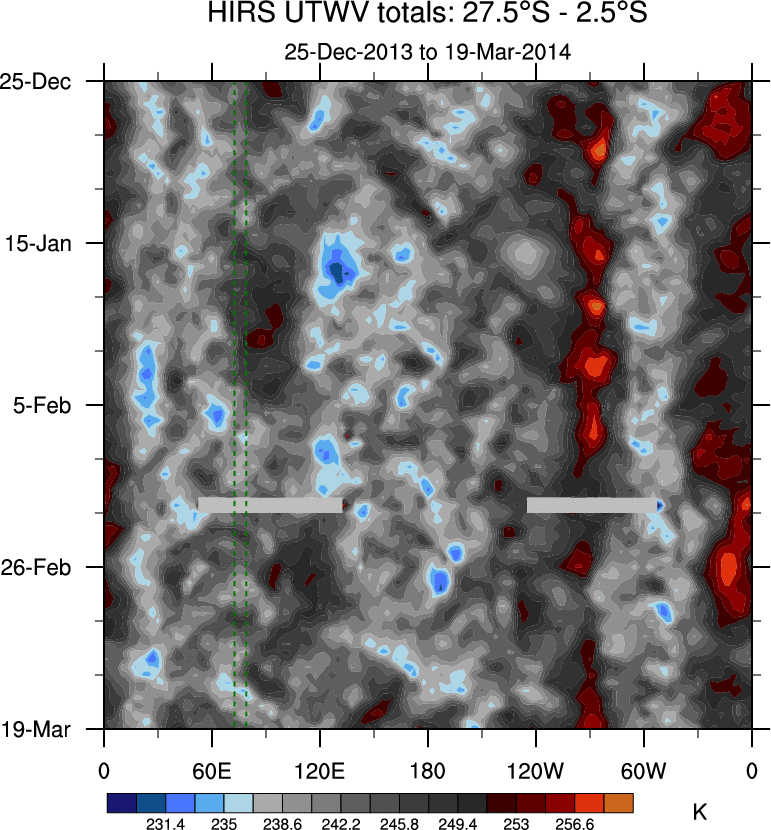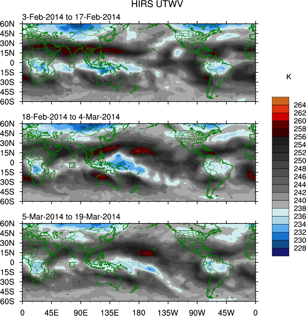 To identify tropical waves in near real-time, the OLR and UTWV data are filtered following Wheeler & Weickmann (2001 MWR). The daily anomalies are calculated using the first 3 harmonics of the seasonal cycle for 1979–2009. Missing values are then filled using linear interpolation in space and time. The most recent 365 days of anomalies are padded with 659 days of zeroes, and the result is filtered for each wave type.