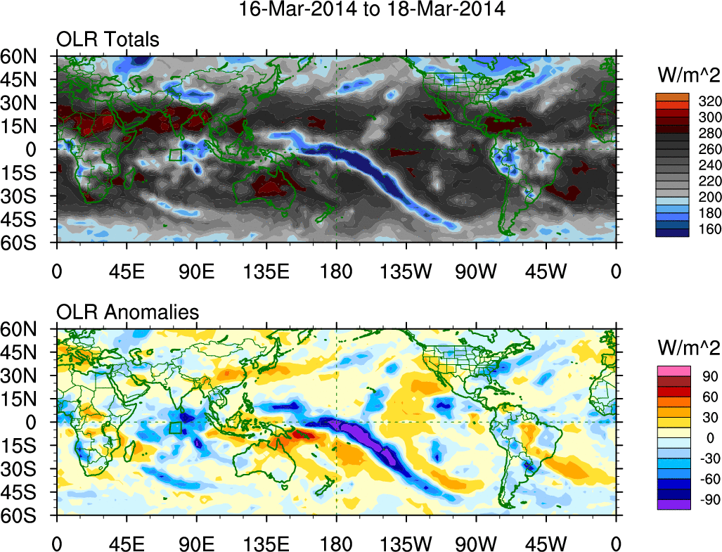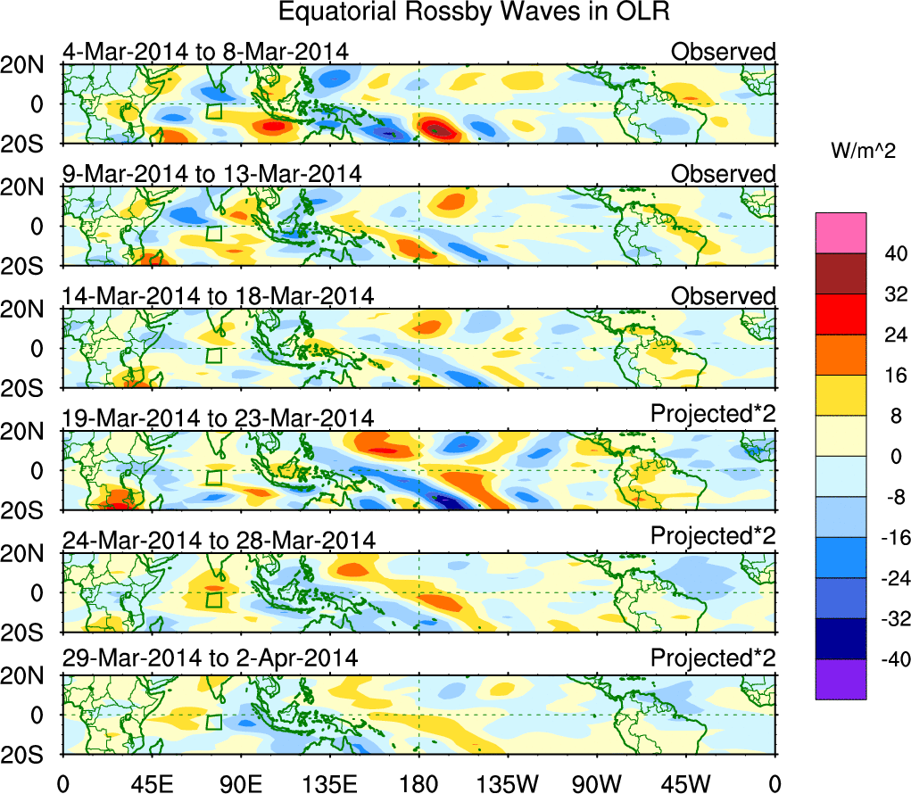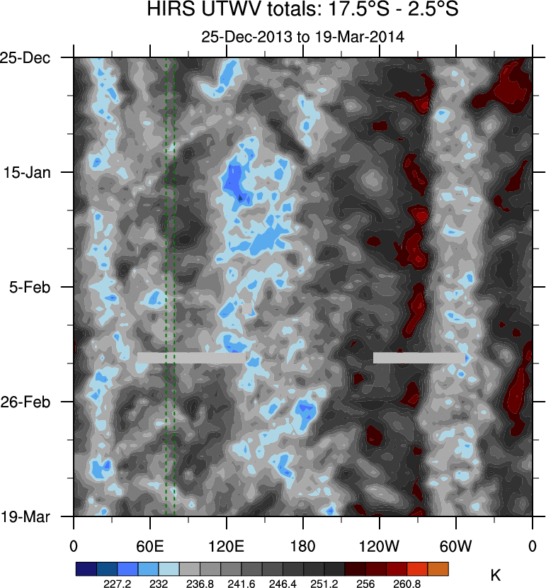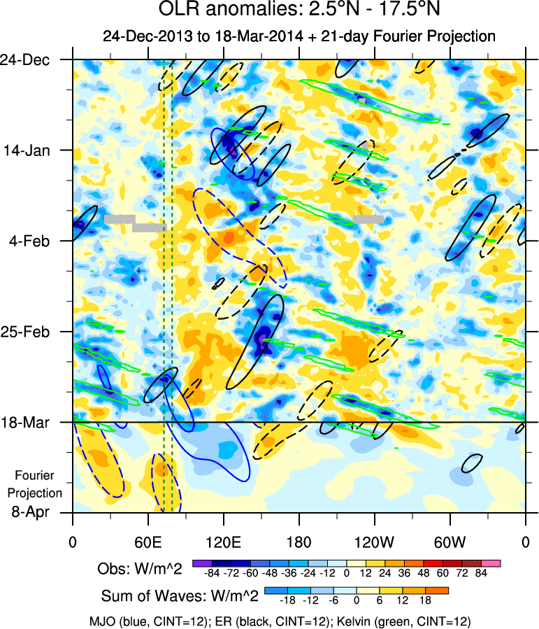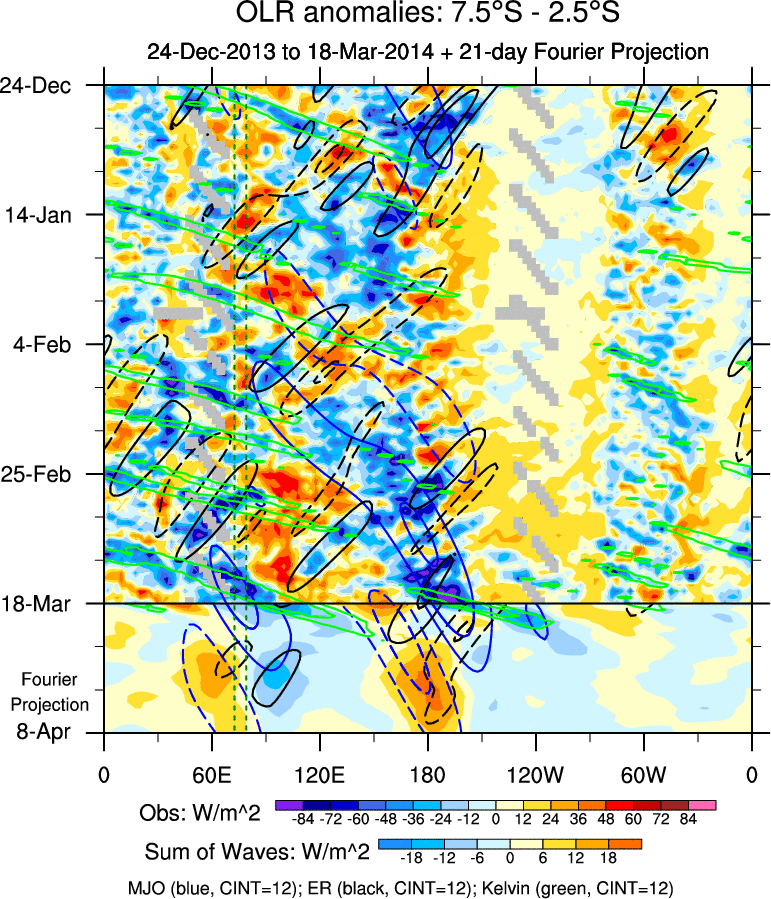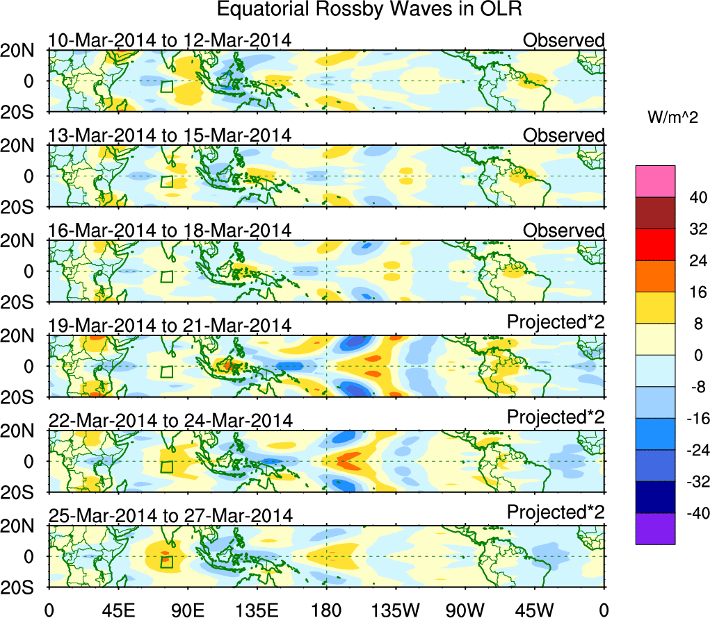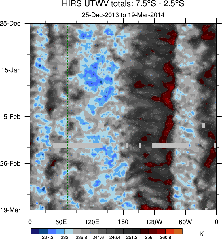 To identify tropical waves in near real-time, the OLR and UTWV data are filtered following Wheeler & Weickmann (2001 MWR). The daily anomalies are calculated using the first 3 harmonics of the seasonal cycle for 1979–2009. Missing values are then filled using linear interpolation in space and time. The most recent 365 days of anomalies are padded with 659 days of zeroes, and the result is filtered for each wave type.