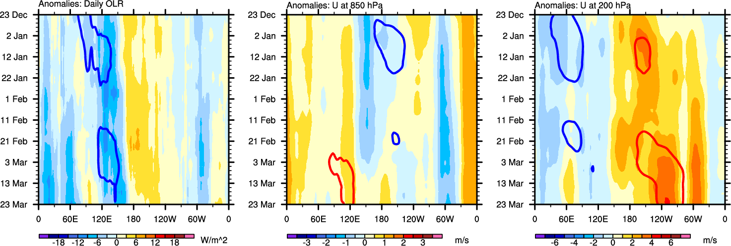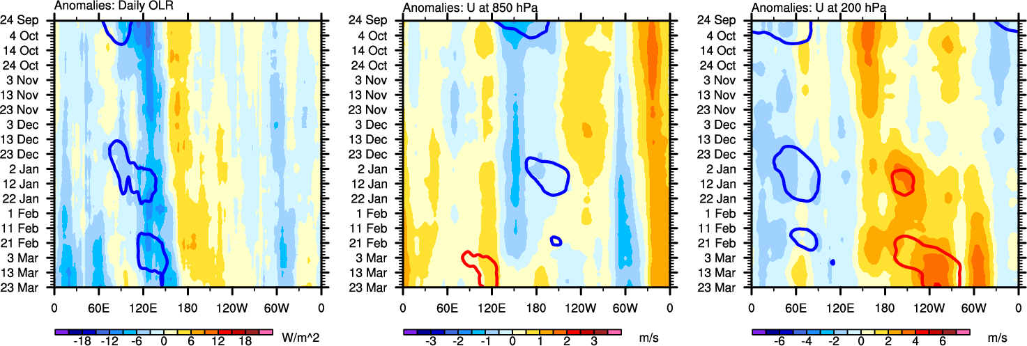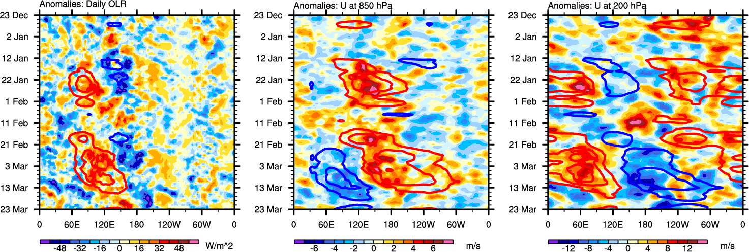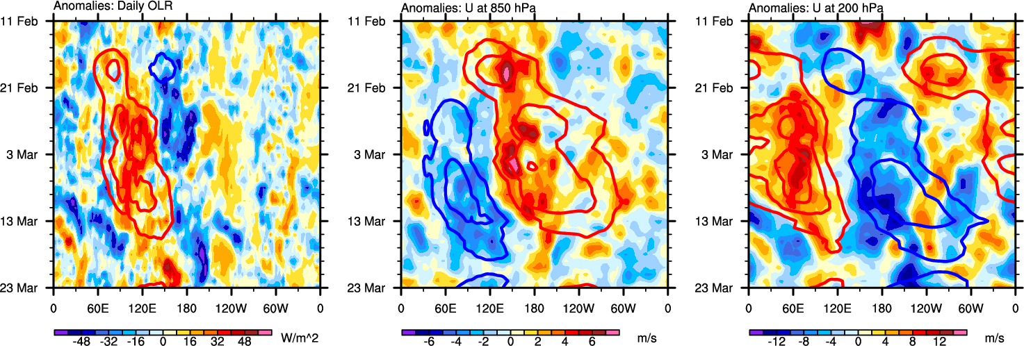 The Hovmollers show longitude-time plots for OLR, U-850, and U-200. The shading indicates the observed anomalies, while the contours are the projection of those anomalies onto the RMM EOFs.
