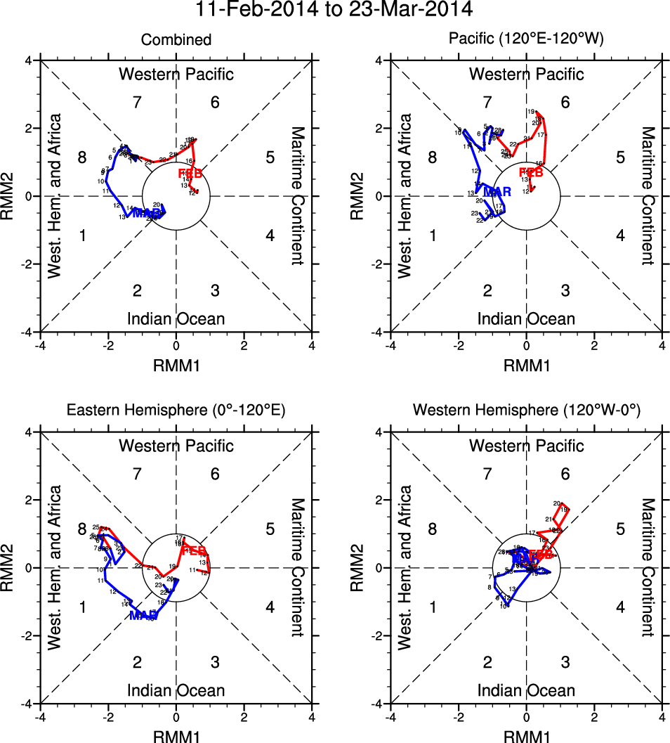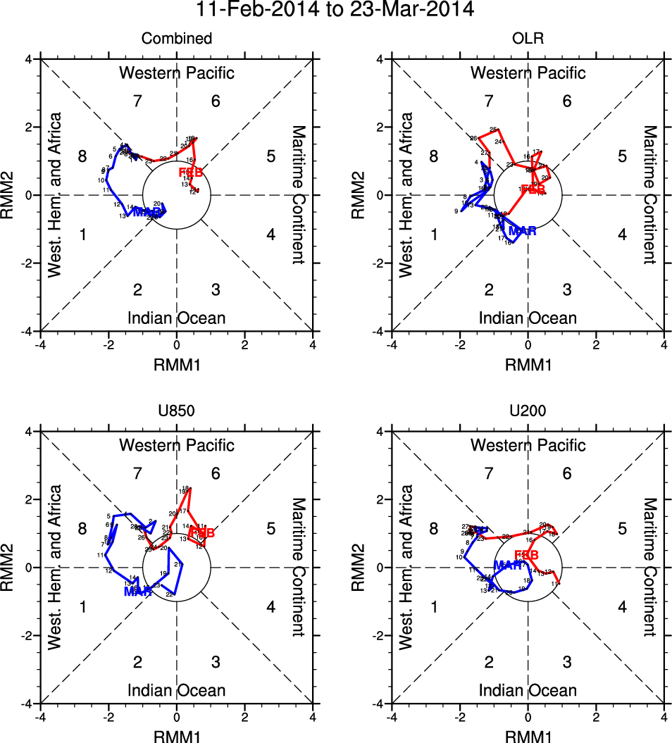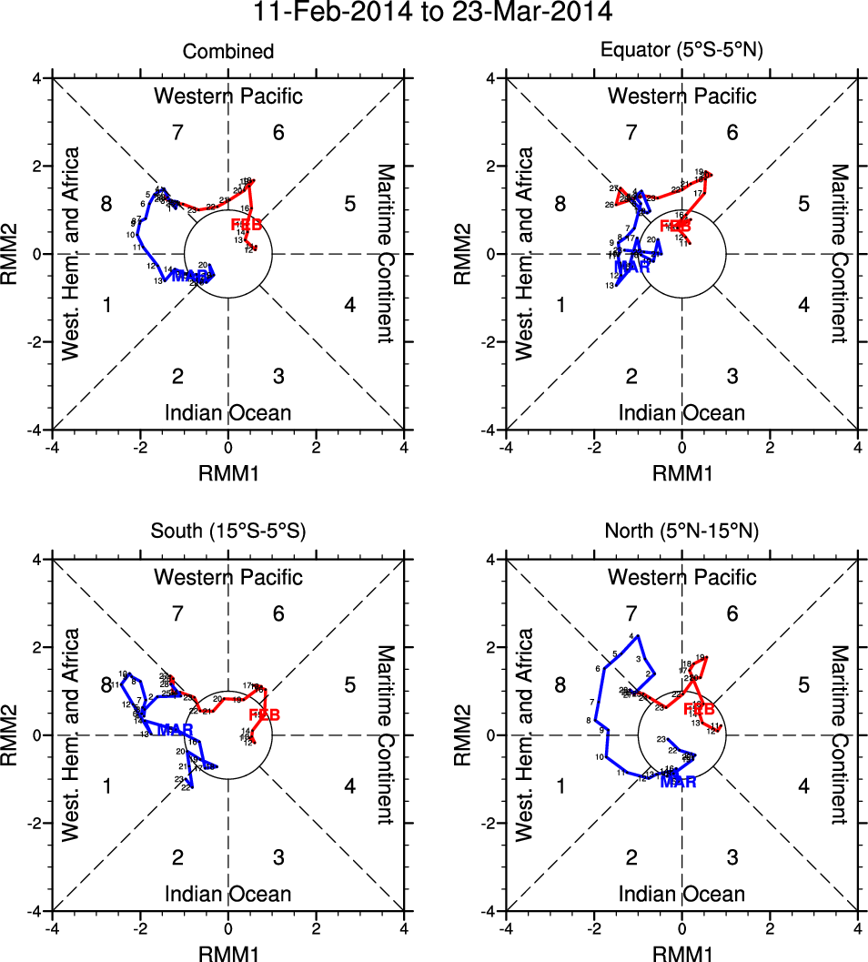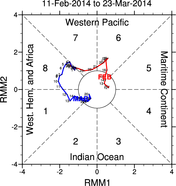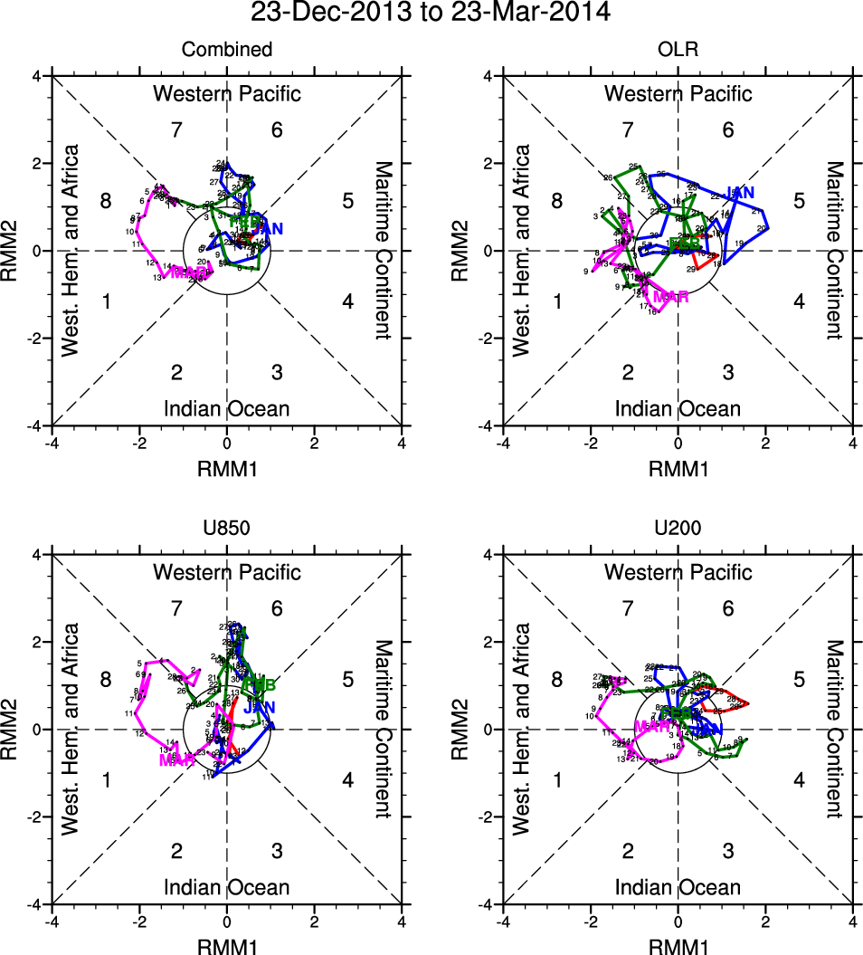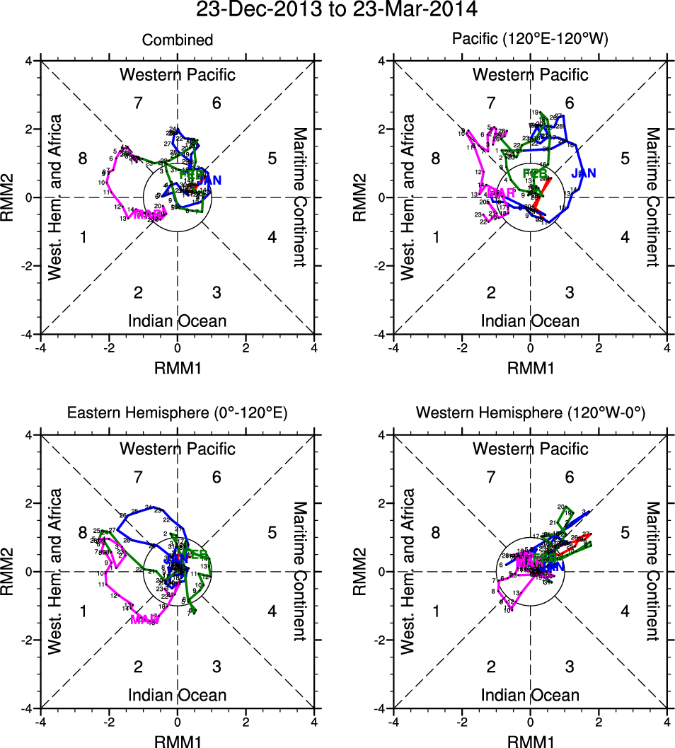 Wheeler and Hendon (2004) constructed the RMM index for monitoring the MJO. This index consists of the first two principal components (PCs) of OLR, 850-hPa zonal wind, and 200-hPa zonal wind averaged 15S-15N.
