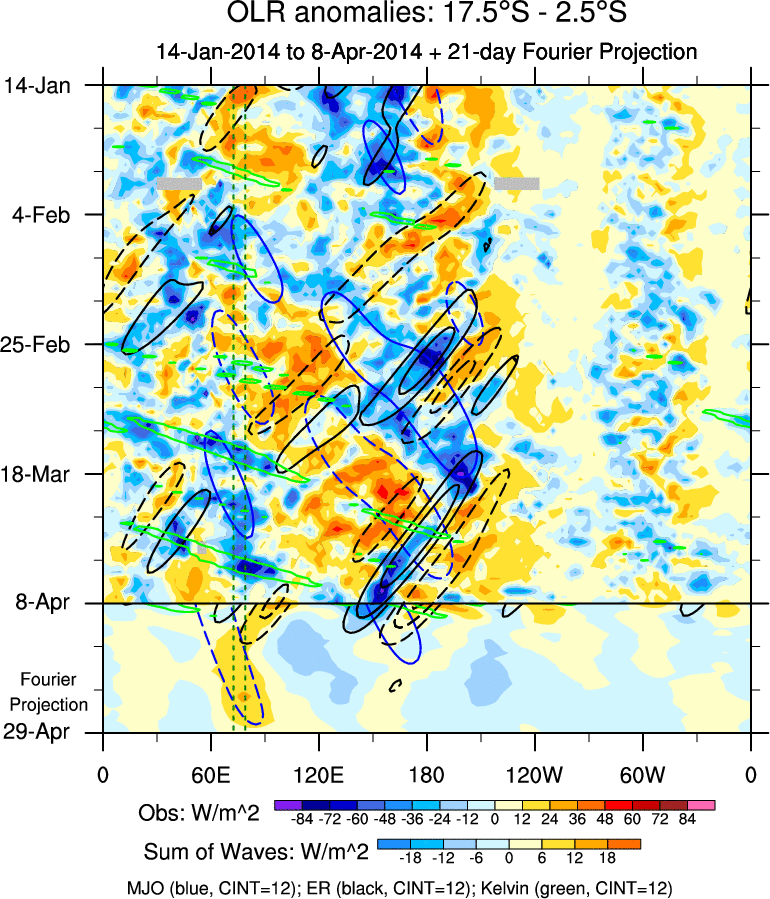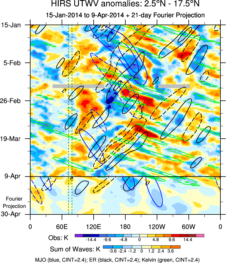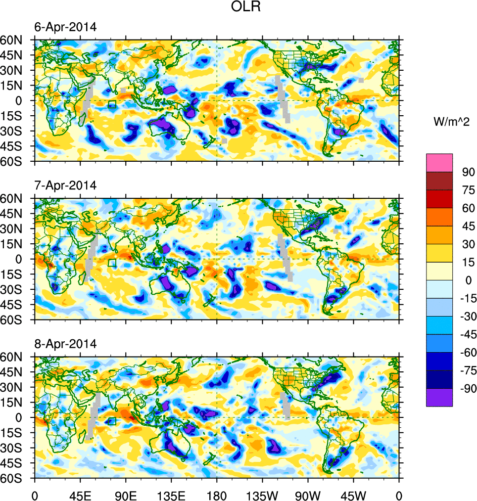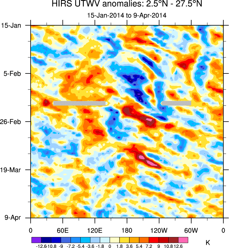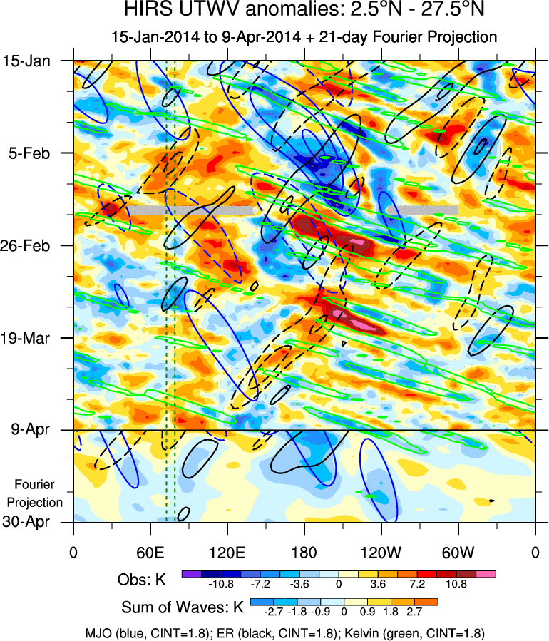 To identify tropical waves in near real-time, the OLR and UTWV data are filtered following Wheeler & Weickmann (2001 MWR). The daily anomalies are calculated using the first 3 harmonics of the seasonal cycle for 1979–2009. Missing values are then filled using linear interpolation in space and time. The most recent 365 days of anomalies are padded with 659 days of zeroes, and the result is filtered for each wave type.