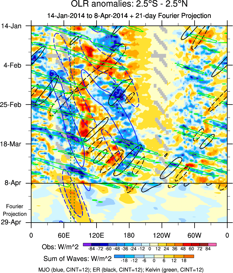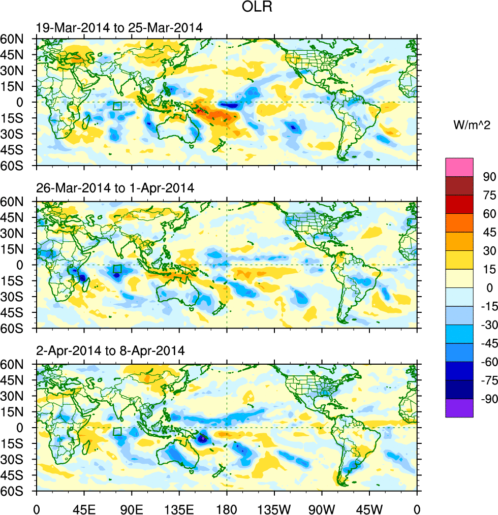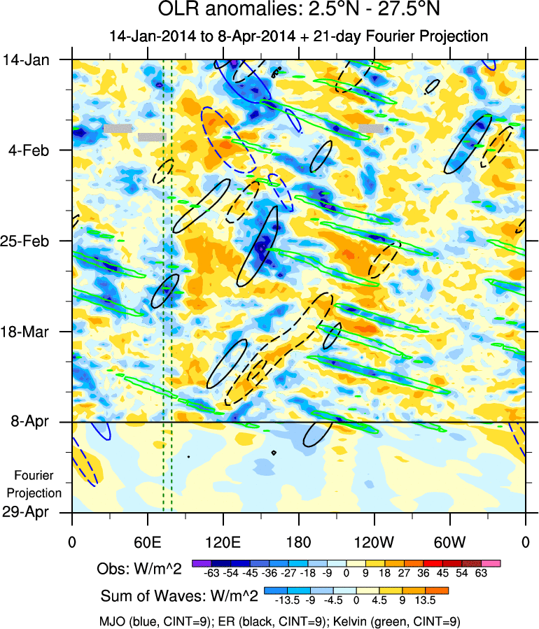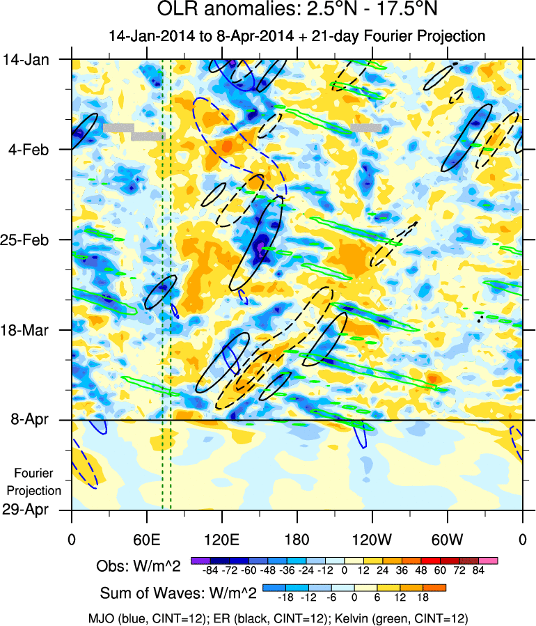 To identify tropical waves in near real-time, the OLR and UTWV data are filtered following Wheeler & Weickmann (2001 MWR). The daily anomalies are calculated using the first 3 harmonics of the seasonal cycle for 1979–2009. Missing values are then filled using linear interpolation in space and time. The most recent 365 days of anomalies are padded with 659 days of zeroes, and the result is filtered for each wave type.