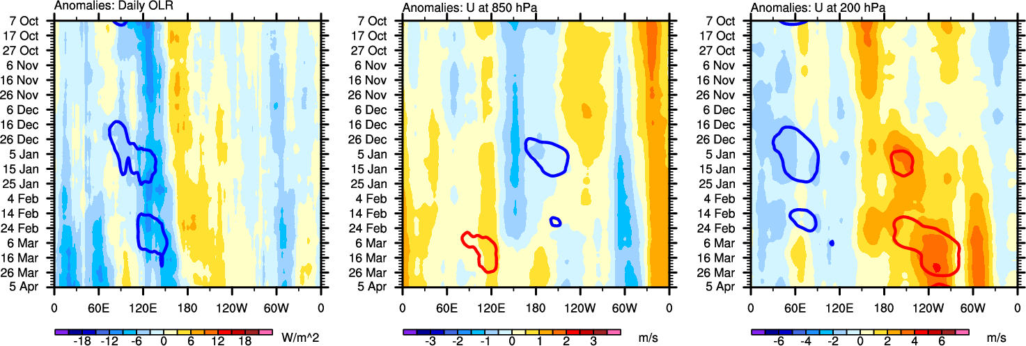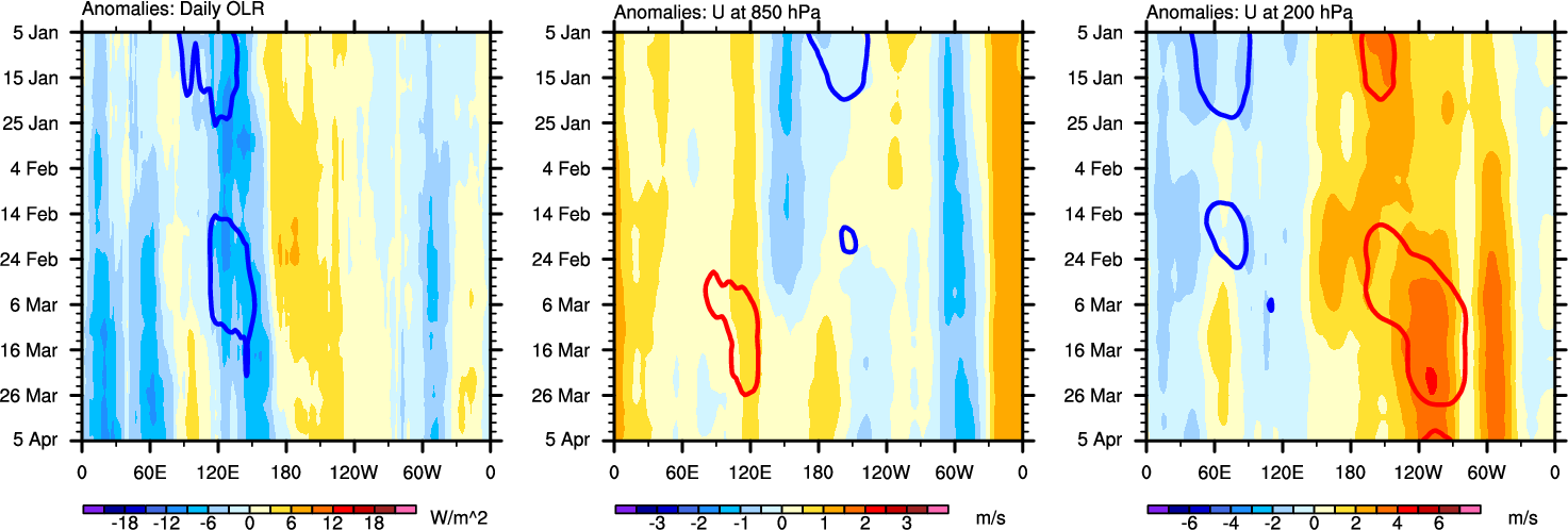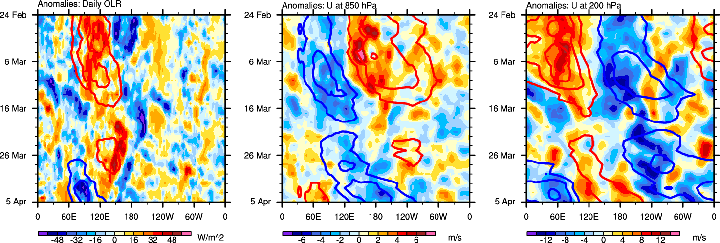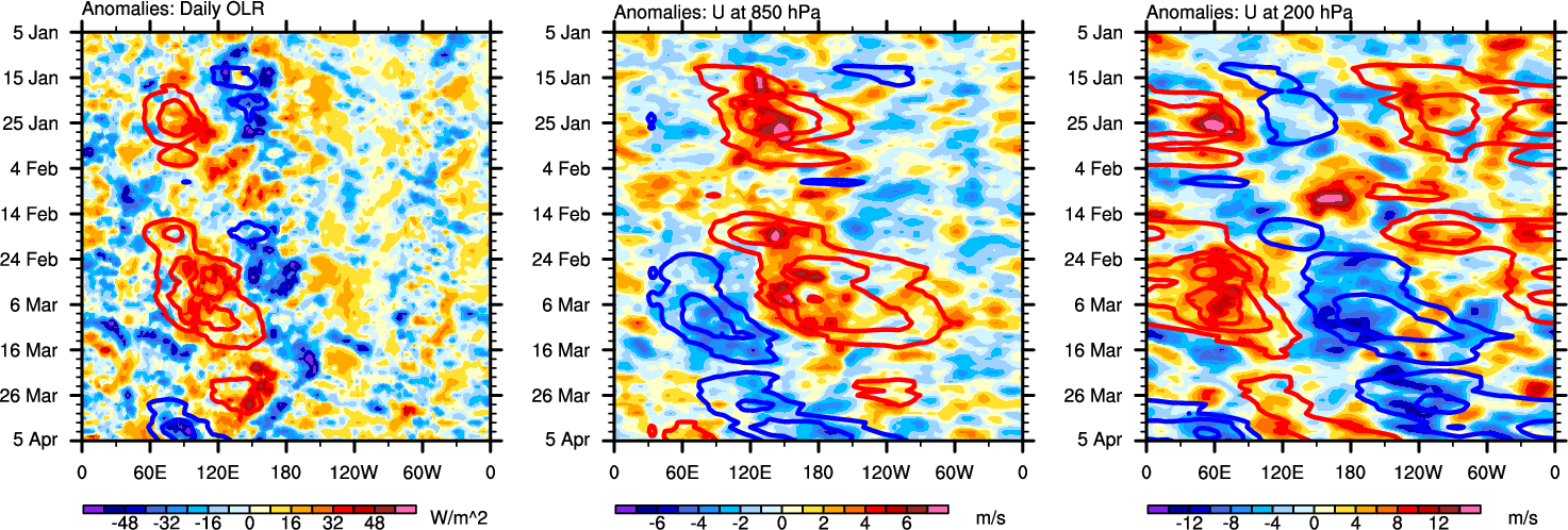 The Hovmollers show longitude-time plots for OLR, U-850, and U-200. The shading indicates the observed anomalies, while the contours are the projection of those anomalies onto the RMM EOFs.